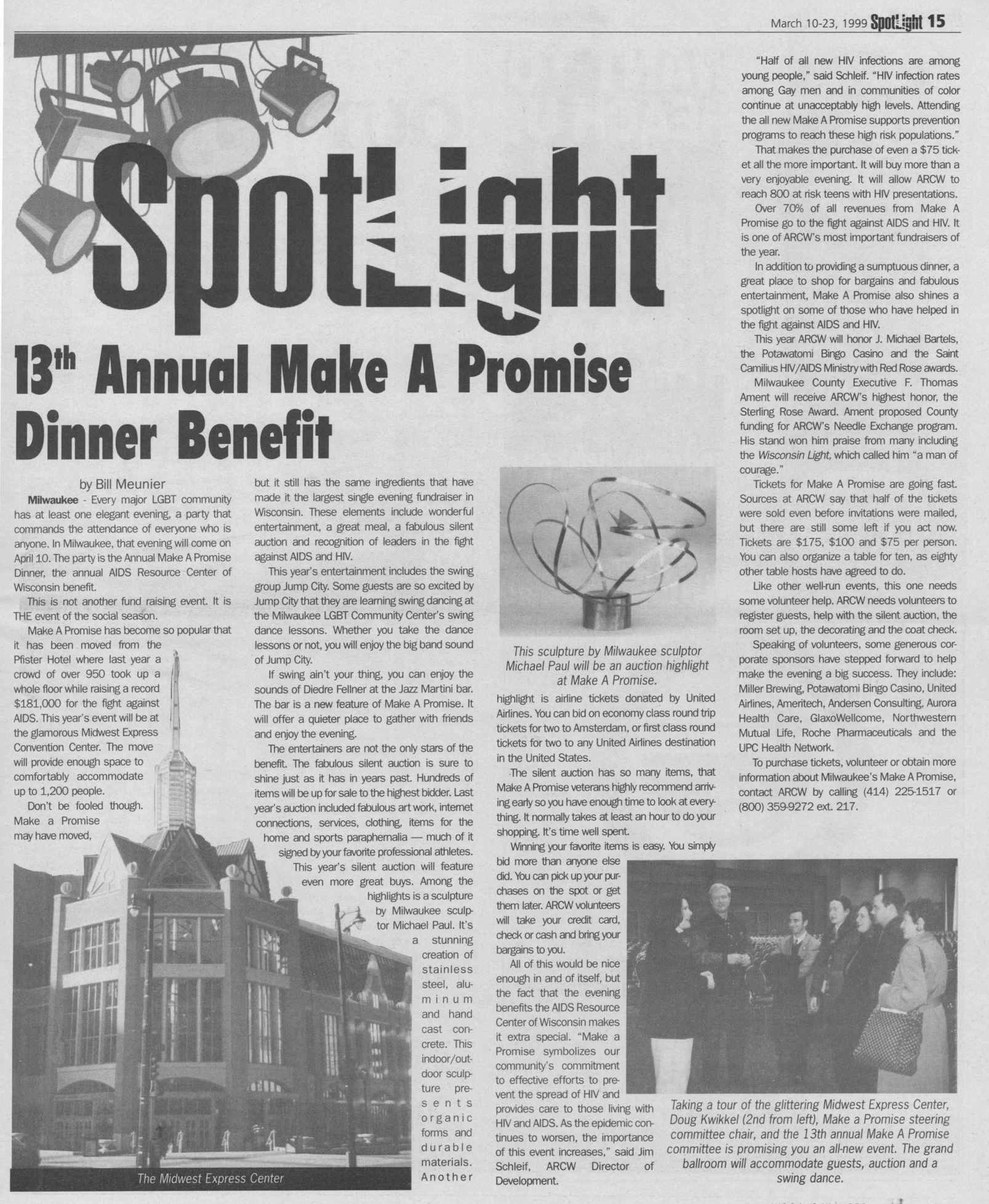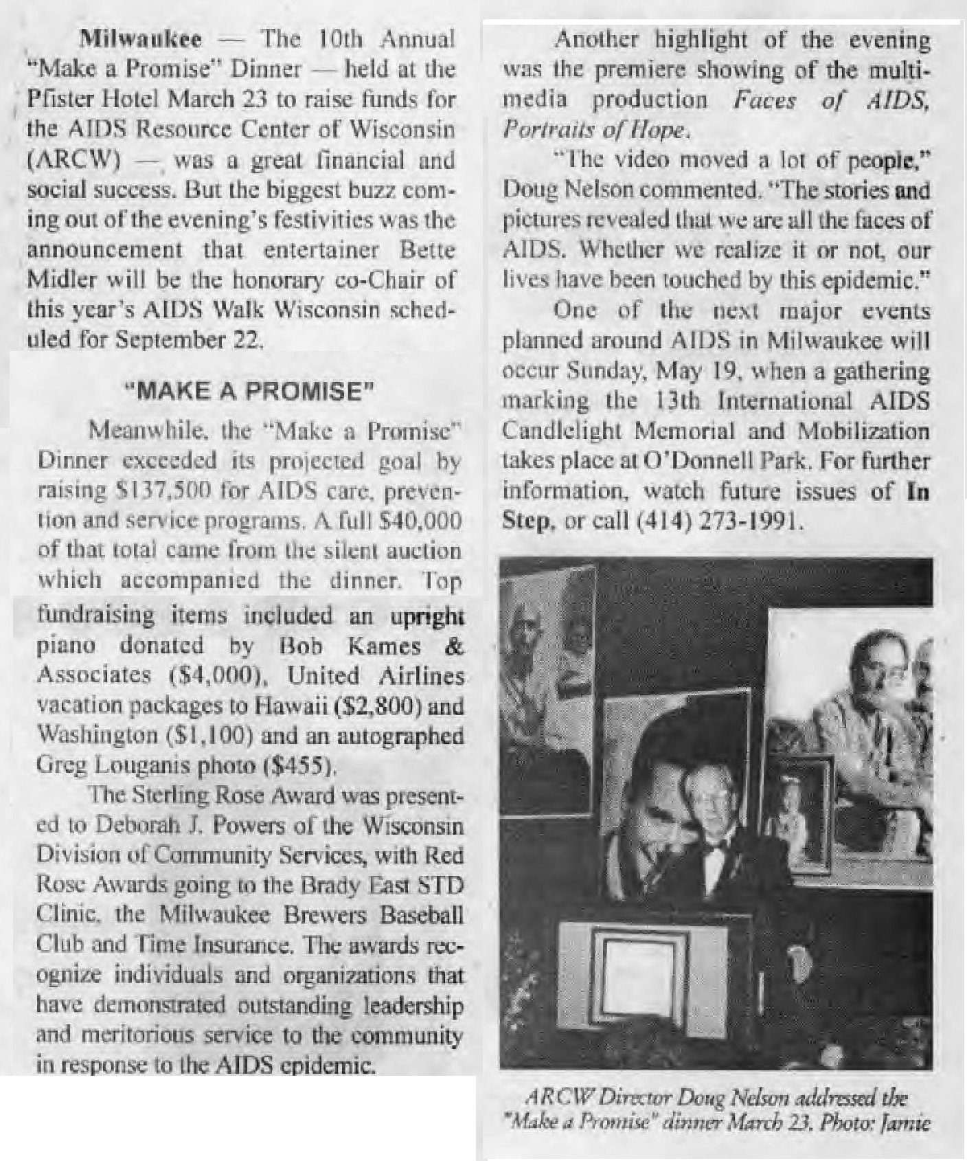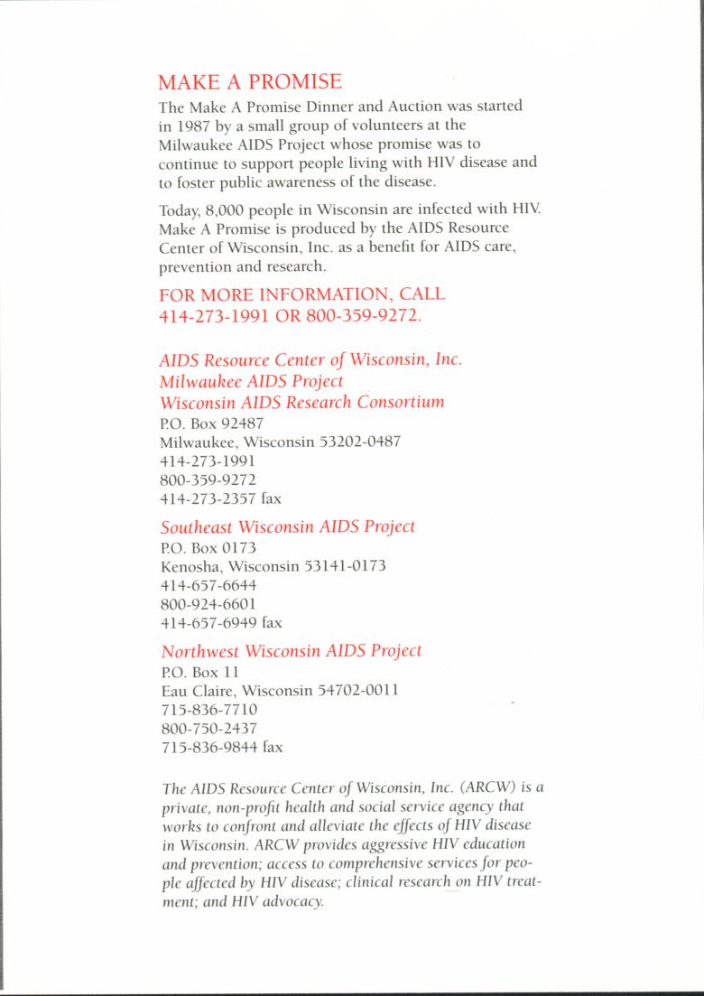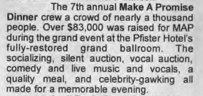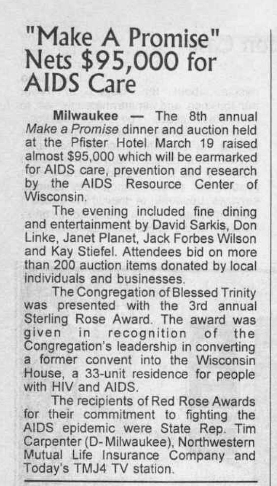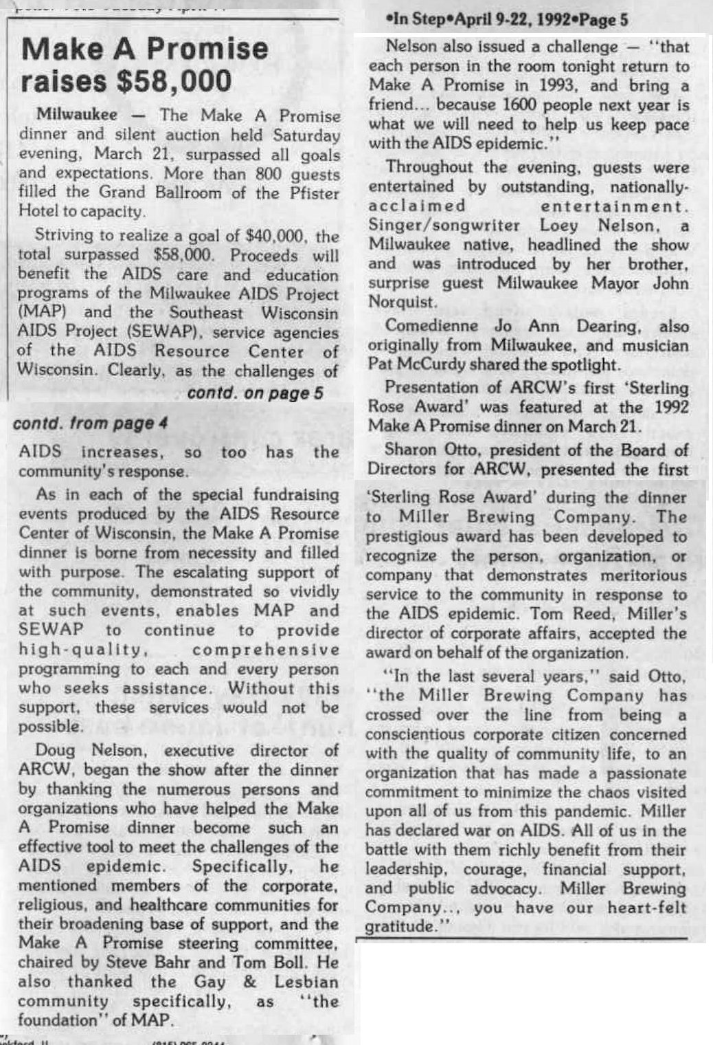 Later in 1986, there was a planning meeting around the big dining room table at the MAP office, including (by some recollections) Tom Boll, Steve Bahr, likely Steve Steinhauer and John Luedtke, and probably a few others. It was decided to hold a formal dinner and fundraiser called 'Make a Promise', to share the 'MAP' acronym of the parent agency, the 'Milwaukee AIDS Project'. The planning meetings resulted in a dinner and show held at the Wisconsin Club, which is what is referred to as the first annual event called "Make a Promise". (Articles in 1991 and 1992 state that "Tom Boll... created the concept of Make A Promise".)