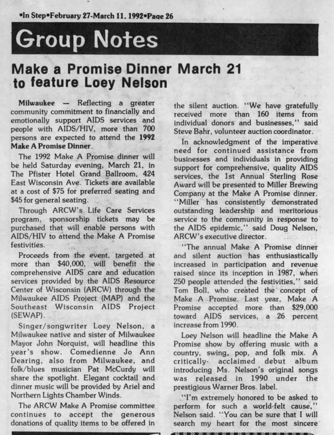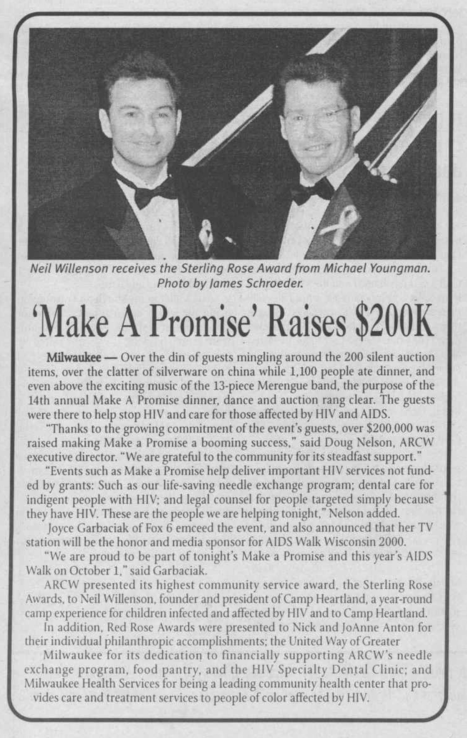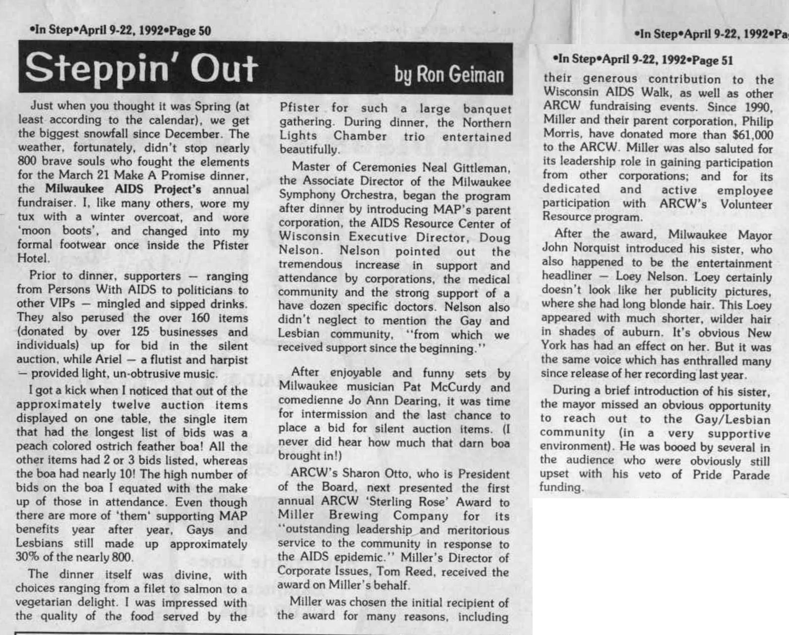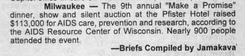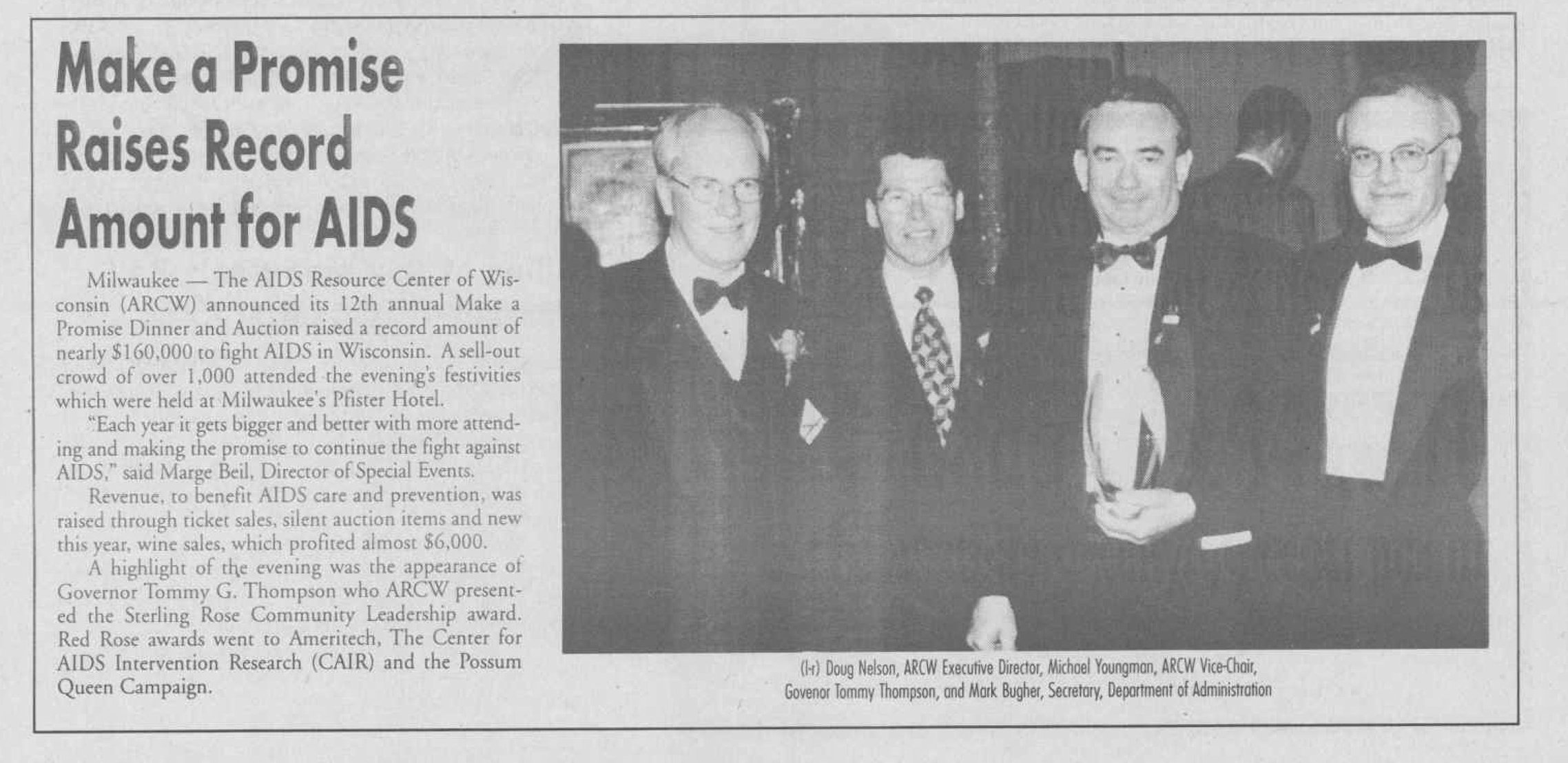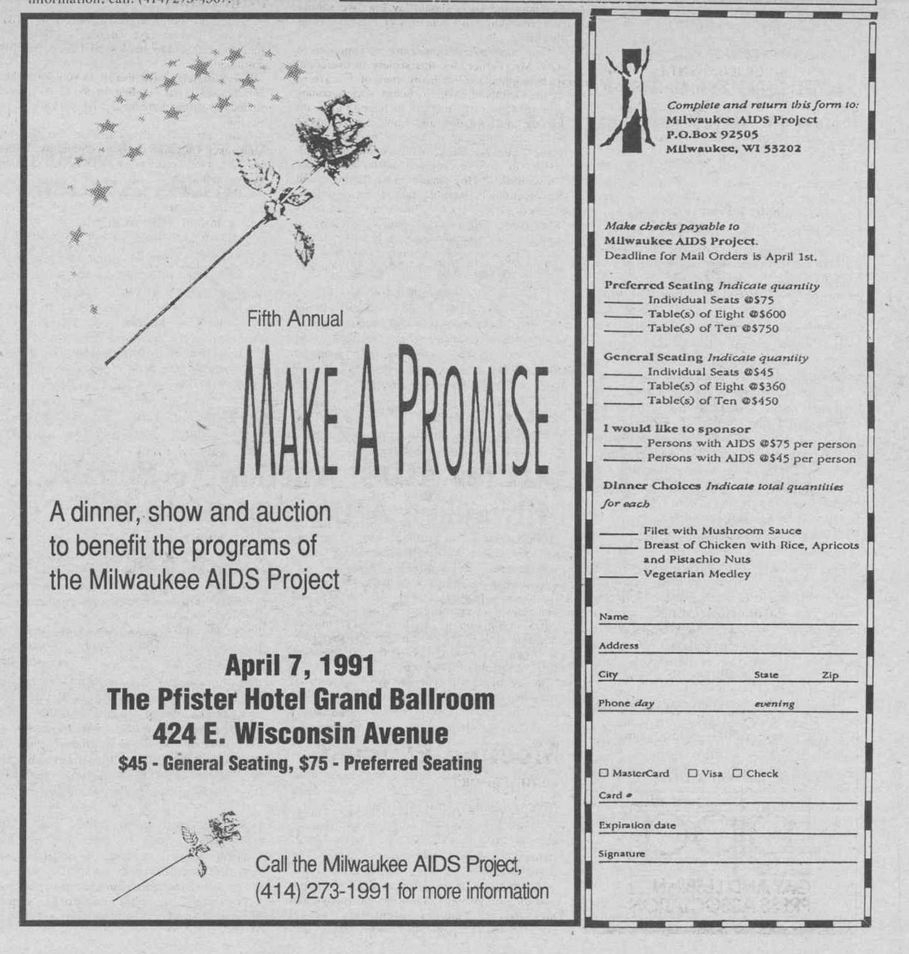 Later in 1986, there was a planning meeting around the big dining room table at the MAP office, including (by some recollections) Tom Boll, Steve Bahr, likely Steve Steinhauer and John Luedtke, and probably a few others. It was decided to hold a formal dinner and fundraiser called 'Make a Promise', to share the 'MAP' acronym of the parent agency, the 'Milwaukee AIDS Project'. The planning meetings resulted in a dinner and show held at the Wisconsin Club, which is what is referred to as the first annual event called "Make a Promise". (Articles in 1991 and 1992 state that "Tom Boll... created the concept of Make A Promise".)