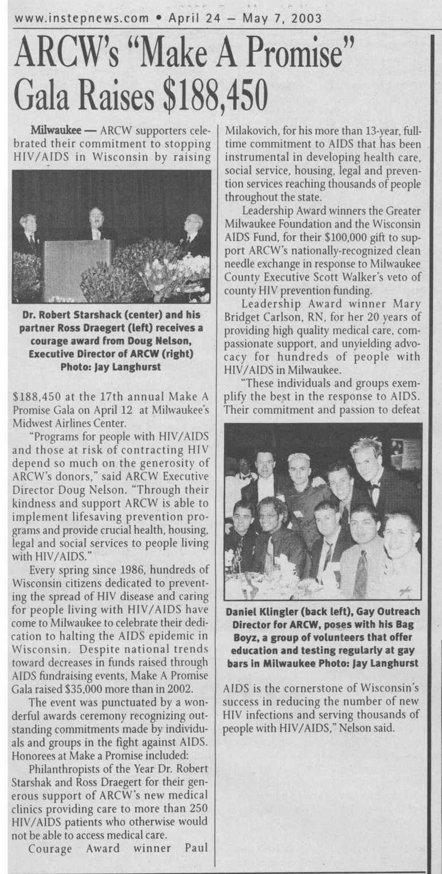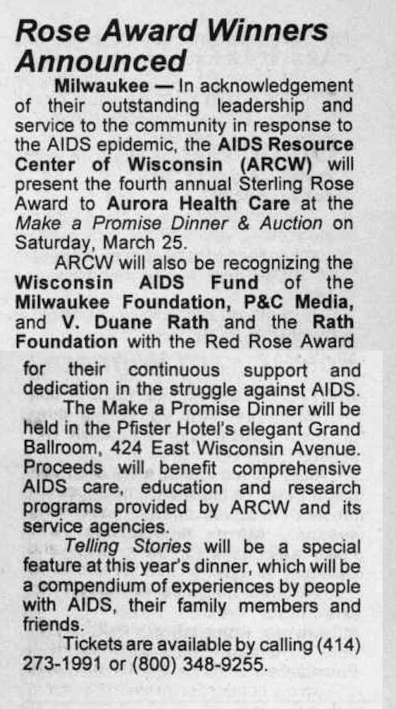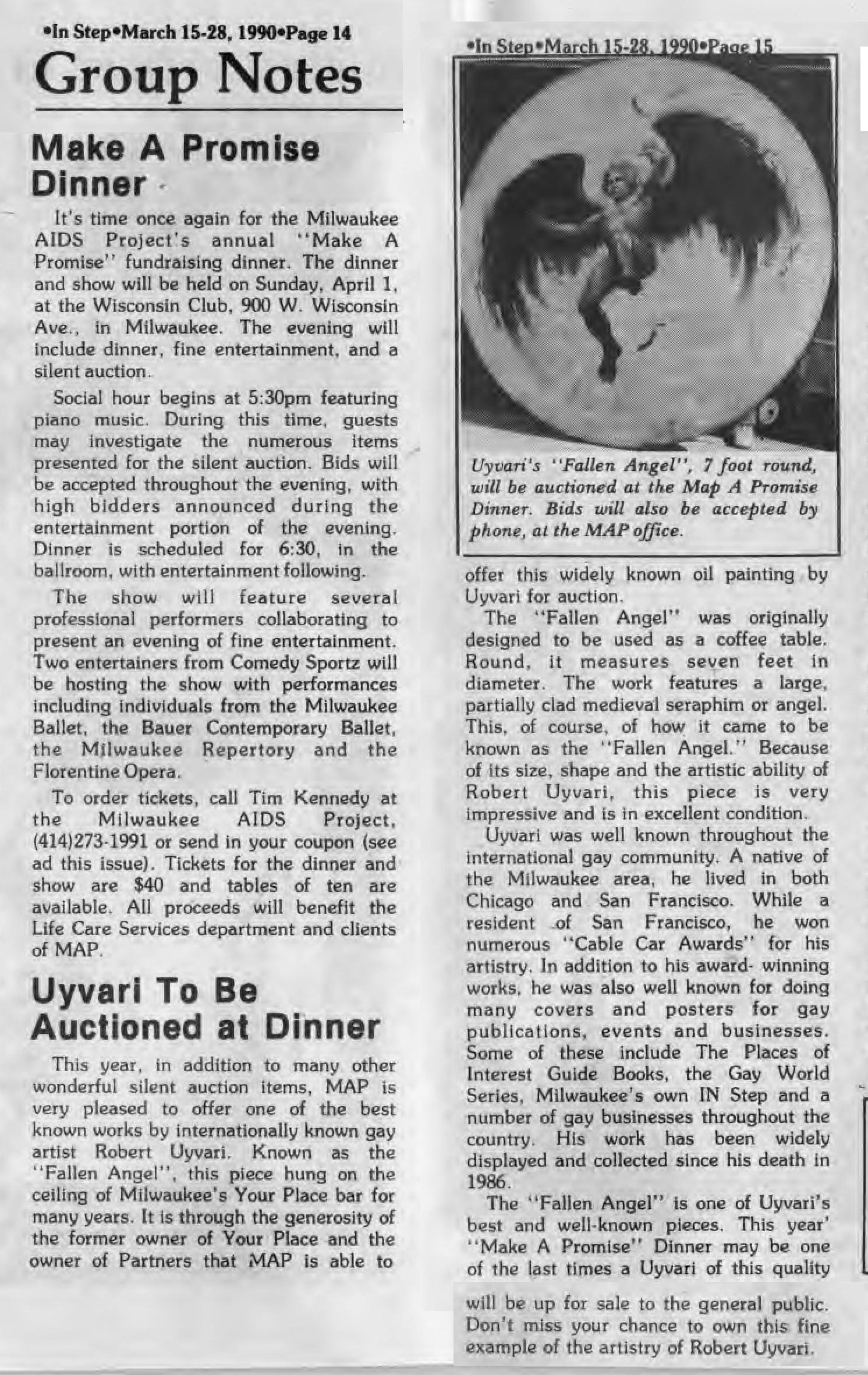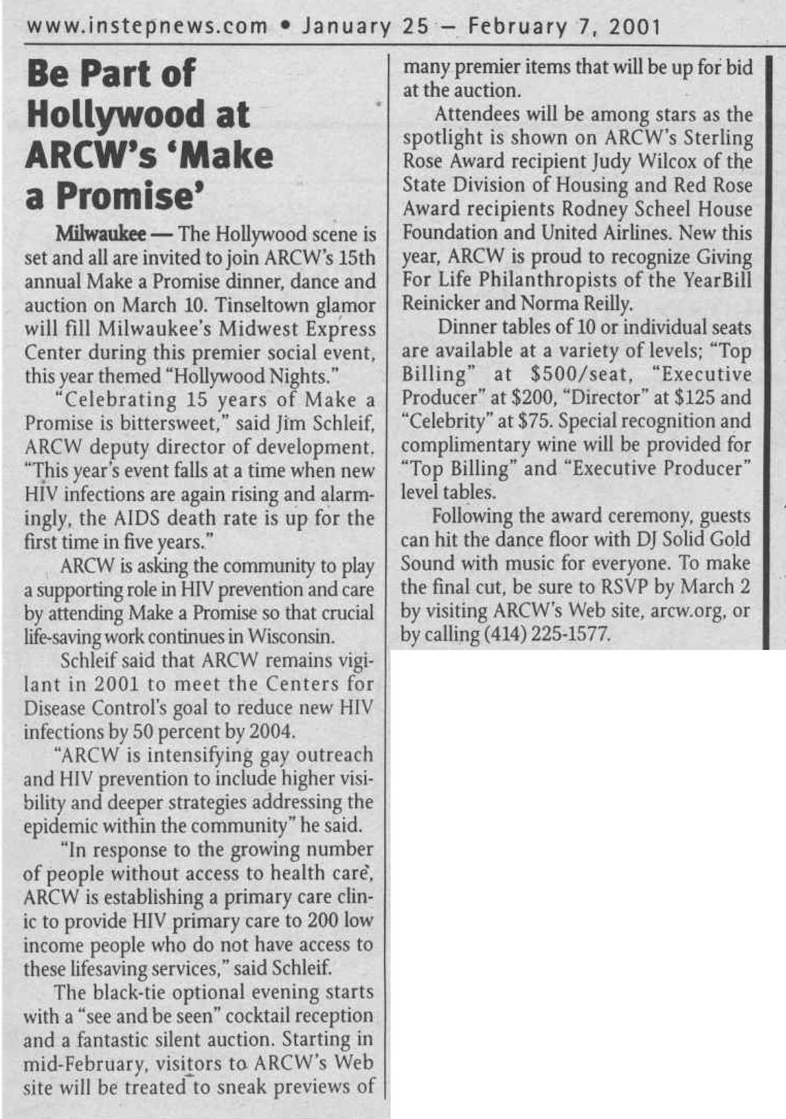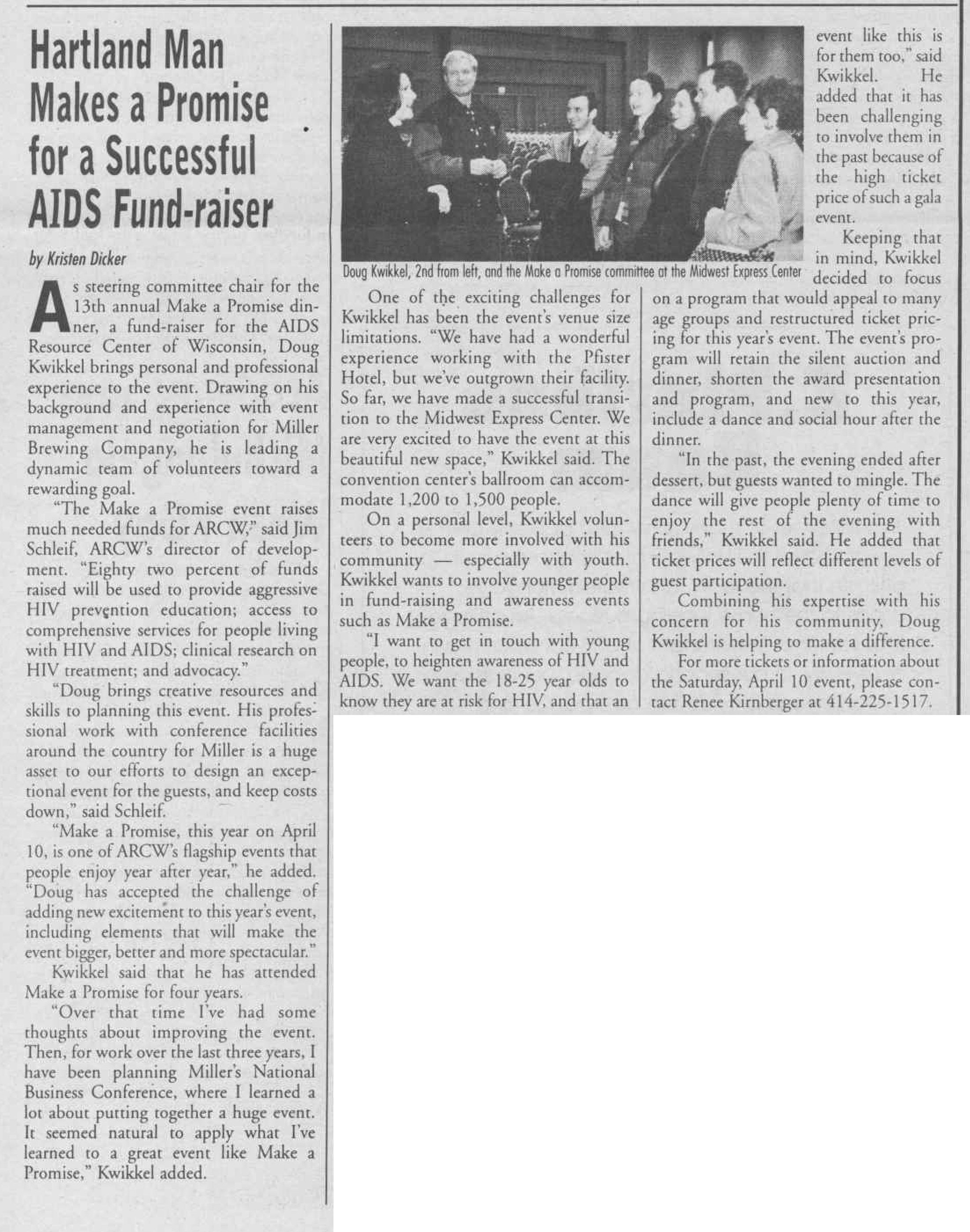 Later in 1986, there was a planning meeting around the big dining room table at the MAP office, including (by some recollections) Tom Boll, Steve Bahr, likely Steve Steinhauer and John Luedtke, and probably a few others. It was decided to hold a formal dinner and fundraiser called 'Make a Promise', to share the 'MAP' acronym of the parent agency, the 'Milwaukee AIDS Project'. The planning meetings resulted in a dinner and show held at the Wisconsin Club, which is what is referred to as the first annual event called "Make a Promise". (Articles in 1991 and 1992 state that "Tom Boll... created the concept of Make A Promise".)