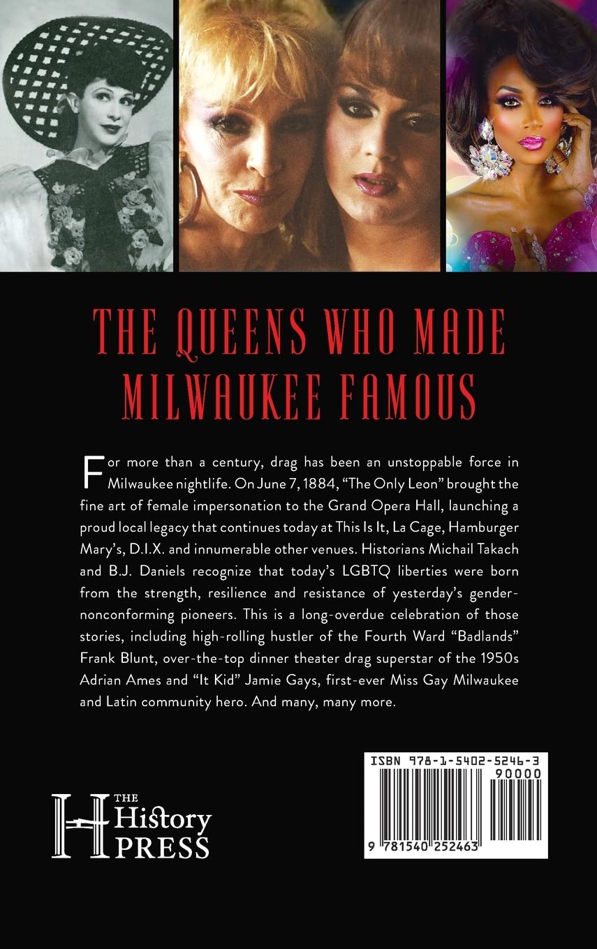 This book, published by American Heritage press, documents "The Queens that made Milwaukee famous". For over a century, drag has been an unstoppable force in Milwaukee nightlife. On June 7, 1884, "The Only Leon" brought the fine art of female impersonation to the Grand Opera Hall, launching a proud local legacy that continues today at This Is It, La Cage, Hamburger Mary's, D.I.X. and innumerable other venues. Historians Michail Takach and B.J. Daniels recognize that today's LGBTQ liberties were born from the strength, resilience and resistance of yesterday's gender-nonconforming pioneers. This is a long-overdue celebration of those stories, including high -rolling hustler of the Fourth Ward "Badlands" Frank Blunt, over-the-top dinner theater drag superstar of the 1950s Adrian Ames and "It Kid" Jamie Gays, first -ever Miss Gay Milwaukee and Latin community hero. And many, many more. This history is examined by authors LGBT historian Michail Takach in his second book, and legendary performer B.J. Daniels in her first.