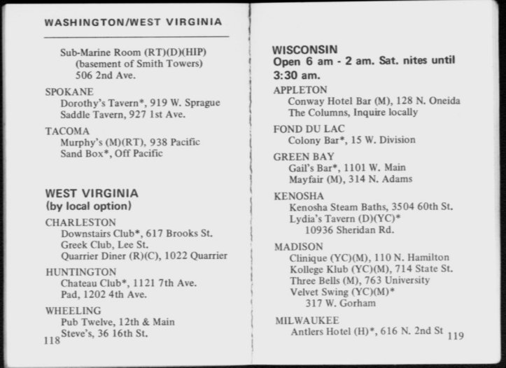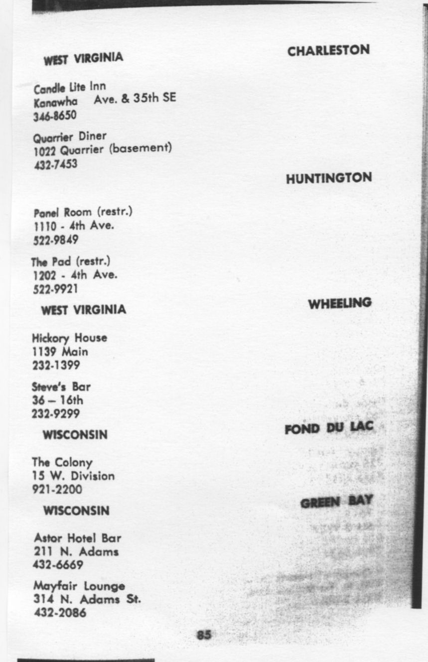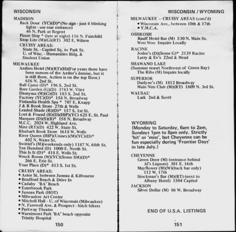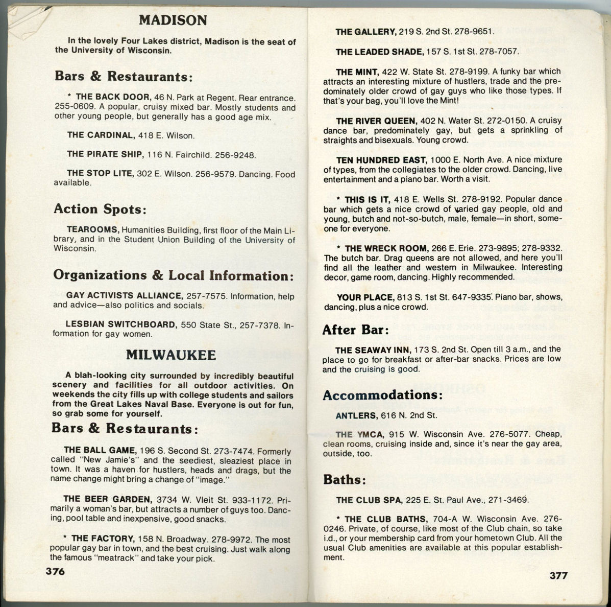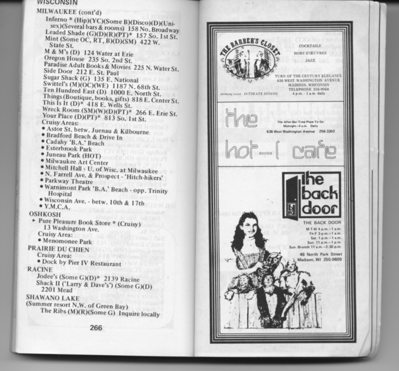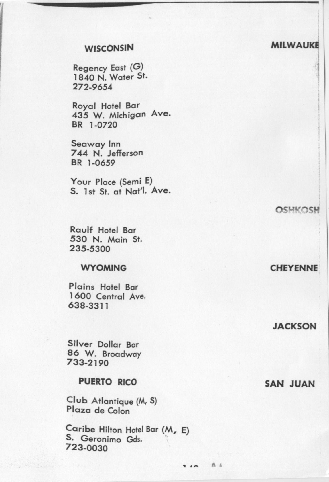(Only part of the first issue of this locally/ Milwaukee-produced publication has been located, and only the inside pages: pages 1 thru 6 and 35-40 are missing; but the section that survives provides a rare glimpse of the city's gay life at that time: an accurate local listing of organizations and businesses, informational text about many of the bars, plus rare photos of the interiors of many bars. Additional issues anyone is able to locate are welcome!)