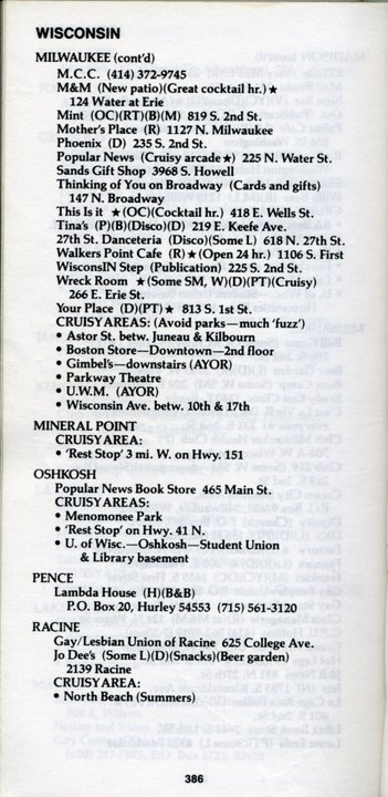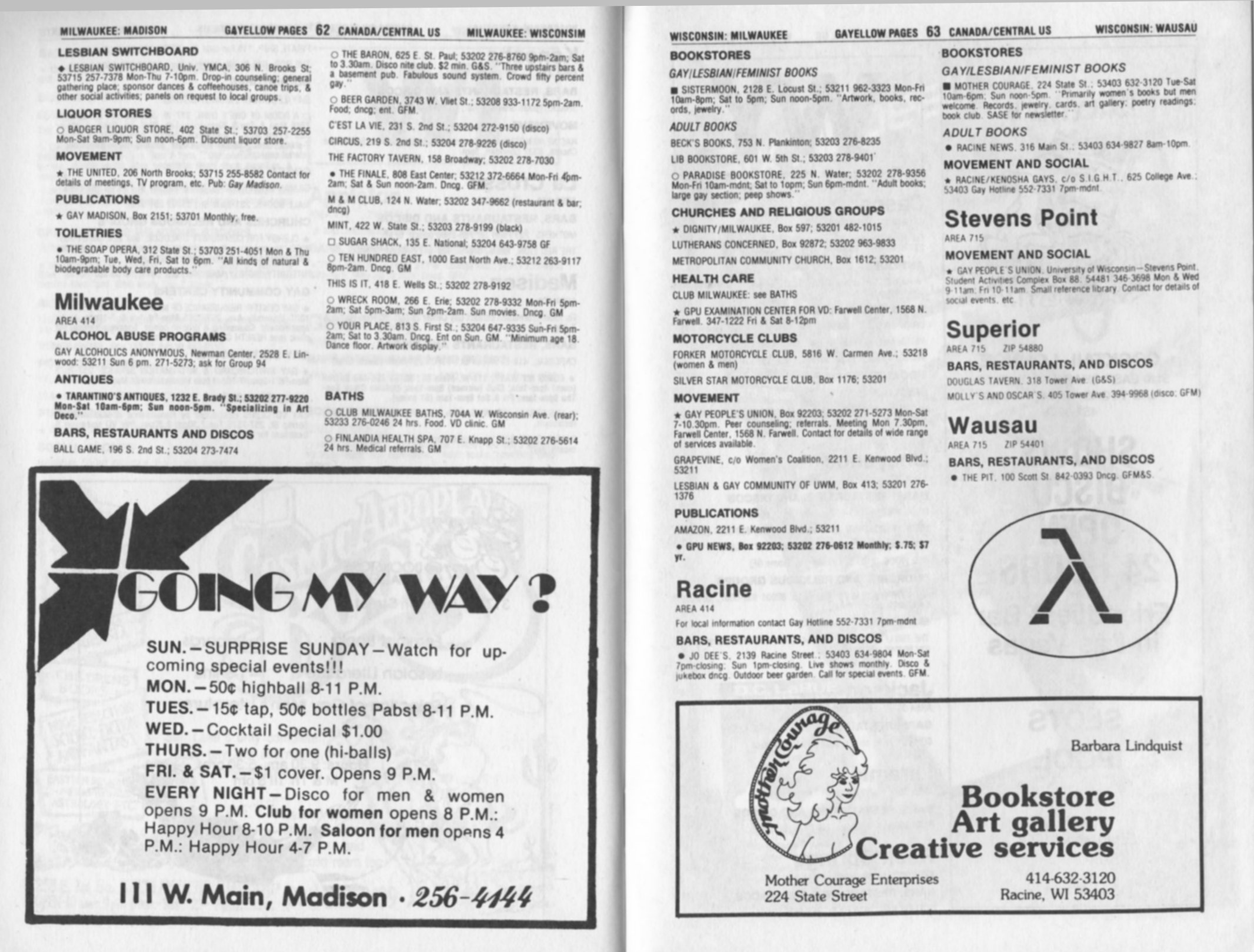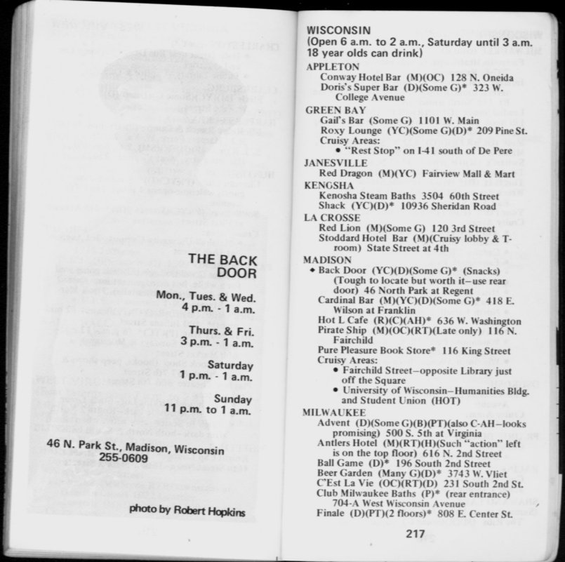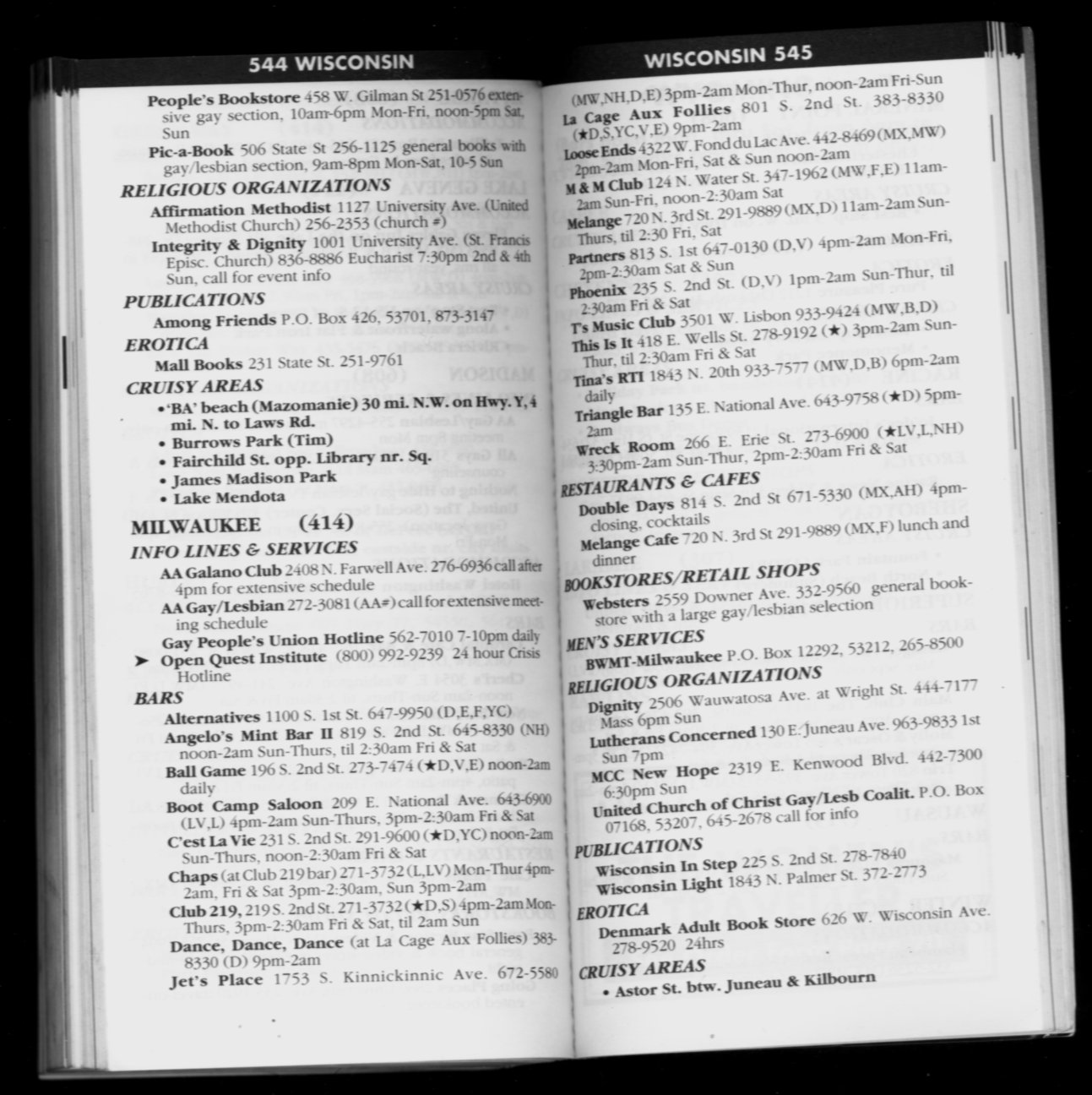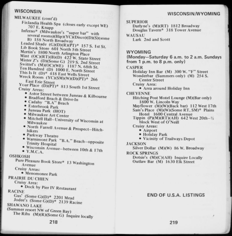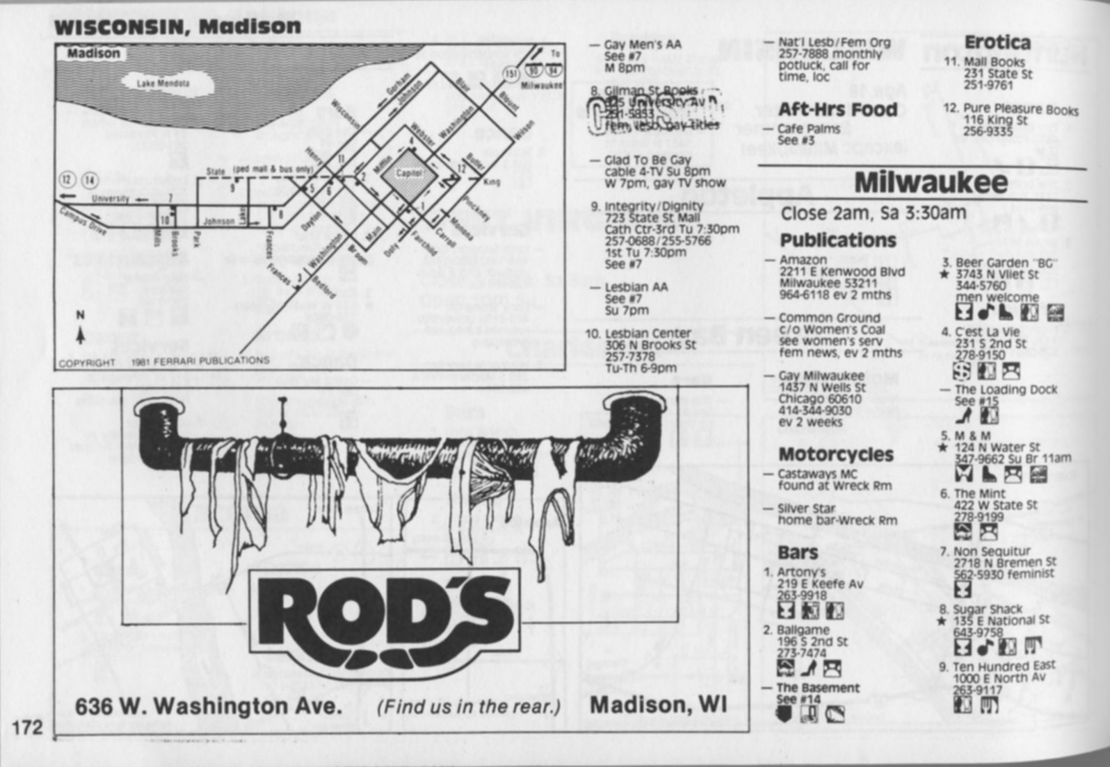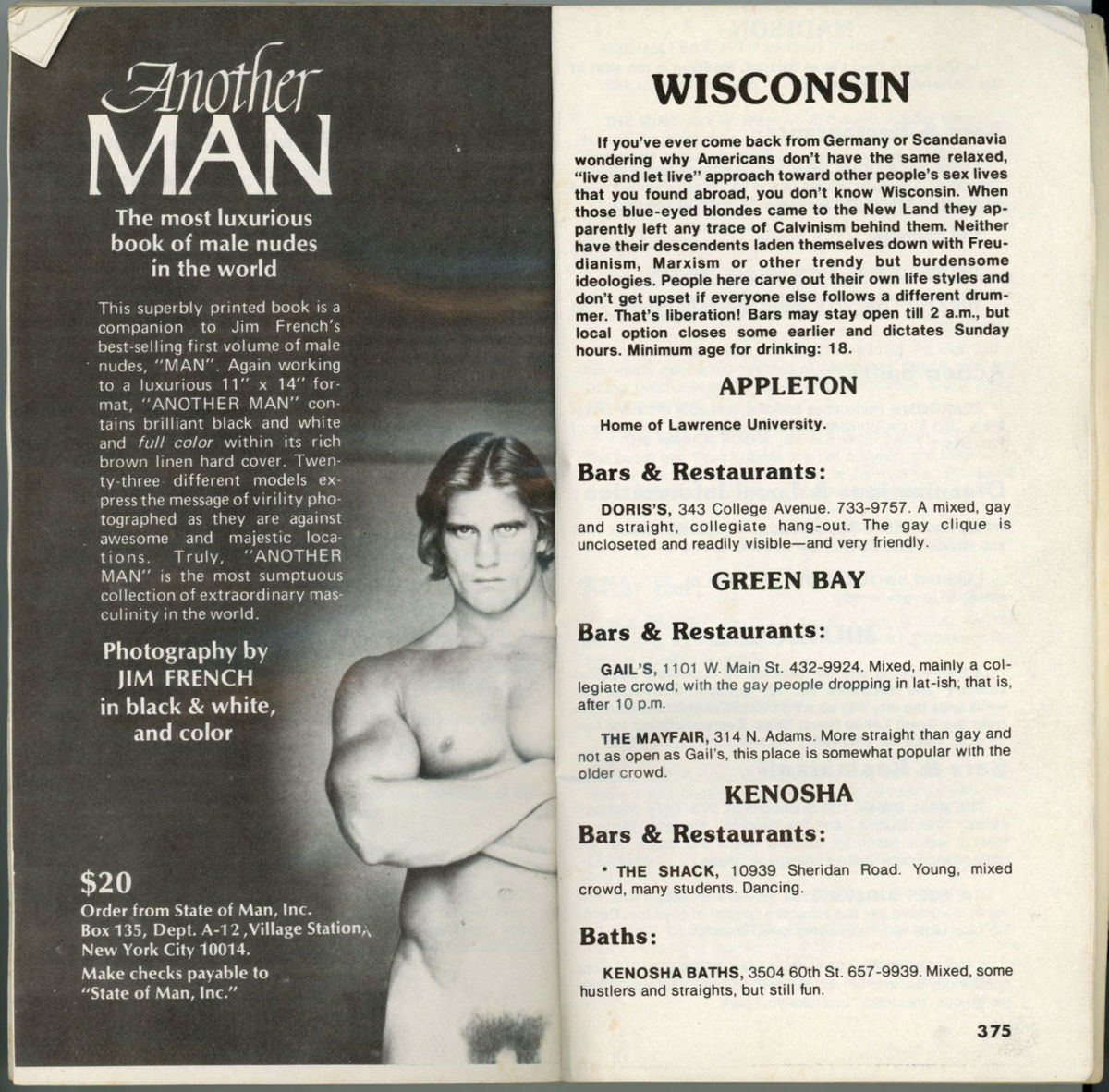 (Only part of the first issue of this locally/ Milwaukee-produced publication has been located, and only the inside pages: pages 1 thru 6 and 35-40 are missing; but the section that survives provides a rare glimpse of the city's gay life at that time: an accurate local listing of organizations and businesses, informational text about many of the bars, plus rare photos of the interiors of many bars. Additional issues anyone is able to locate are welcome!)