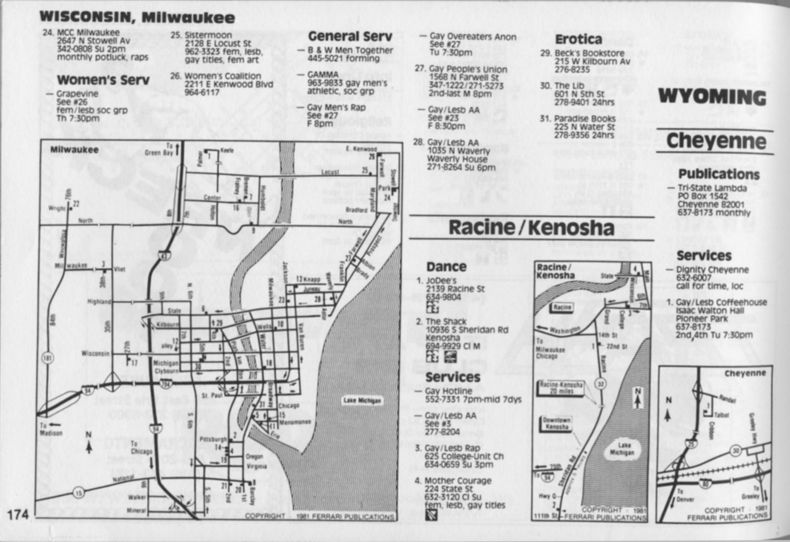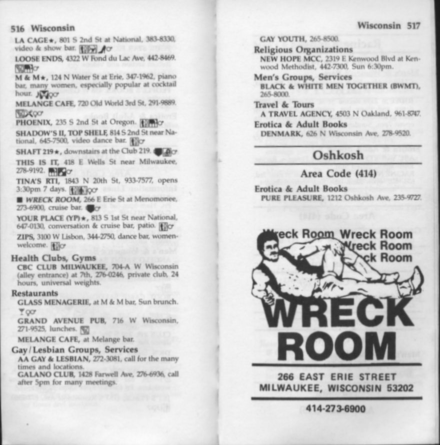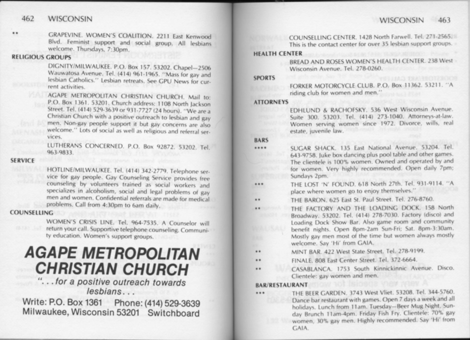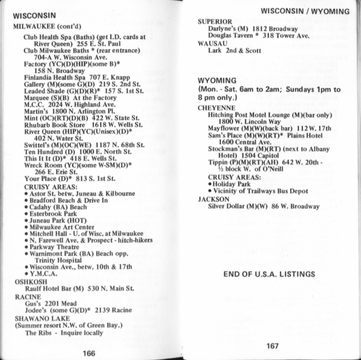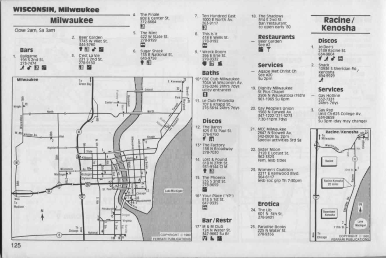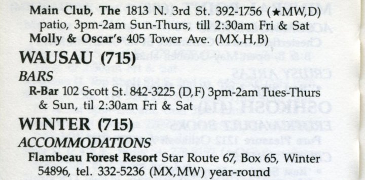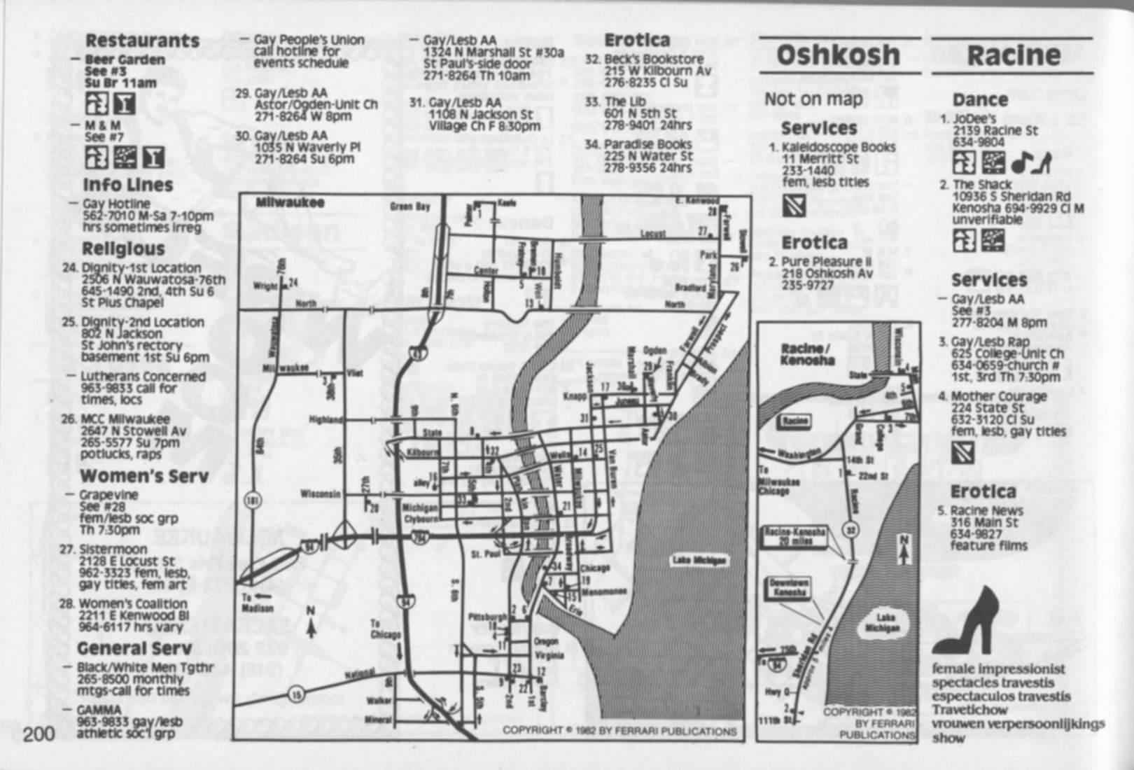(Only part of the first issue of this locally/ Milwaukee-produced publication has been located, and only the inside pages: pages 1 thru 6 and 35-40 are missing; but the section that survives provides a rare glimpse of the city's gay life at that time: an accurate local listing of organizations and businesses, informational text about many of the bars, plus rare photos of the interiors of many bars. Additional issues anyone is able to locate are welcome!)