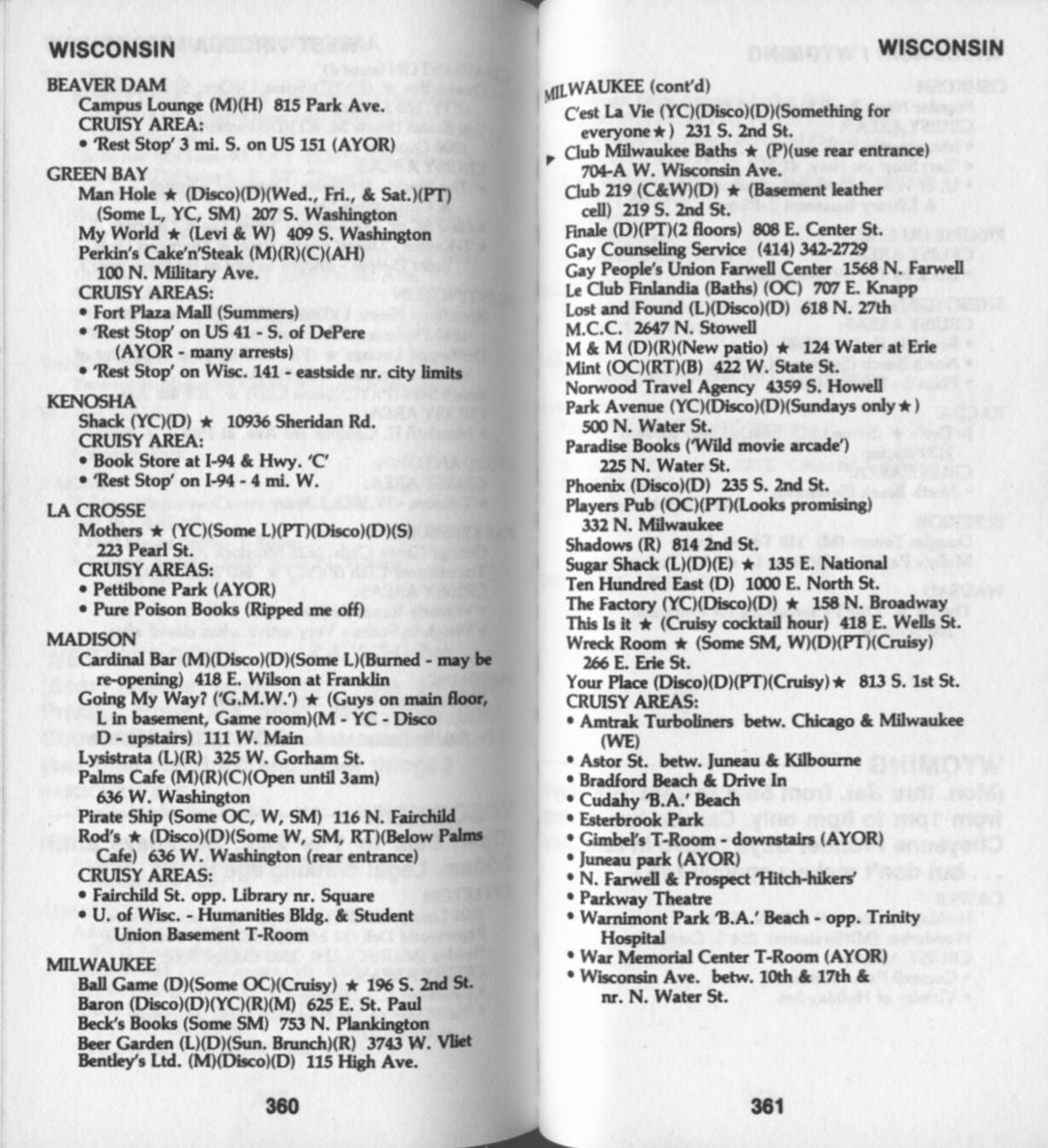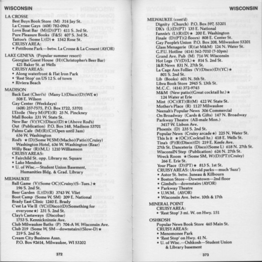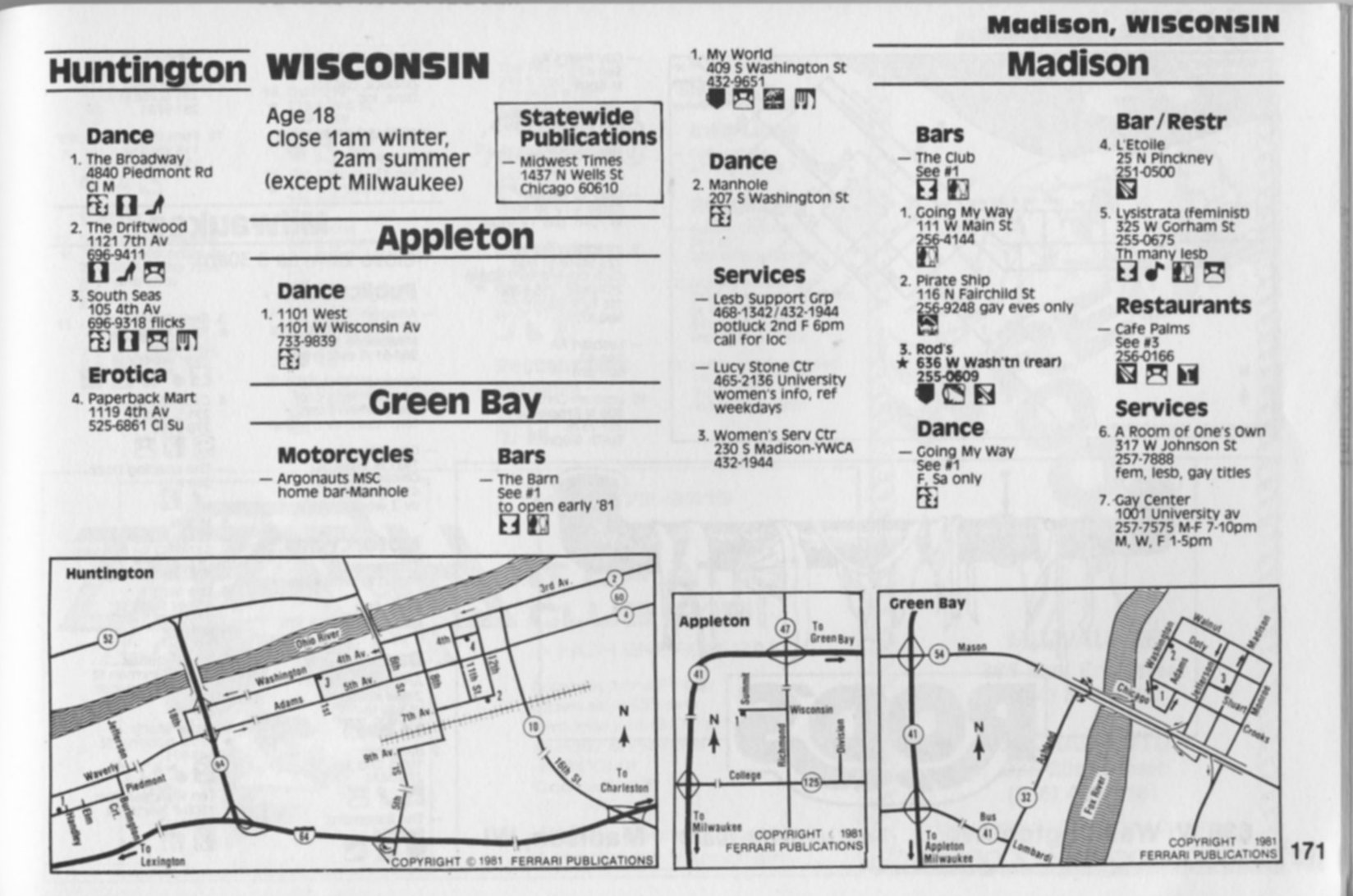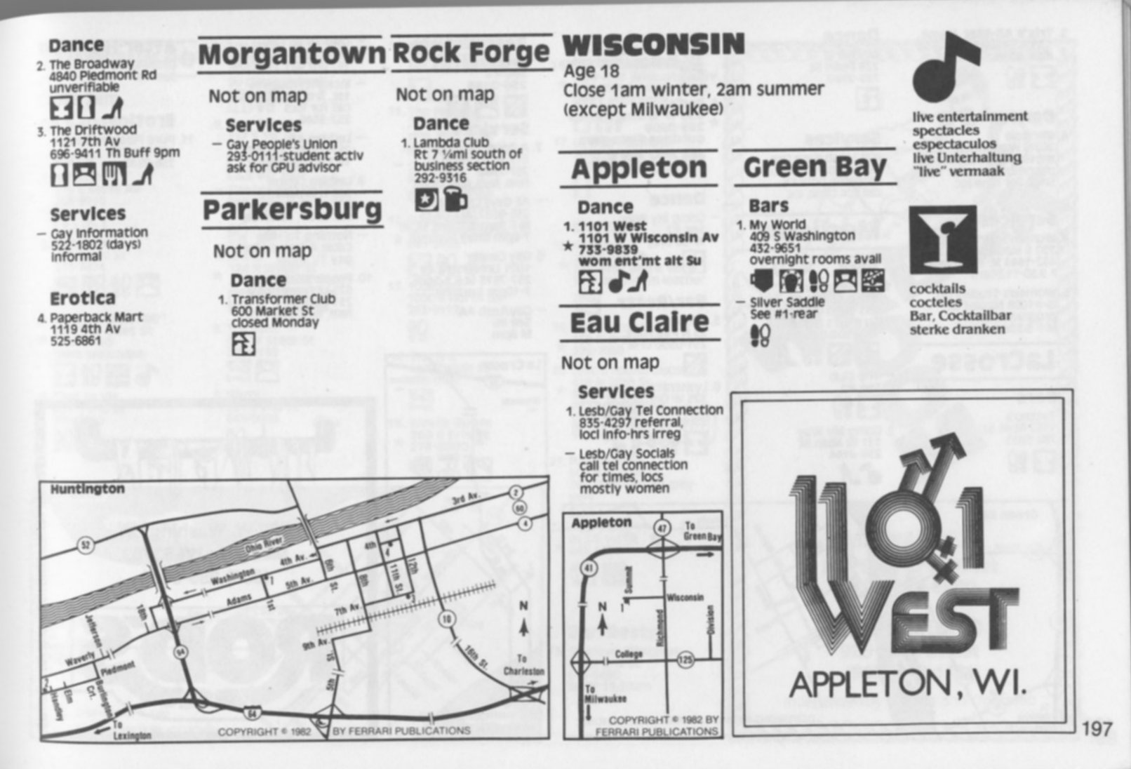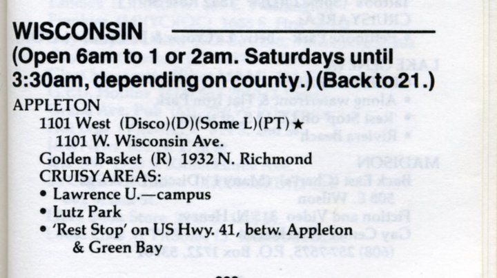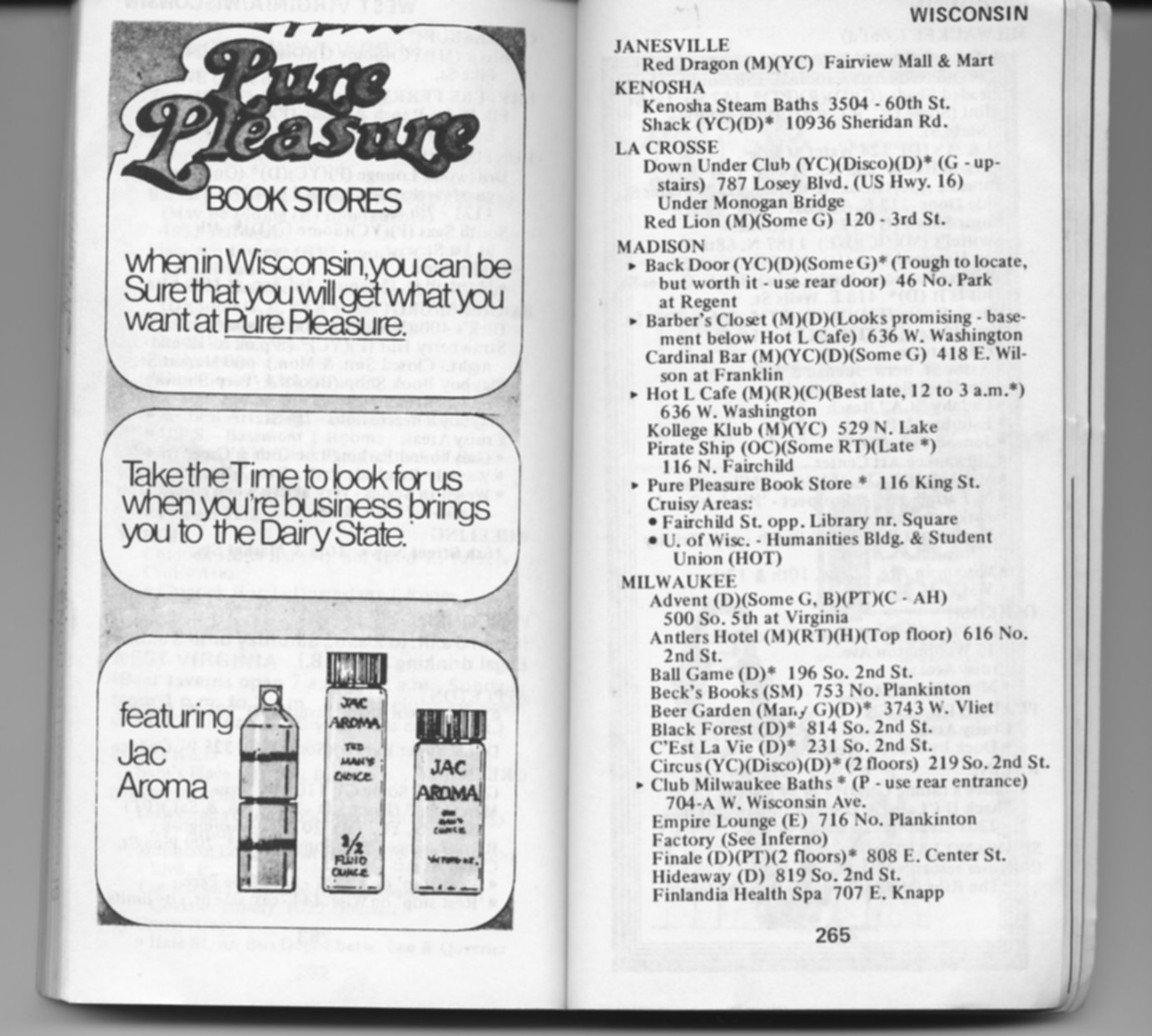 (Only part of the first issue of this locally/ Milwaukee-produced publication has been located, and only the inside pages: pages 1 thru 6 and 35-40 are missing; but the section that survives provides a rare glimpse of the city's gay life at that time: an accurate local listing of organizations and businesses, informational text about many of the bars, plus rare photos of the interiors of many bars. Additional issues anyone is able to locate are welcome!)