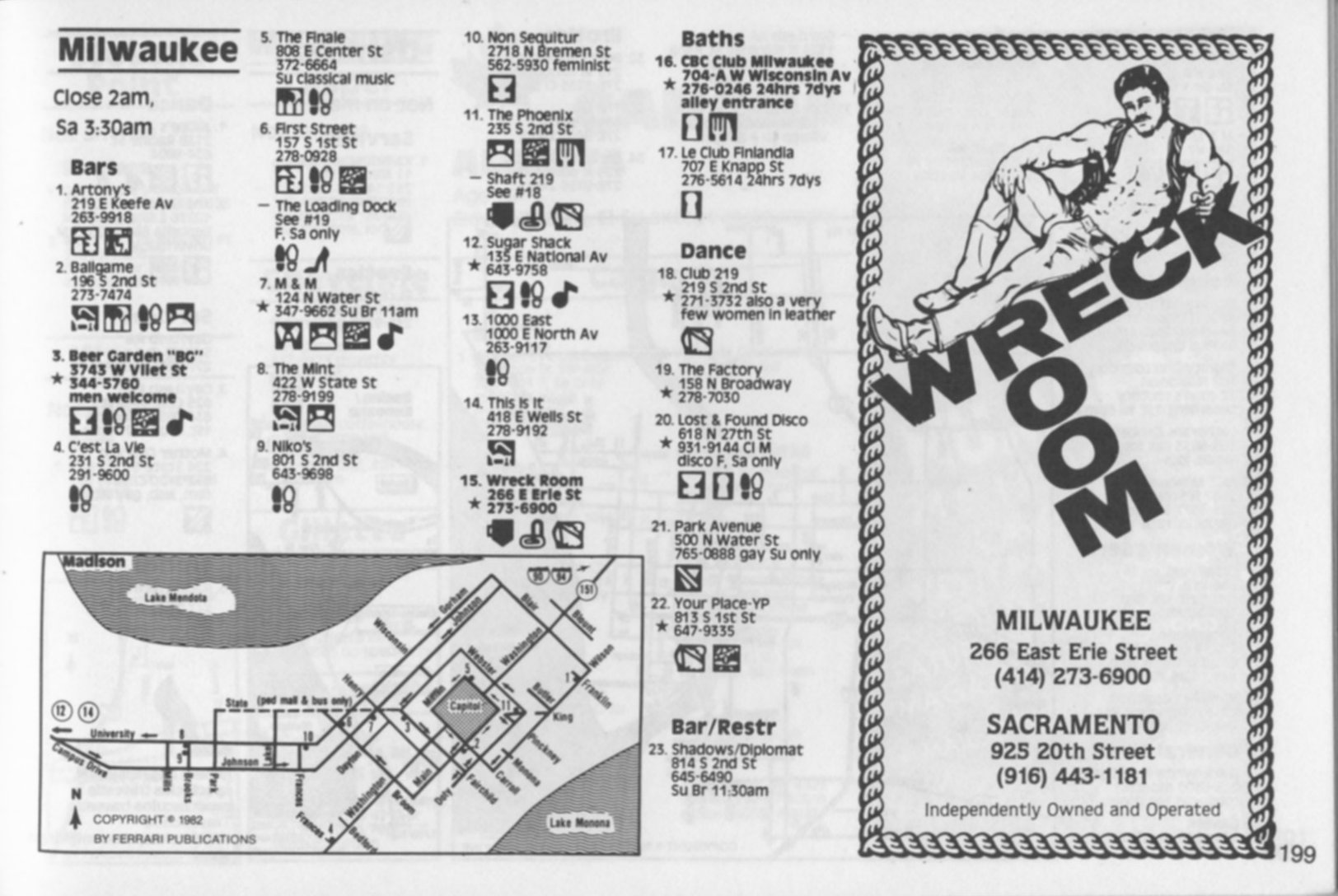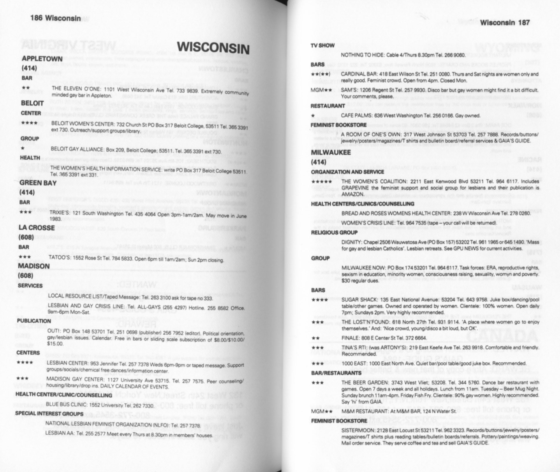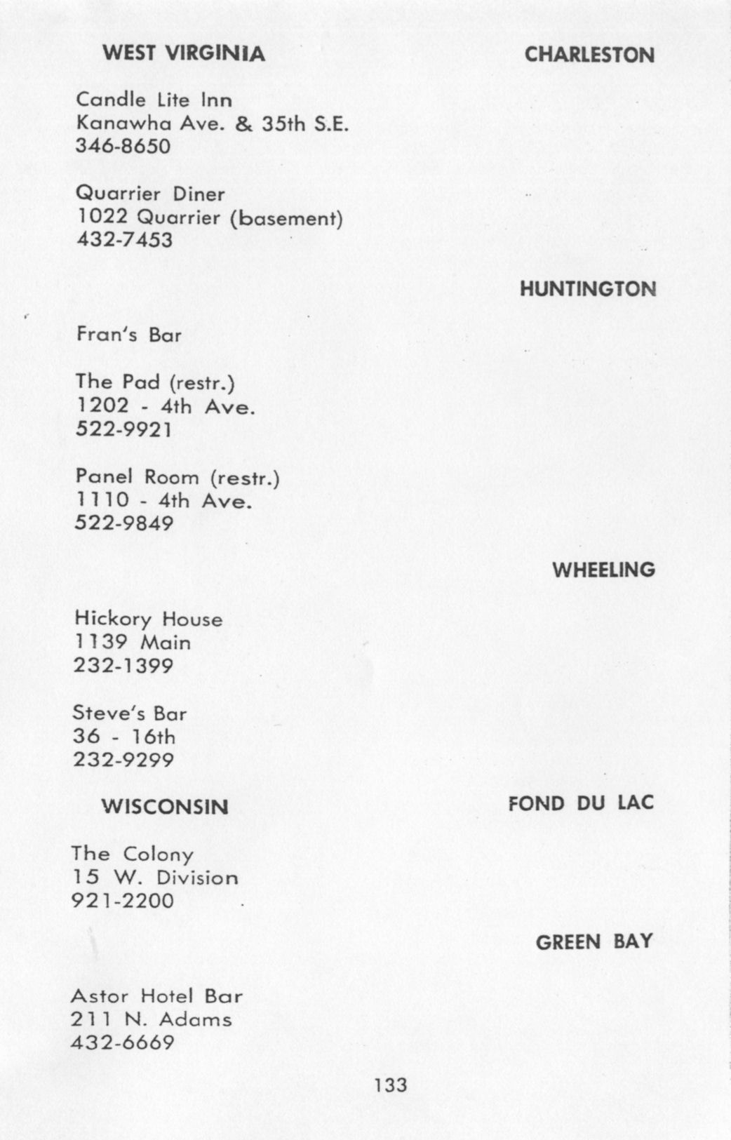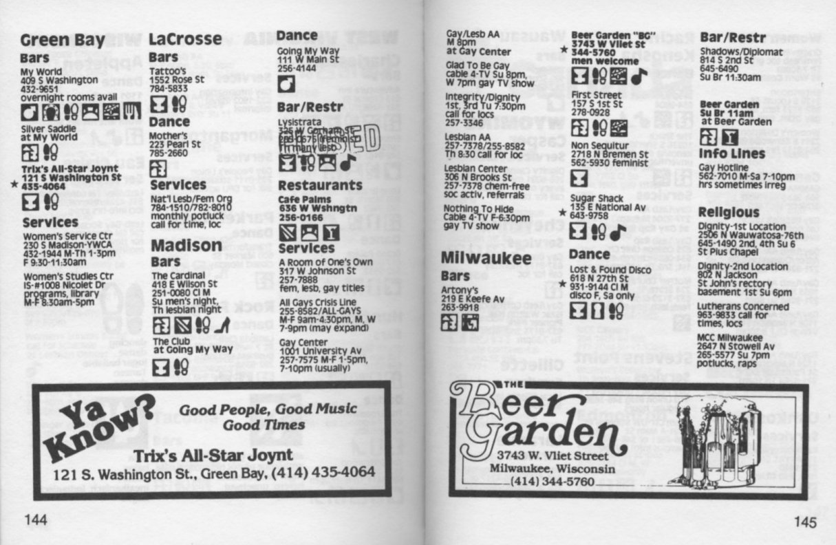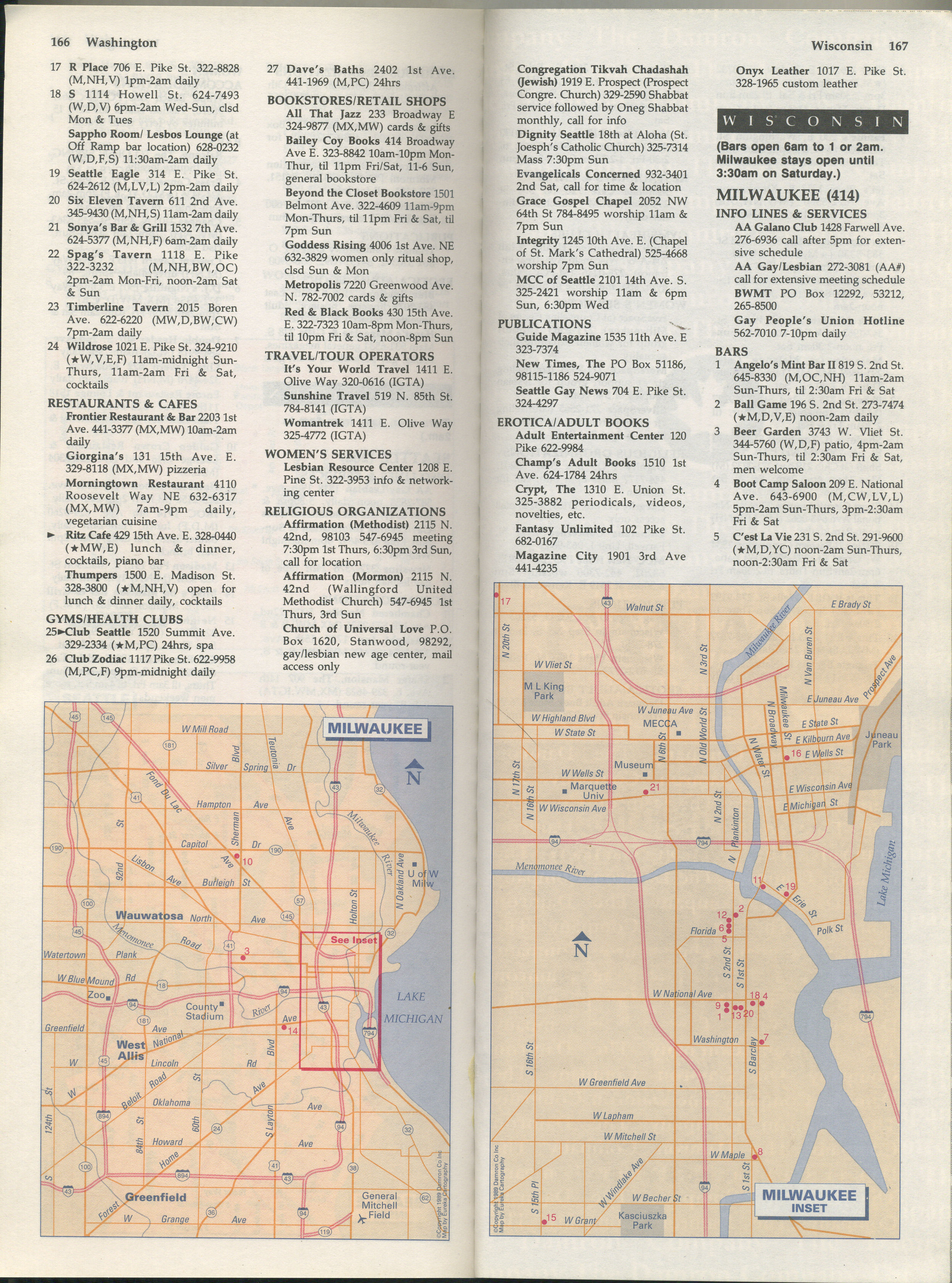 (Only part of the first issue of this locally/ Milwaukee-produced publication has been located, and only the inside pages: pages 1 thru 6 and 35-40 are missing; but the section that survives provides a rare glimpse of the city's gay life at that time: an accurate local listing of organizations and businesses, informational text about many of the bars, plus rare photos of the interiors of many bars. Additional issues anyone is able to locate are welcome!)