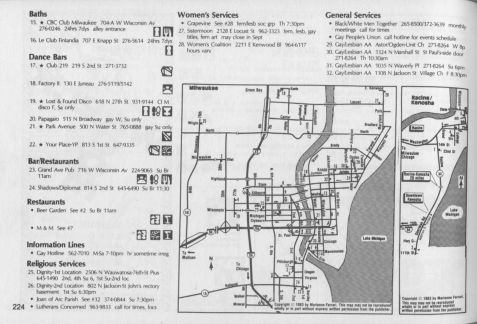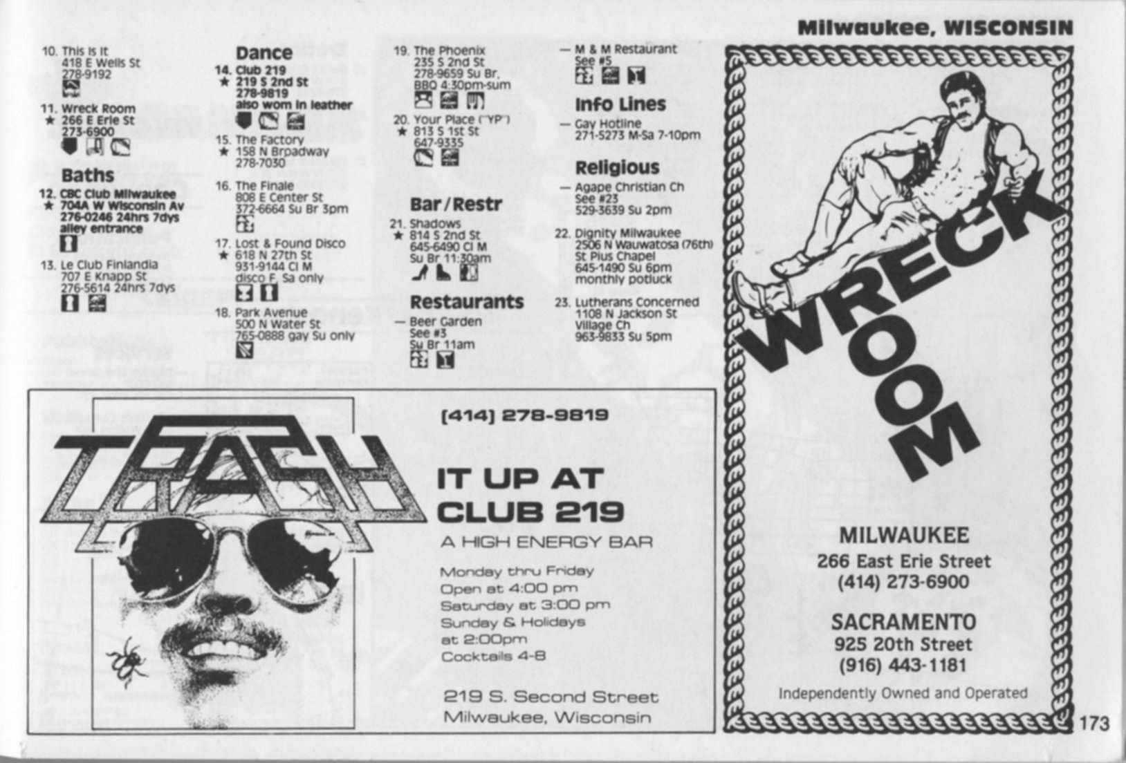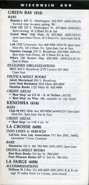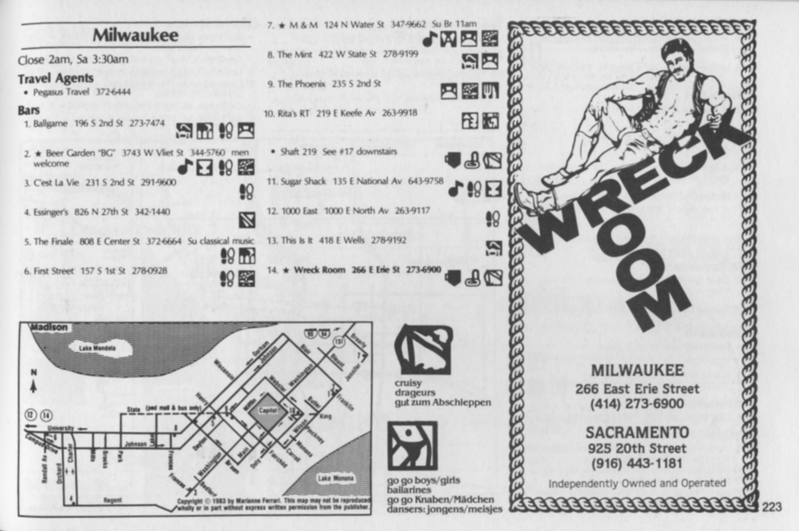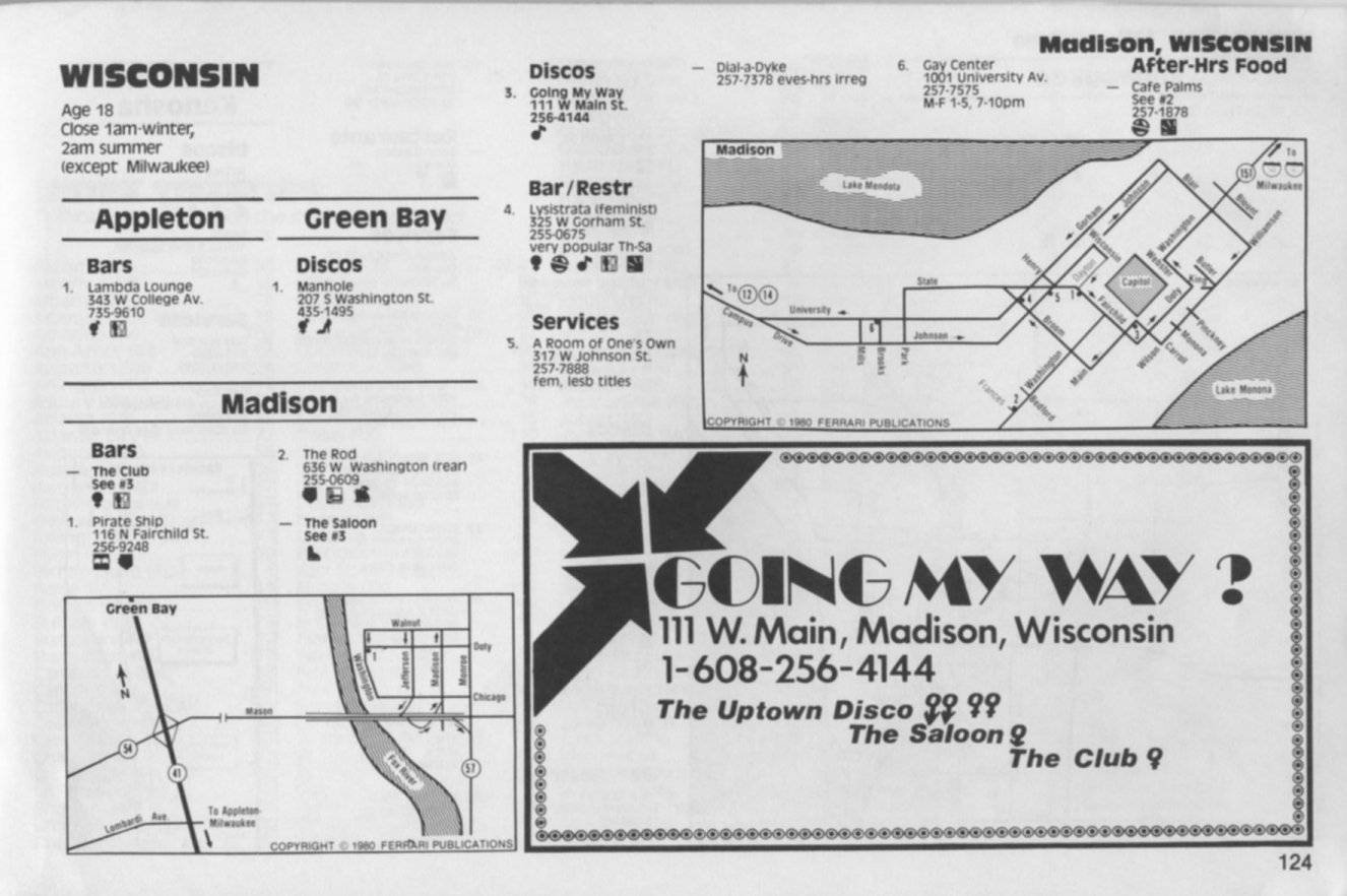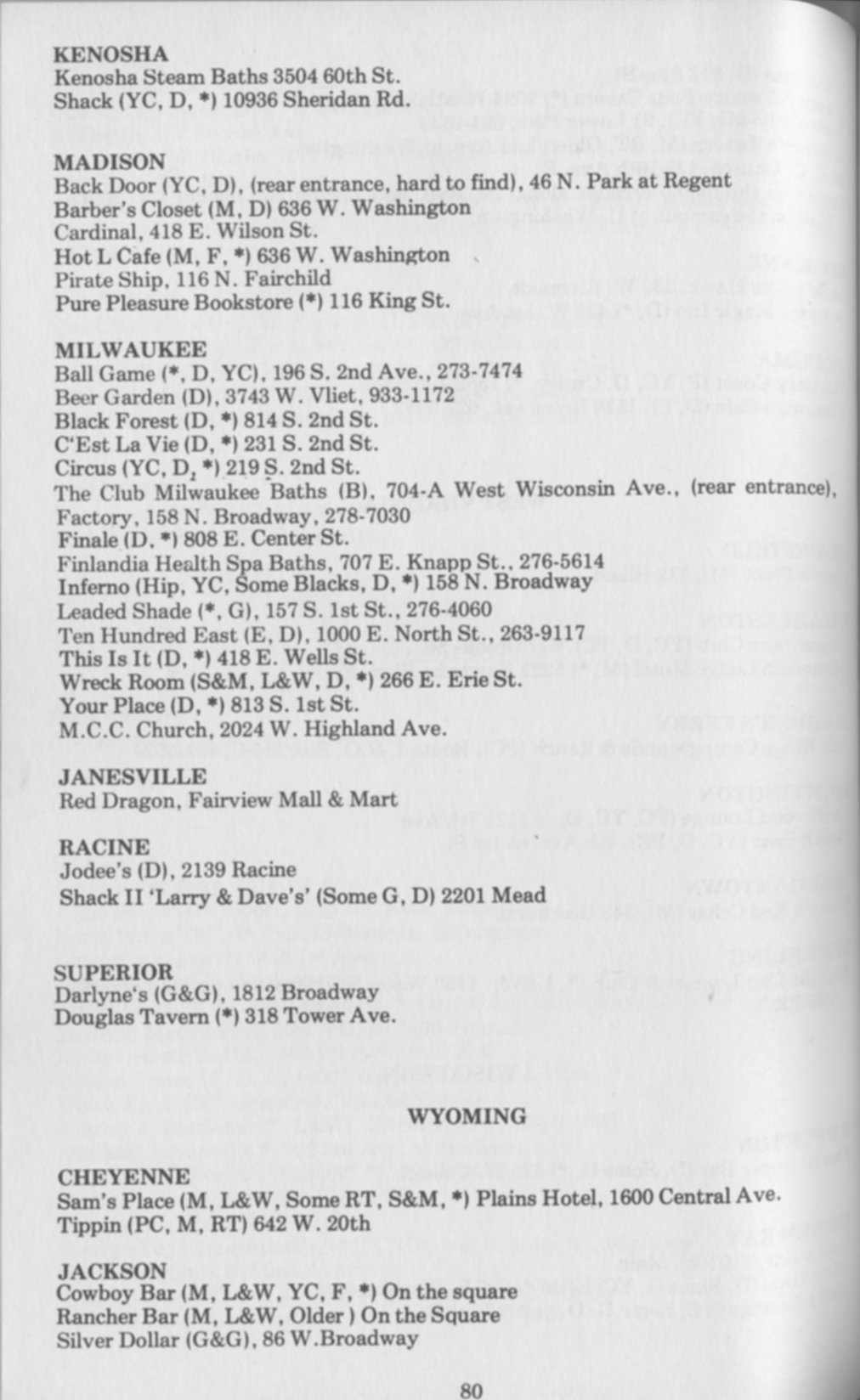 (Only part of the first issue of this locally/ Milwaukee-produced publication has been located, and only the inside pages: pages 1 thru 6 and 35-40 are missing; but the section that survives provides a rare glimpse of the city's gay life at that time: an accurate local listing of organizations and businesses, informational text about many of the bars, plus rare photos of the interiors of many bars. Additional issues anyone is able to locate are welcome!)