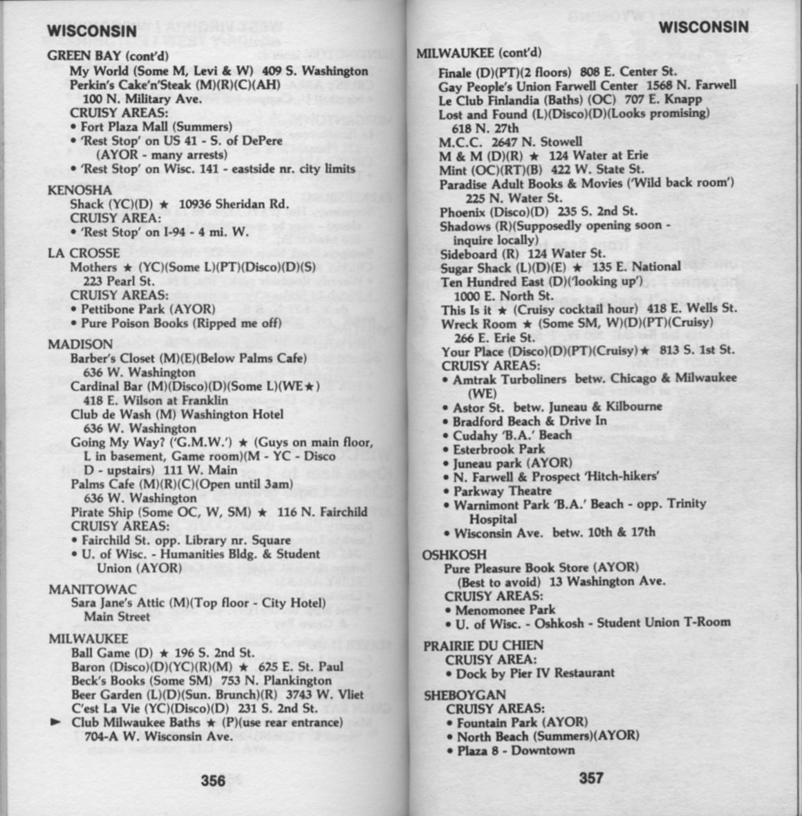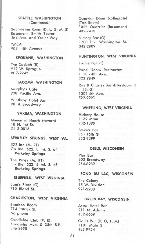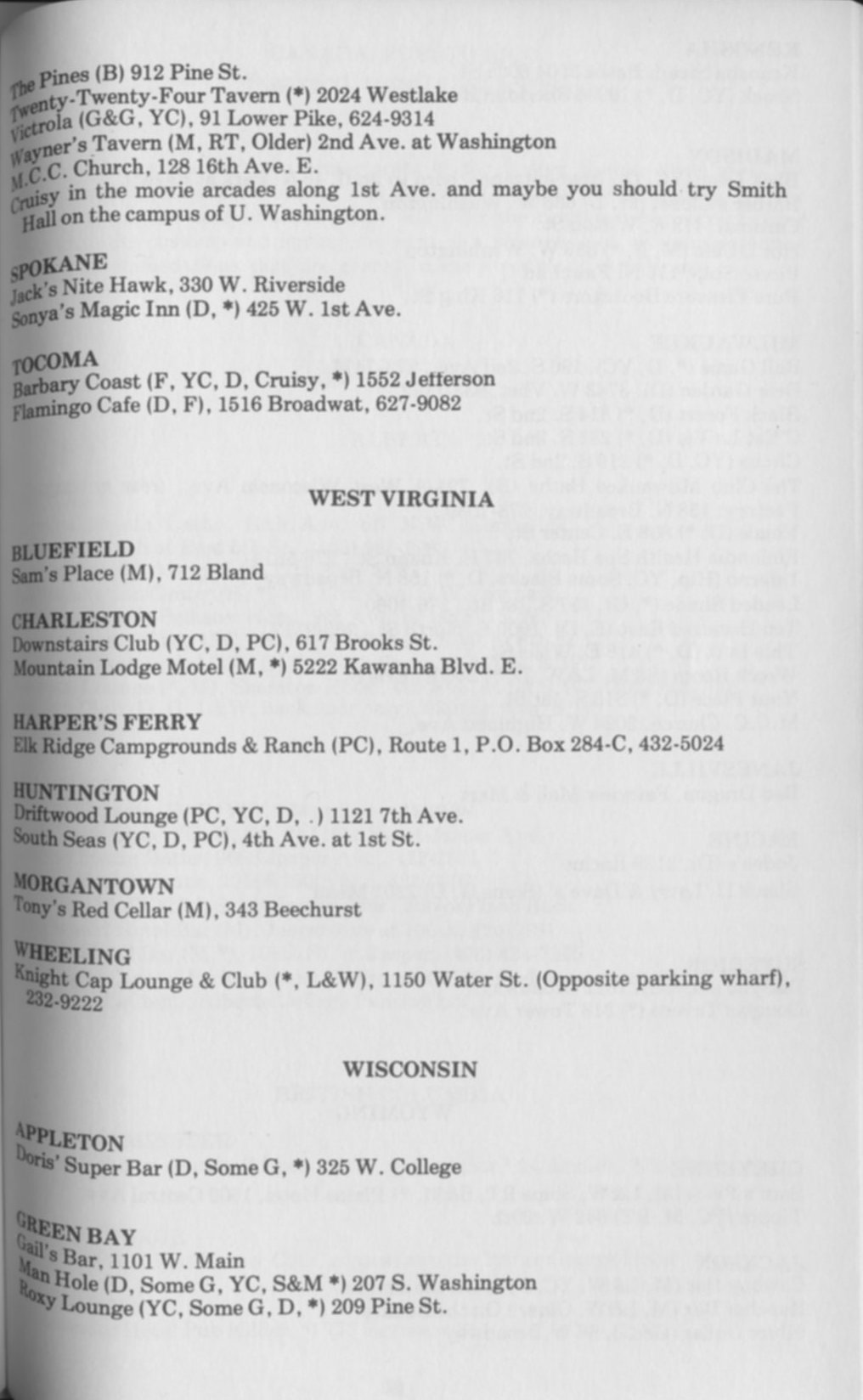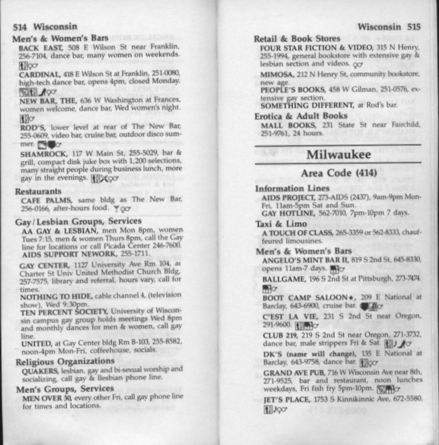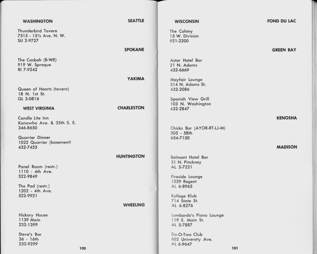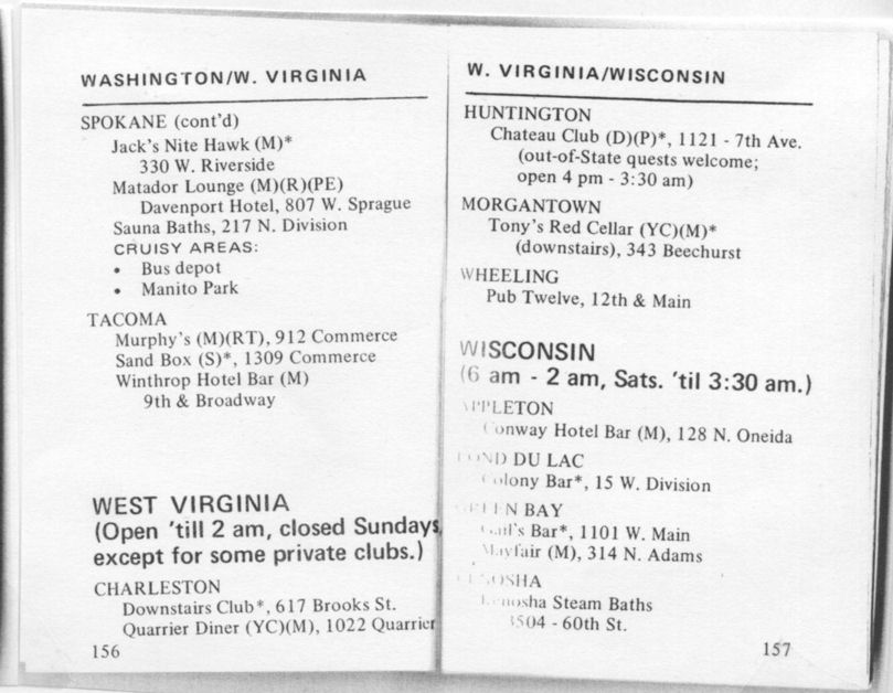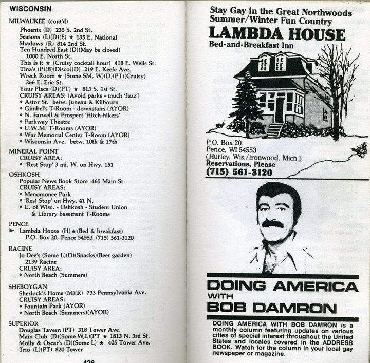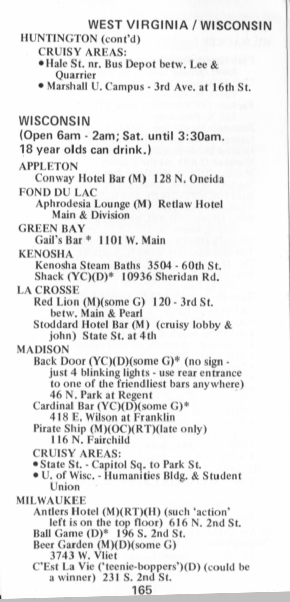 (Only part of the first issue of this locally/ Milwaukee-produced publication has been located, and only the inside pages: pages 1 thru 6 and 35-40 are missing; but the section that survives provides a rare glimpse of the city's gay life at that time: an accurate local listing of organizations and businesses, informational text about many of the bars, plus rare photos of the interiors of many bars. Additional issues anyone is able to locate are welcome!)