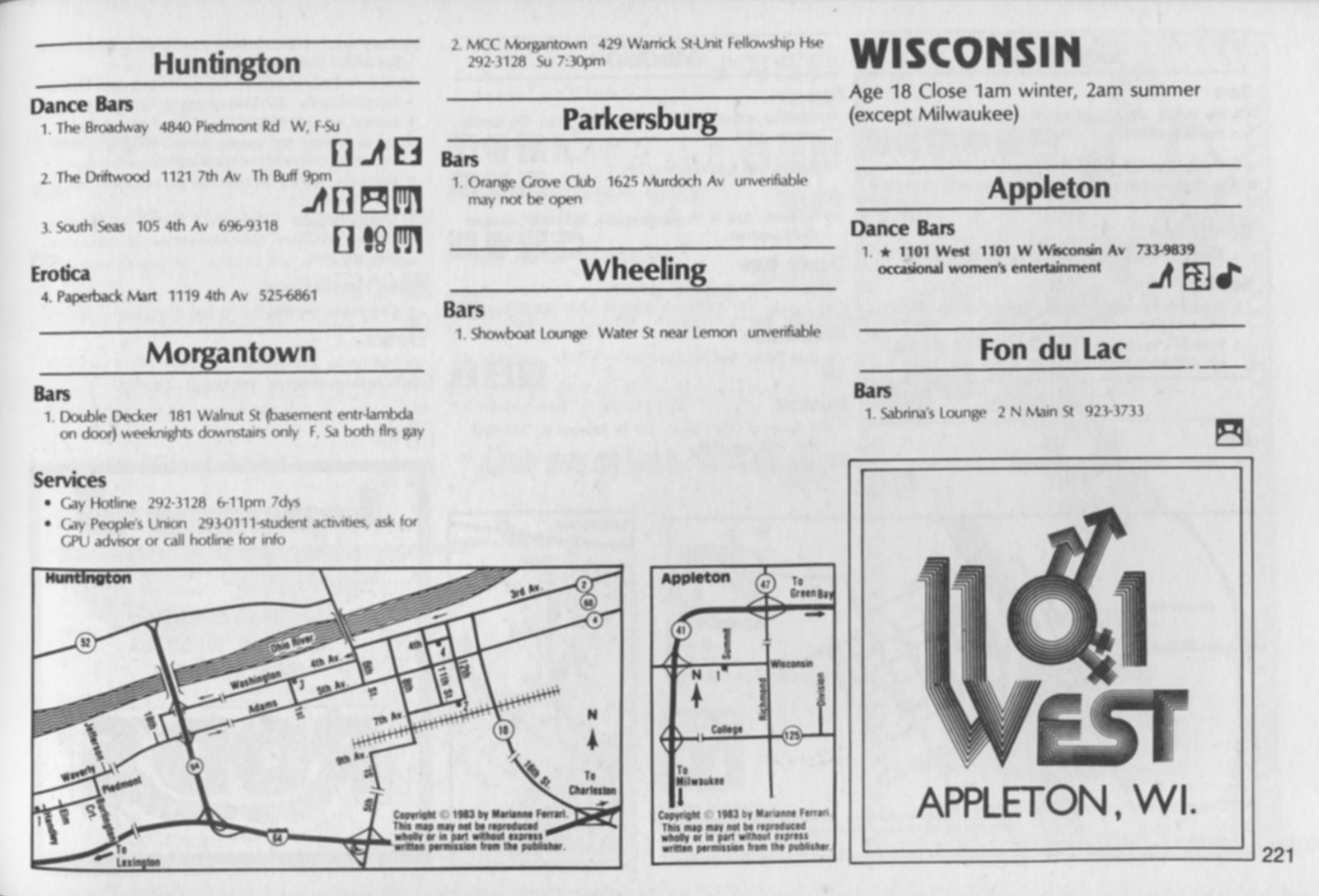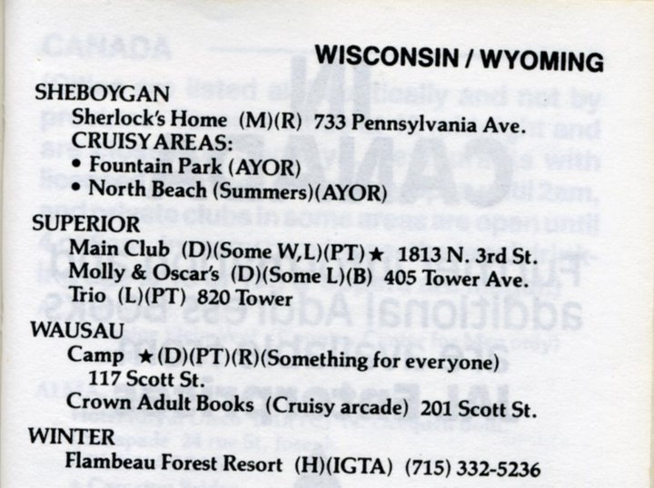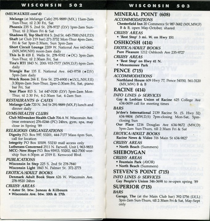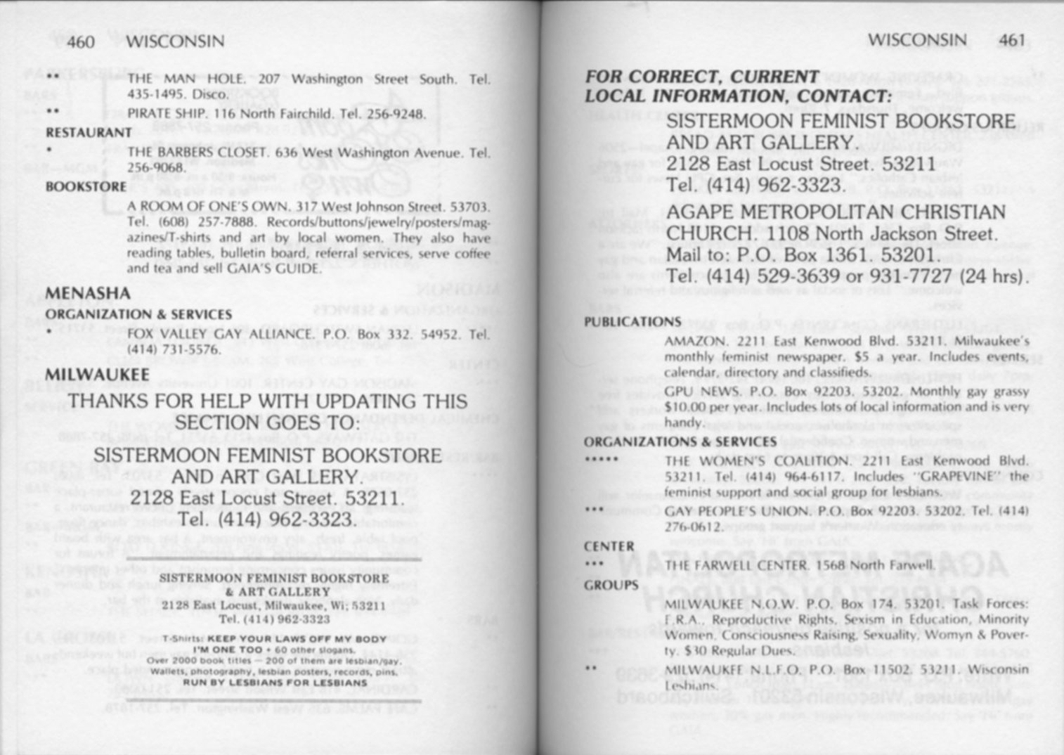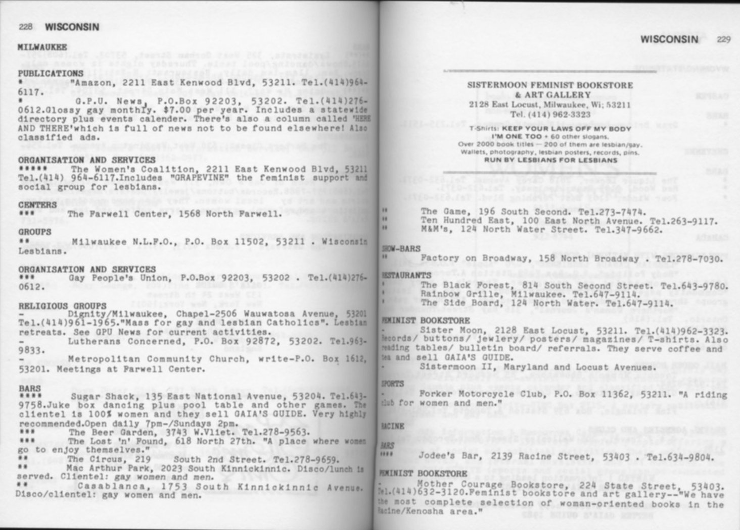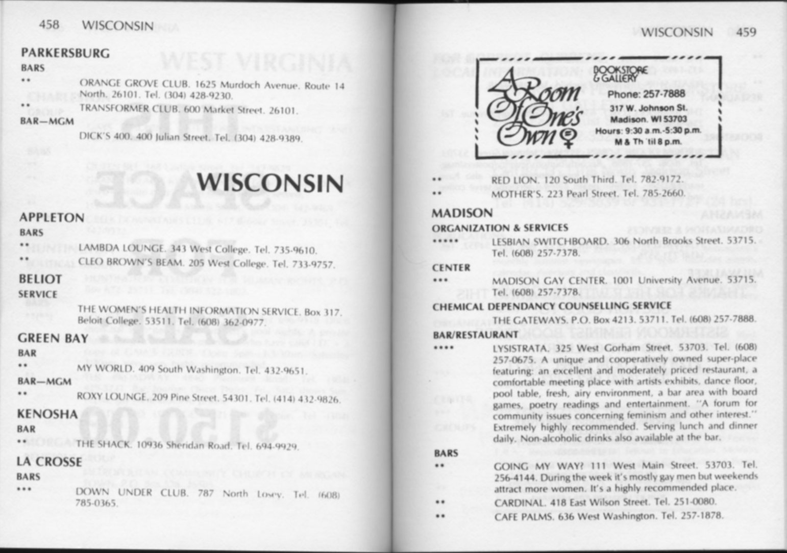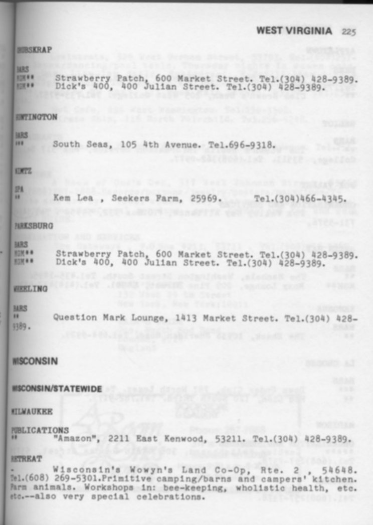 (Only part of the first issue of this locally/ Milwaukee-produced publication has been located, and only the inside pages: pages 1 thru 6 and 35-40 are missing; but the section that survives provides a rare glimpse of the city's gay life at that time: an accurate local listing of organizations and businesses, informational text about many of the bars, plus rare photos of the interiors of many bars. Additional issues anyone is able to locate are welcome!)