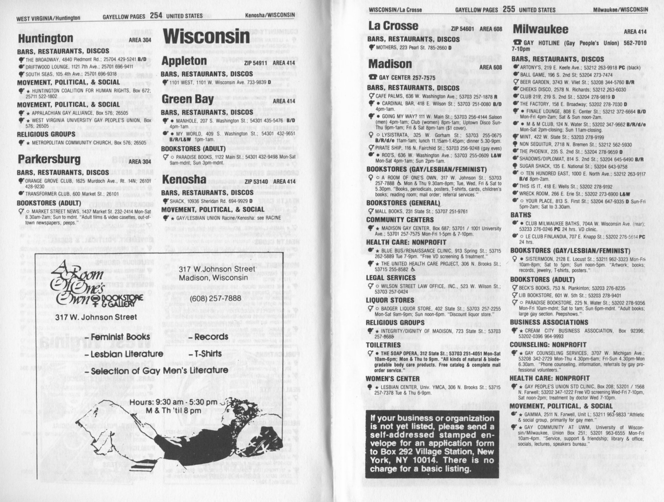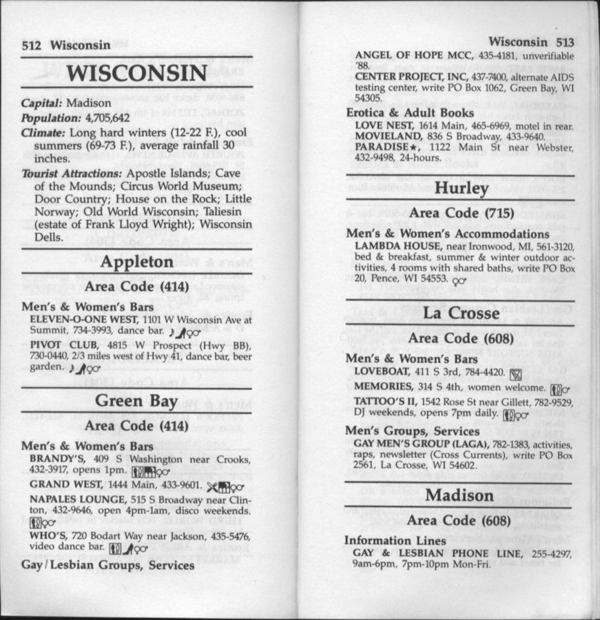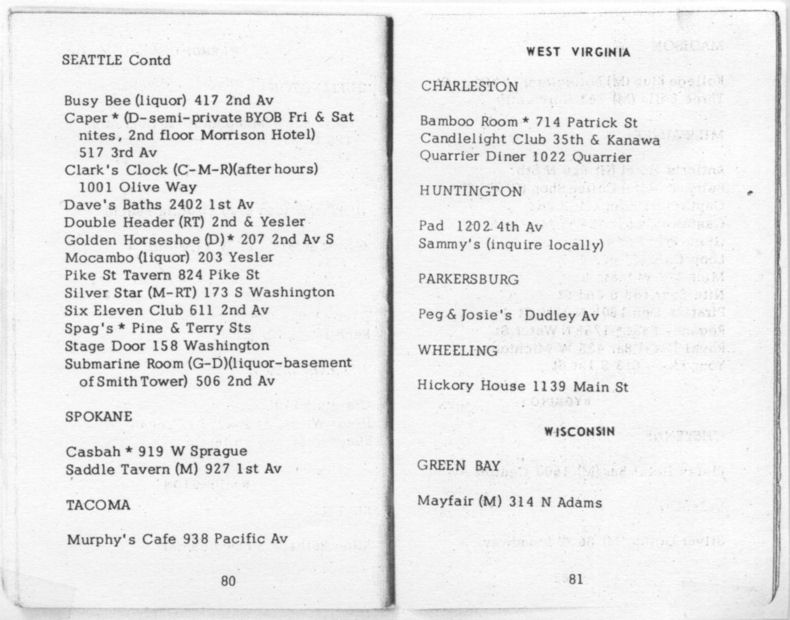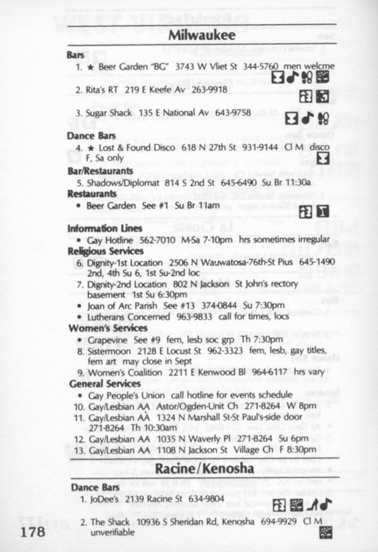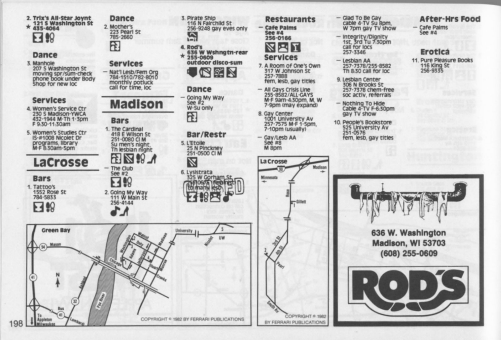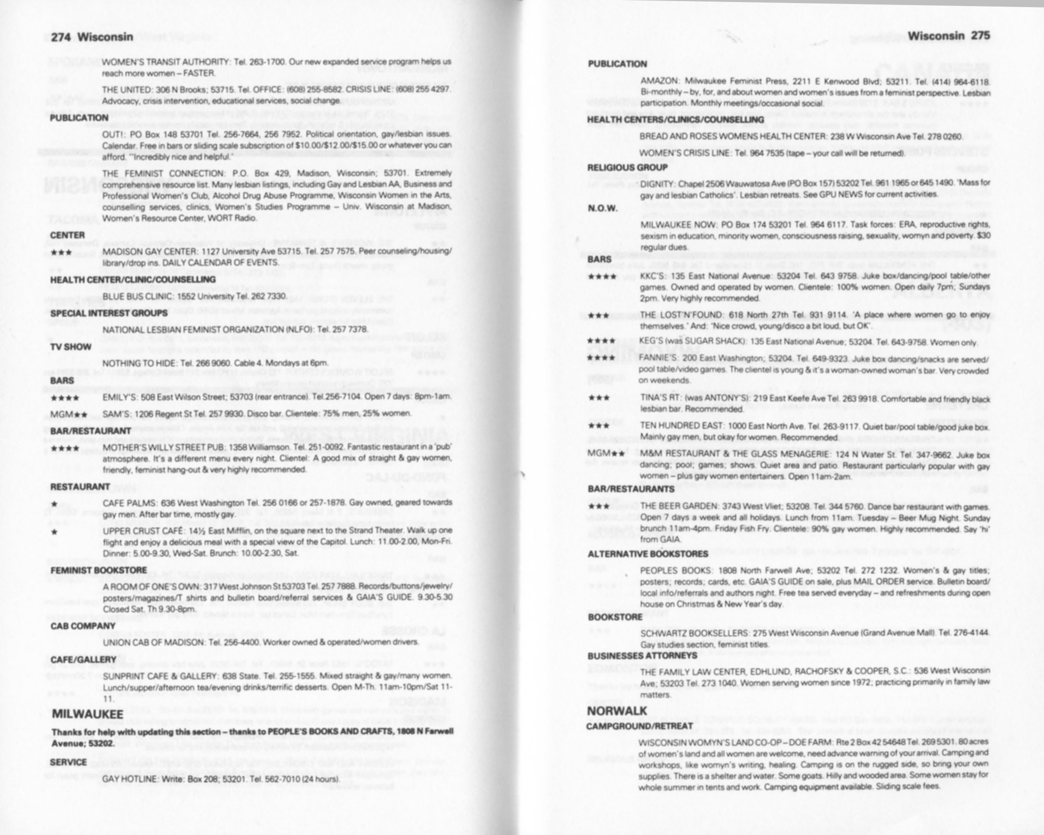 (Only part of the first issue of this locally/ Milwaukee-produced publication has been located, and only the inside pages: pages 1 thru 6 and 35-40 are missing; but the section that survives provides a rare glimpse of the city's gay life at that time: an accurate local listing of organizations and businesses, informational text about many of the bars, plus rare photos of the interiors of many bars. Additional issues anyone is able to locate are welcome!)