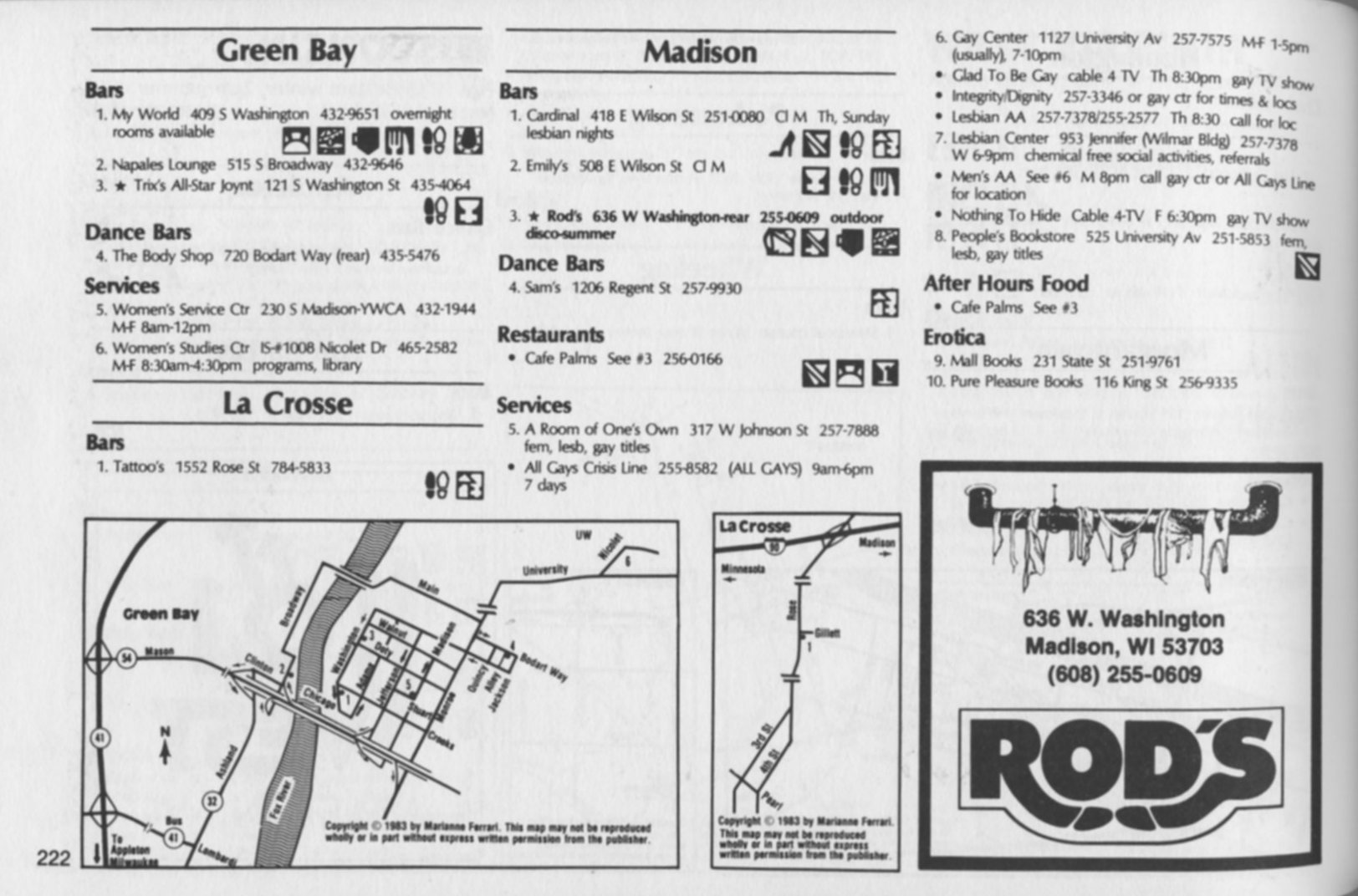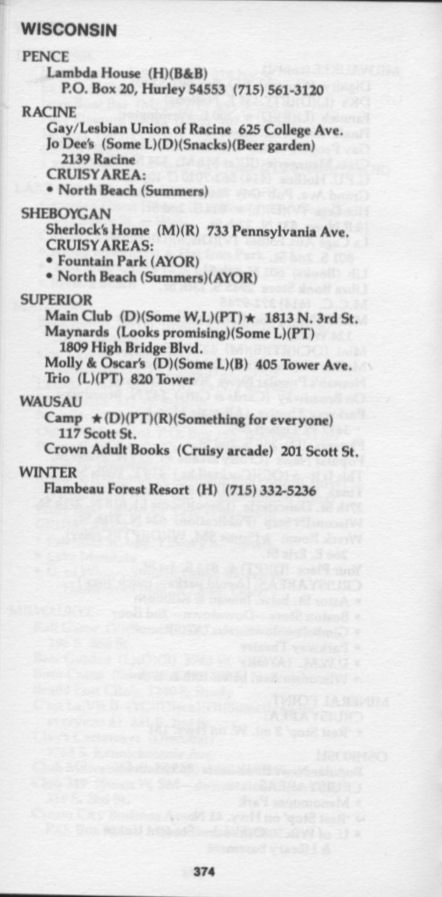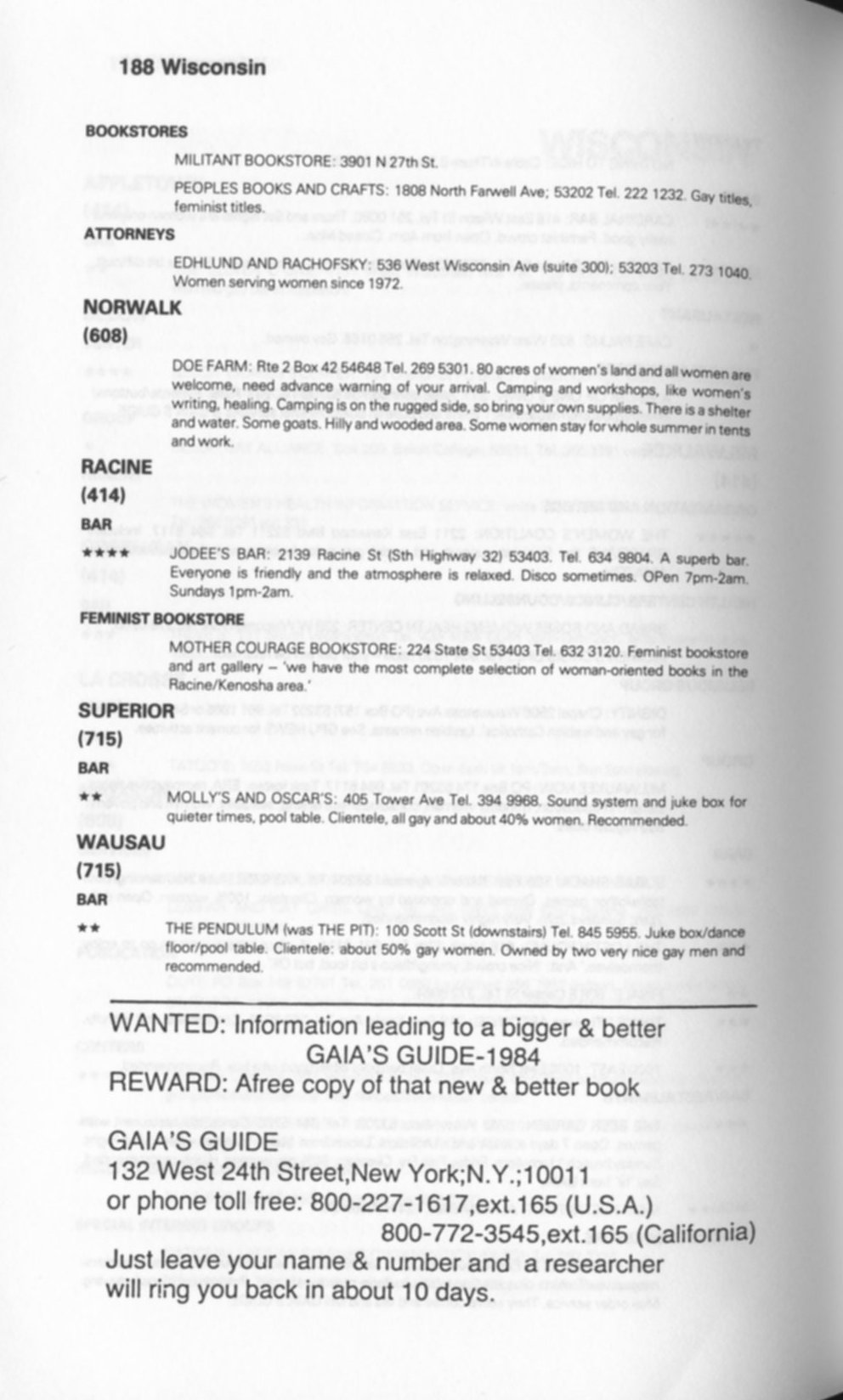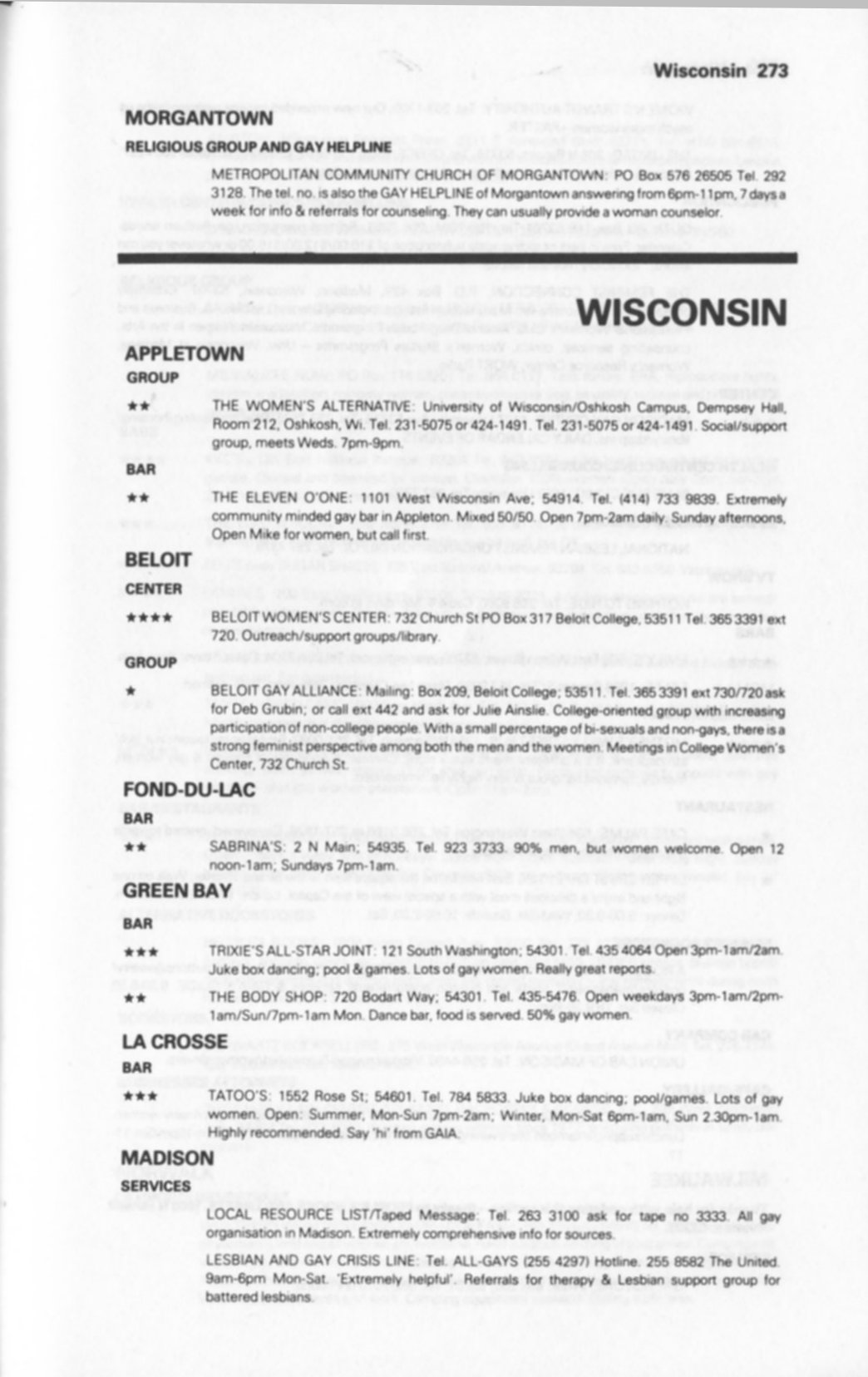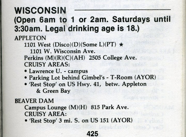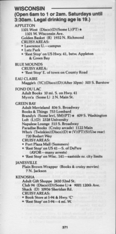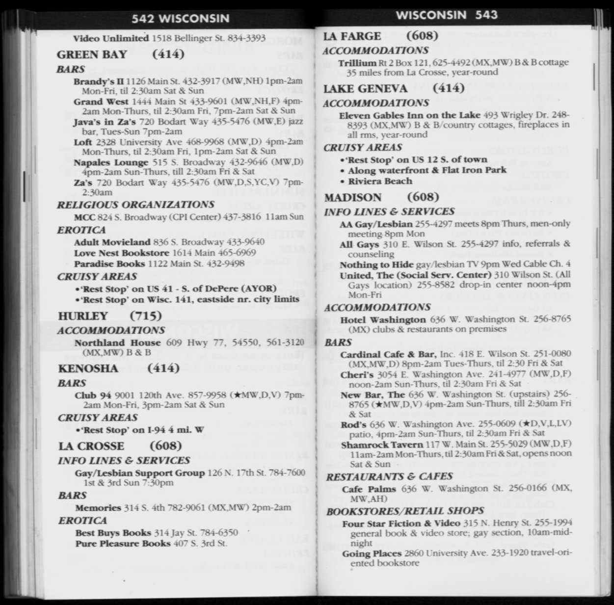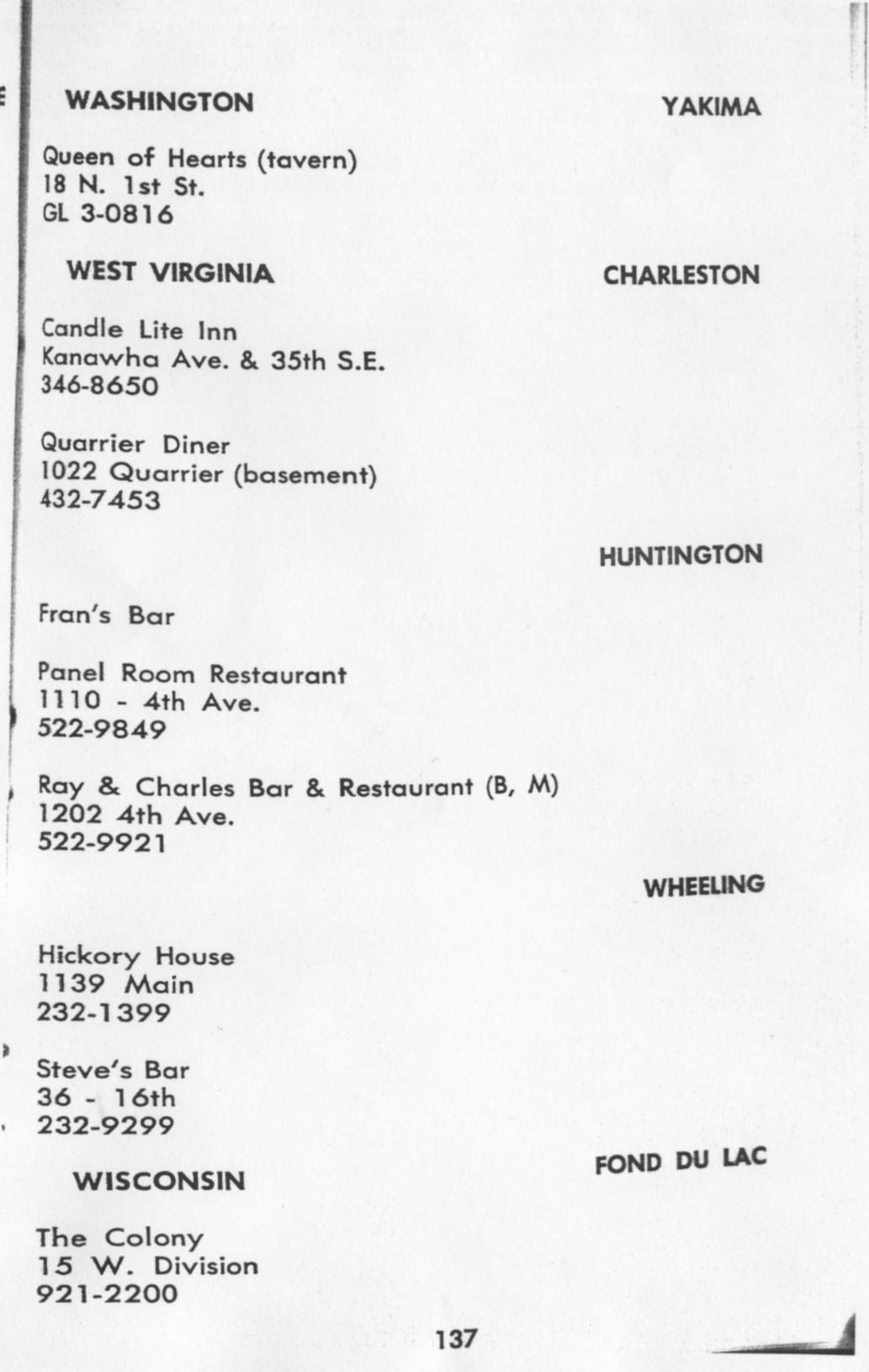 (Only part of the first issue of this locally/ Milwaukee-produced publication has been located, and only the inside pages: pages 1 thru 6 and 35-40 are missing; but the section that survives provides a rare glimpse of the city's gay life at that time: an accurate local listing of organizations and businesses, informational text about many of the bars, plus rare photos of the interiors of many bars. Additional issues anyone is able to locate are welcome!)