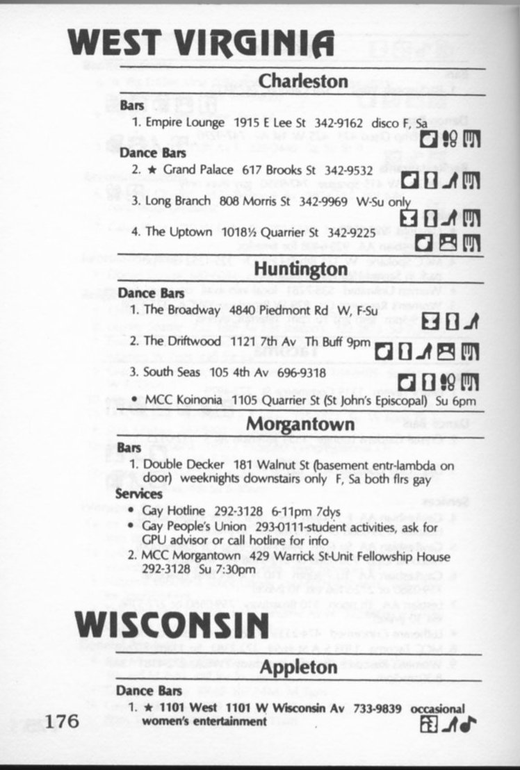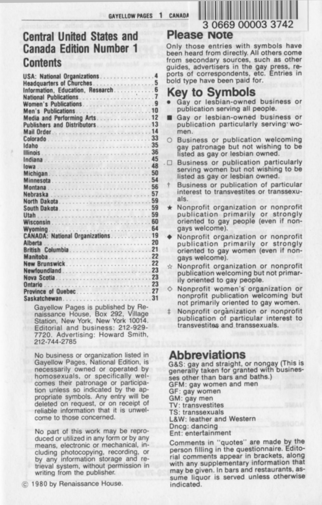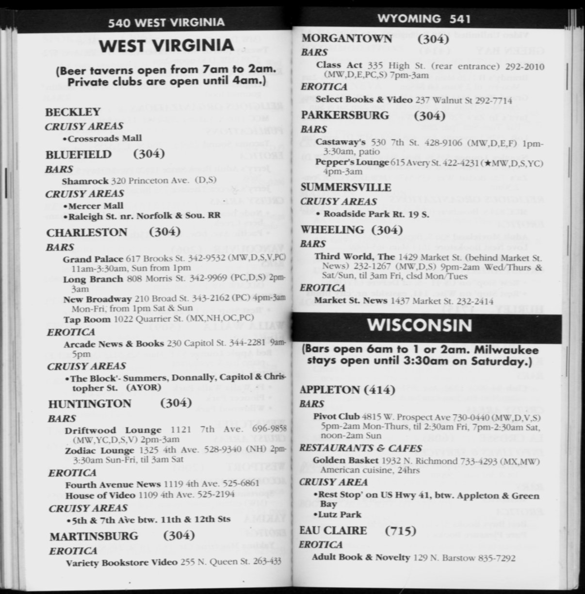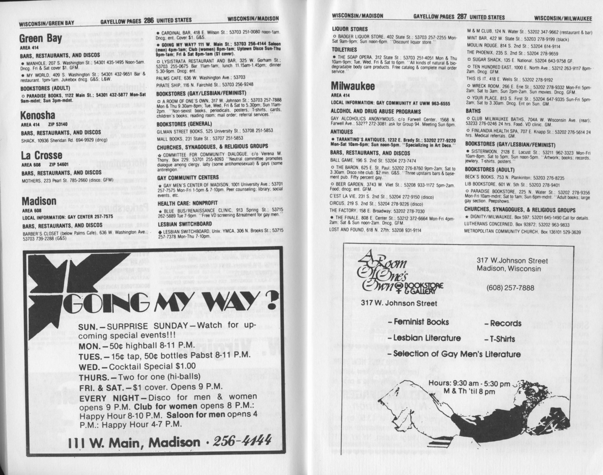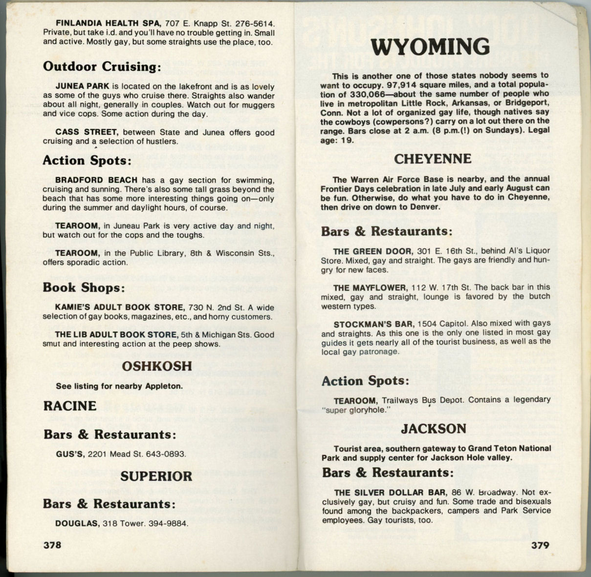 (Only part of the first issue of this locally/ Milwaukee-produced publication has been located, and only the inside pages: pages 1 thru 6 and 35-40 are missing; but the section that survives provides a rare glimpse of the city's gay life at that time: an accurate local listing of organizations and businesses, informational text about many of the bars, plus rare photos of the interiors of many bars. Additional issues anyone is able to locate are welcome!)