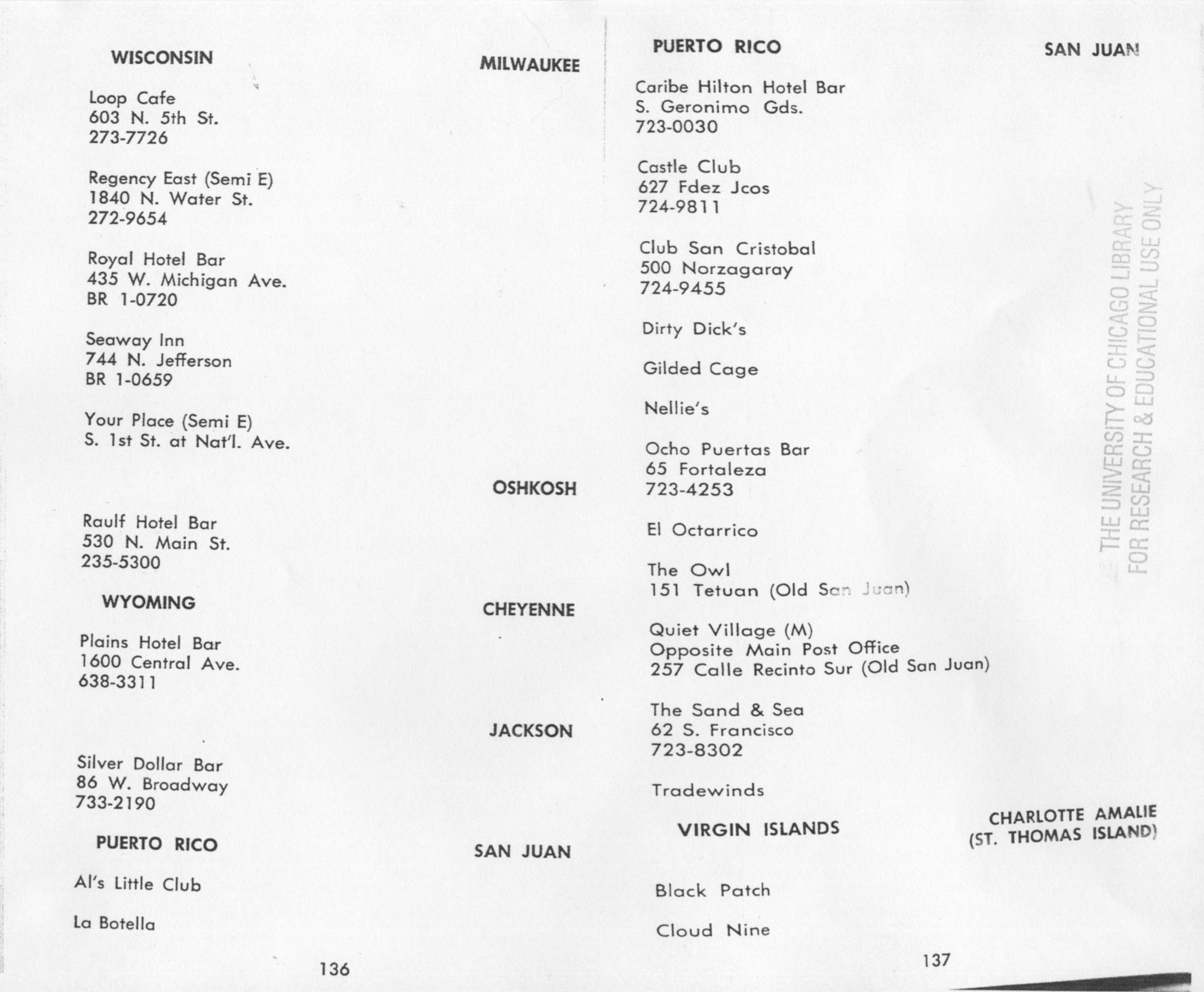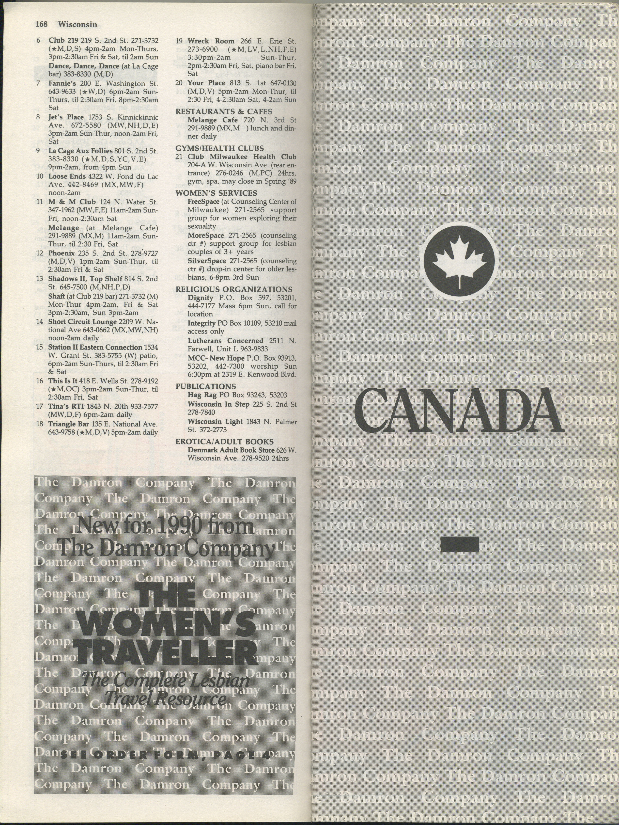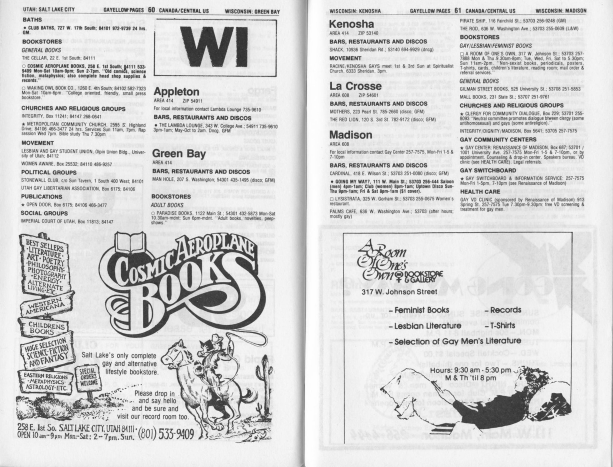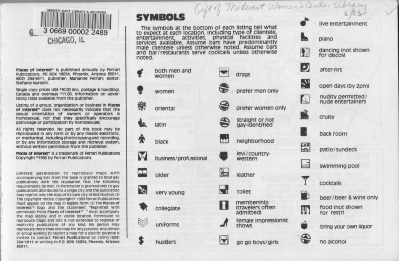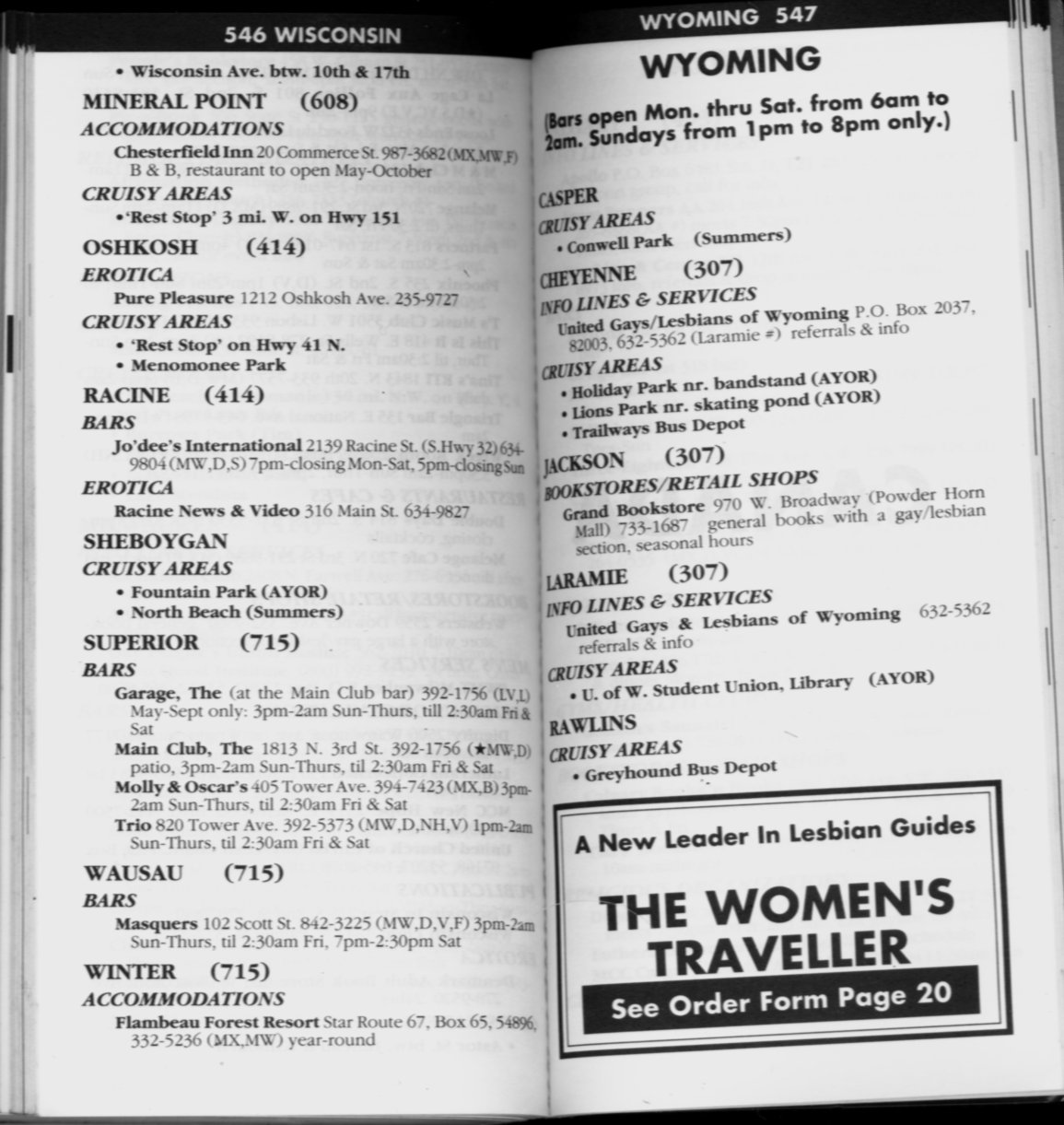 (Only part of the first issue of this locally/ Milwaukee-produced publication has been located, and only the inside pages: pages 1 thru 6 and 35-40 are missing; but the section that survives provides a rare glimpse of the city's gay life at that time: an accurate local listing of organizations and businesses, informational text about many of the bars, plus rare photos of the interiors of many bars. Additional issues anyone is able to locate are welcome!)