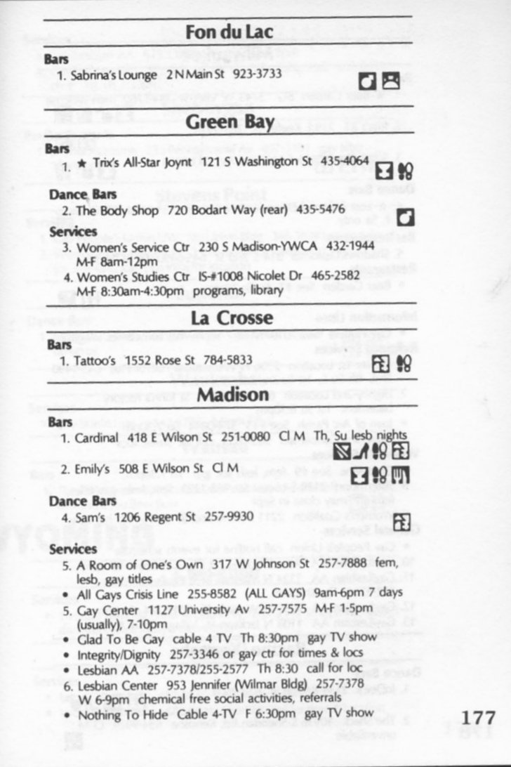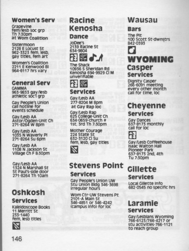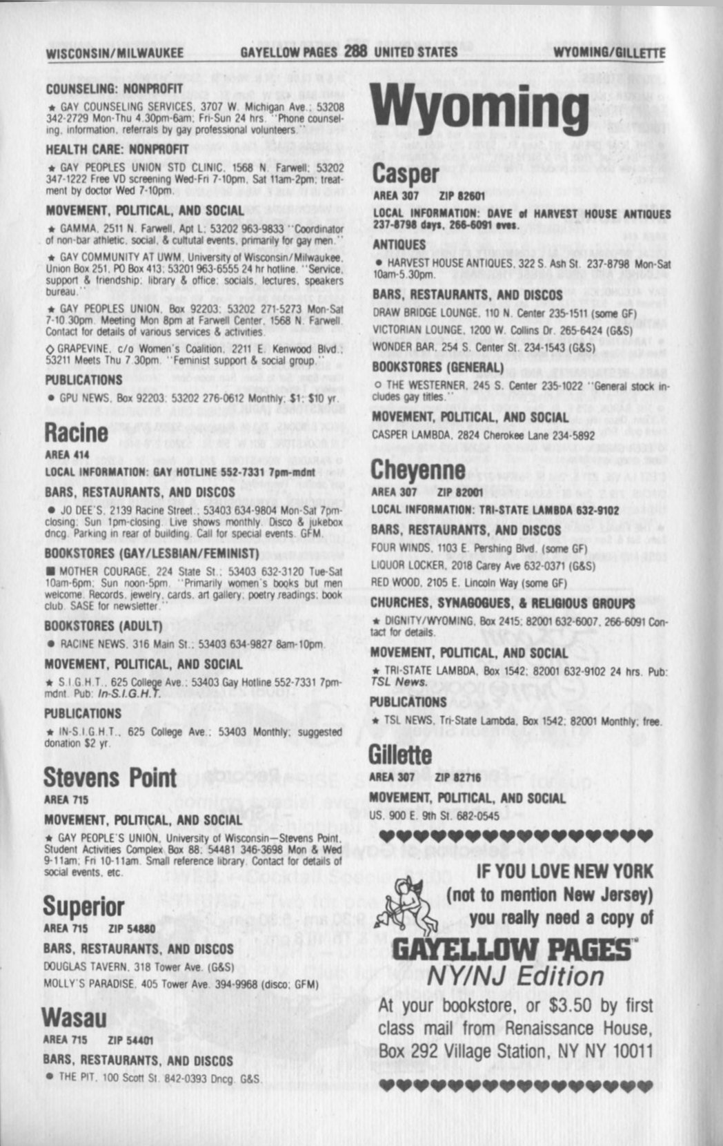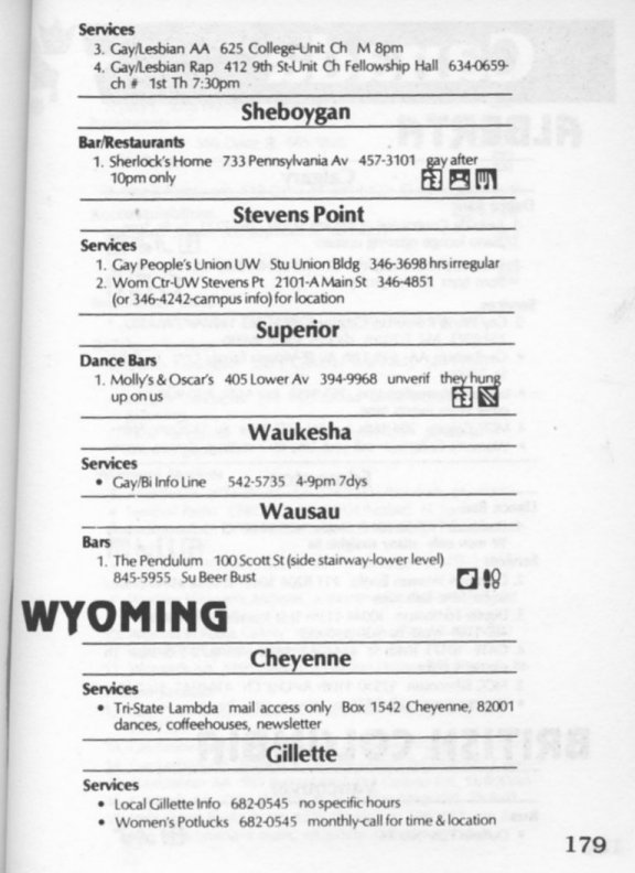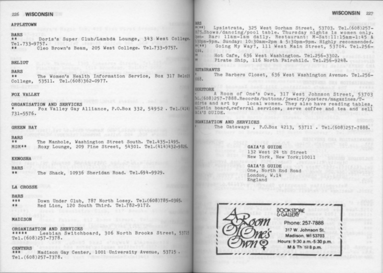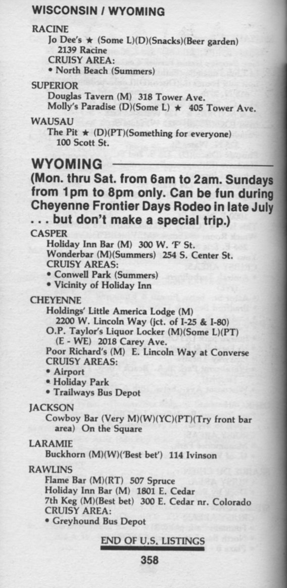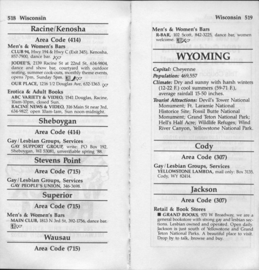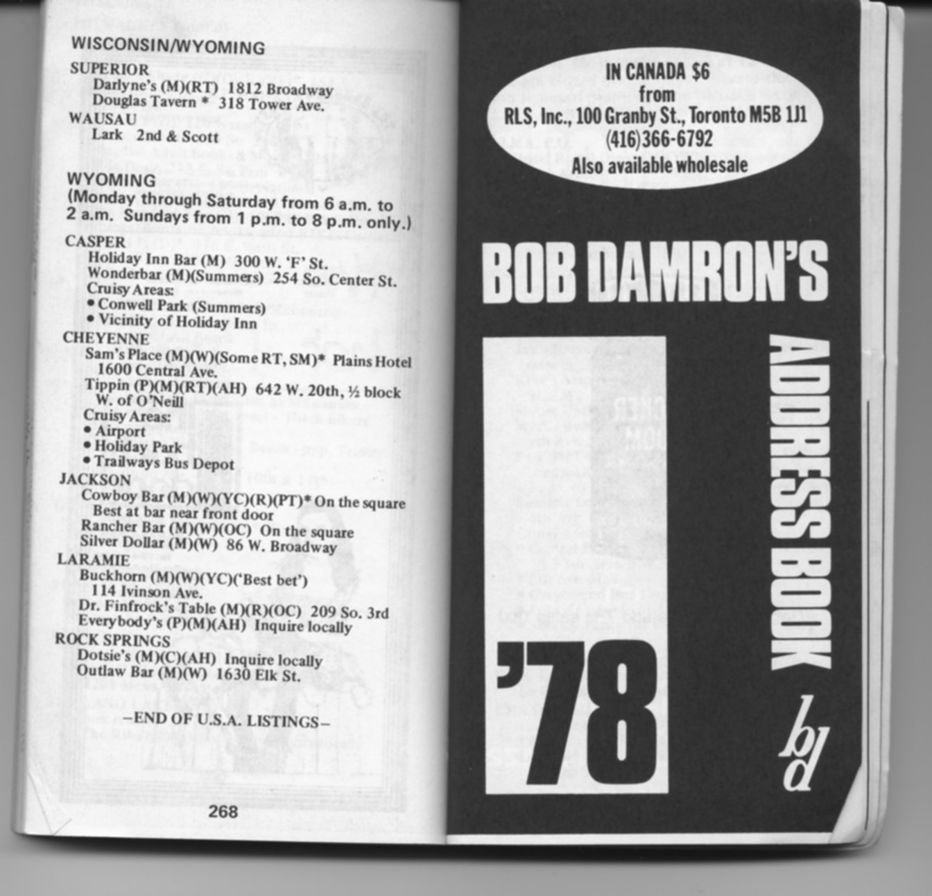 (Only part of the first issue of this locally/ Milwaukee-produced publication has been located, and only the inside pages: pages 1 thru 6 and 35-40 are missing; but the section that survives provides a rare glimpse of the city's gay life at that time: an accurate local listing of organizations and businesses, informational text about many of the bars, plus rare photos of the interiors of many bars. Additional issues anyone is able to locate are welcome!)