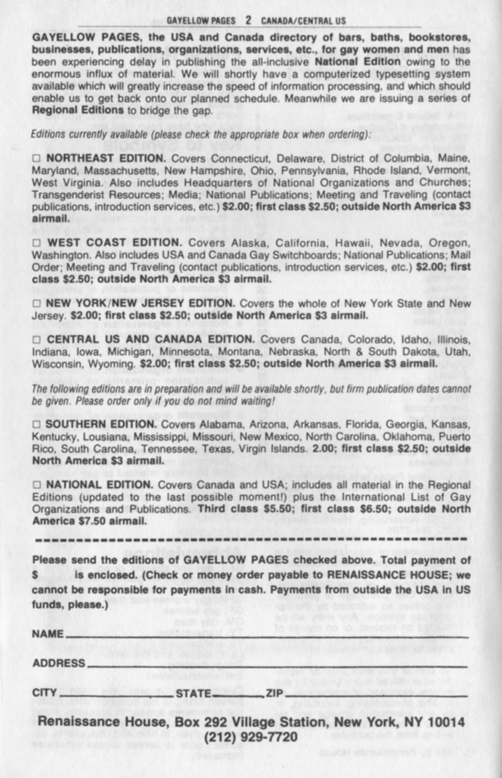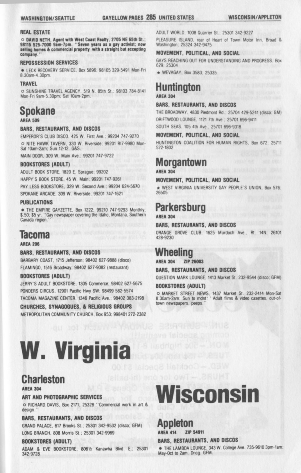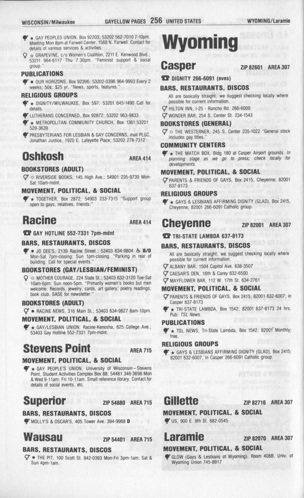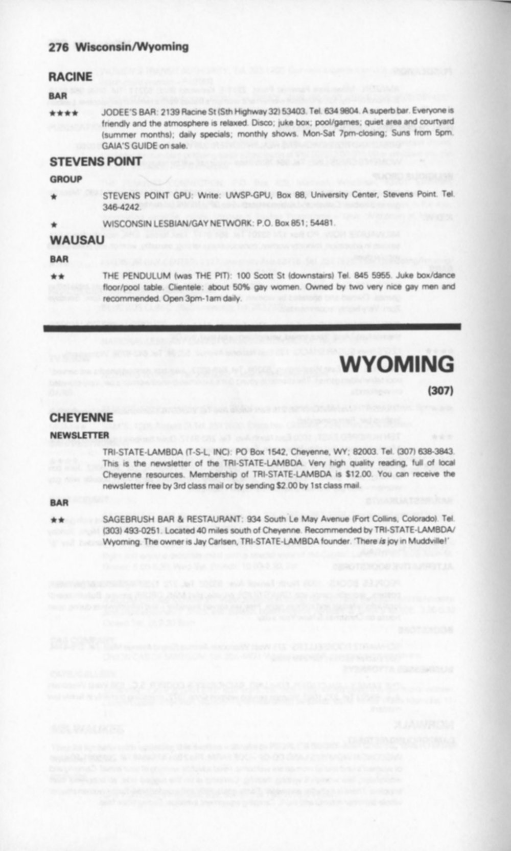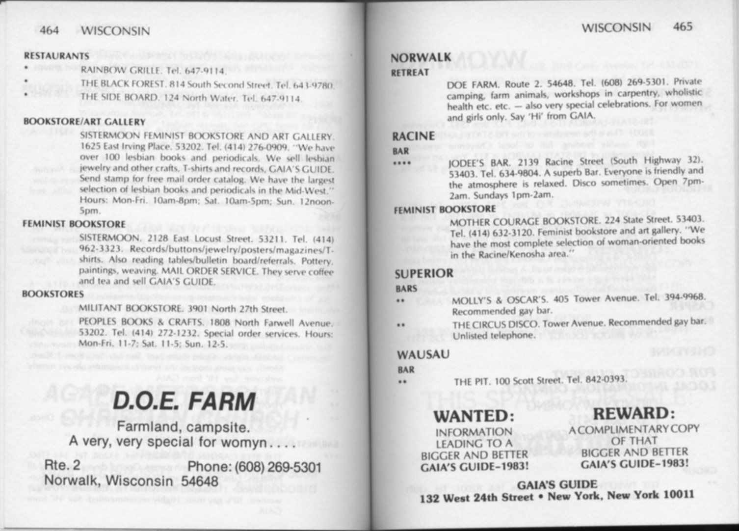 (Only part of the first issue of this locally/ Milwaukee-produced publication has been located, and only the inside pages: pages 1 thru 6 and 35-40 are missing; but the section that survives provides a rare glimpse of the city's gay life at that time: an accurate local listing of organizations and businesses, informational text about many of the bars, plus rare photos of the interiors of many bars. Additional issues anyone is able to locate are welcome!)