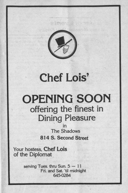 Advertisement: Chef Lois of Shadows Diplomat restaurant