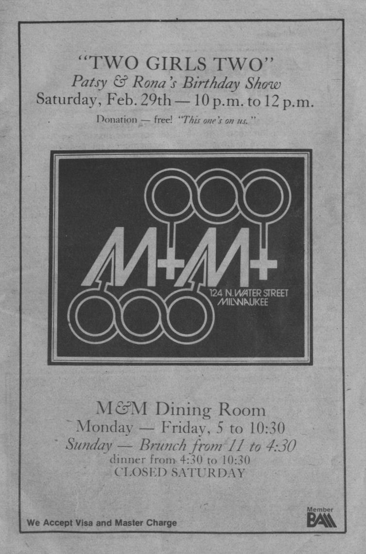 Ad: M&M Club: Two Girls Two show for Patsy and Rona's birthday; and M&M Dining Room