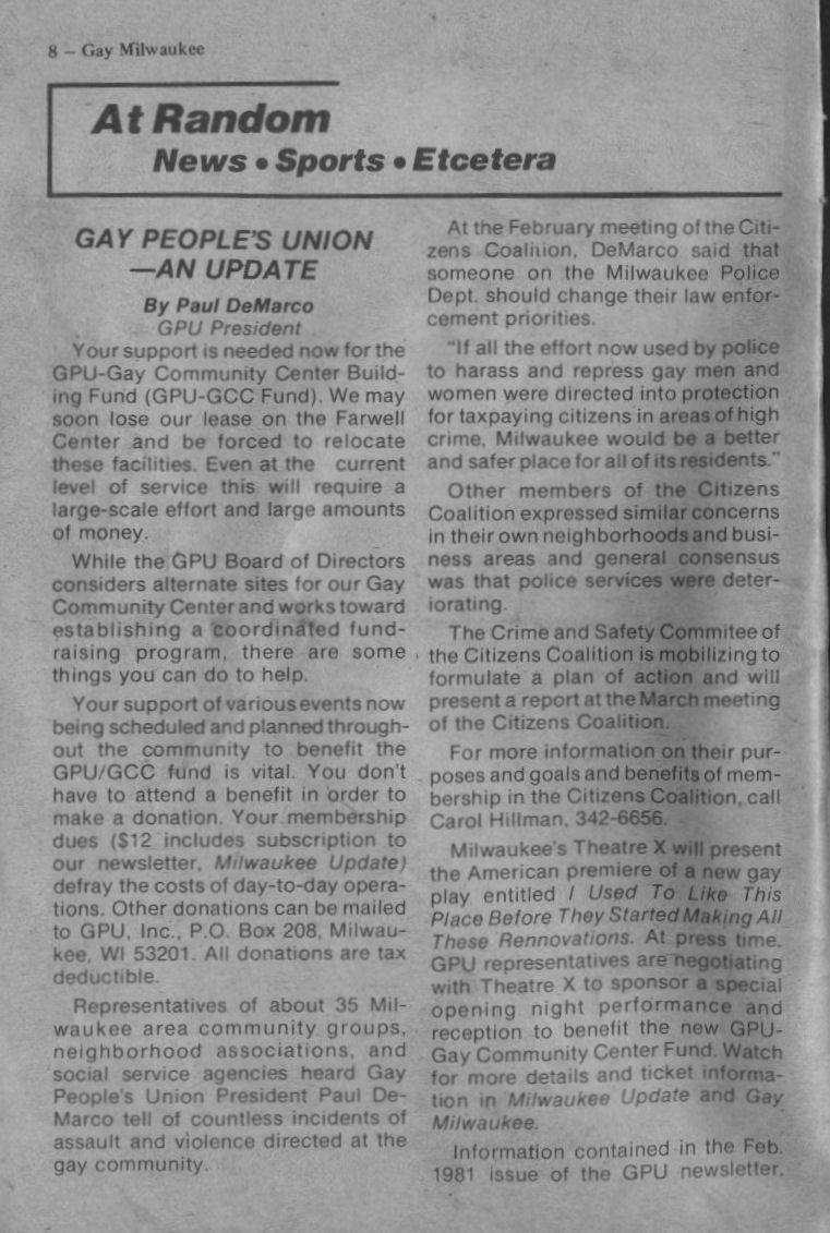 At Random: An update on Gay People's Union by GPU President Paul DeMarco: GPU about to lose lease on Farwell Center building