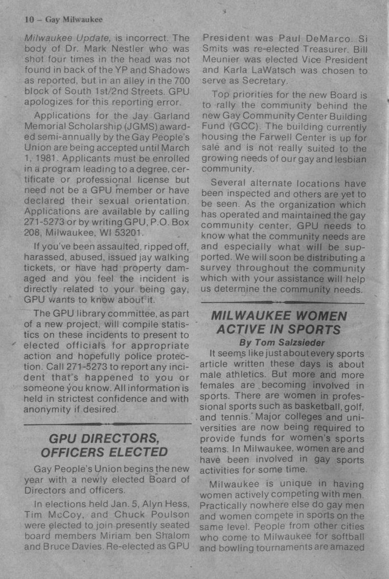 GPU elected Board of Directors and Officers: President: Paul DeMarco, Traseurer: Si Smits, Vice President: Bill Meunier, Secretary: Karla LaWatsch + Milwaukee women active in sports: Shirley and Joannine