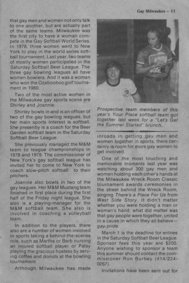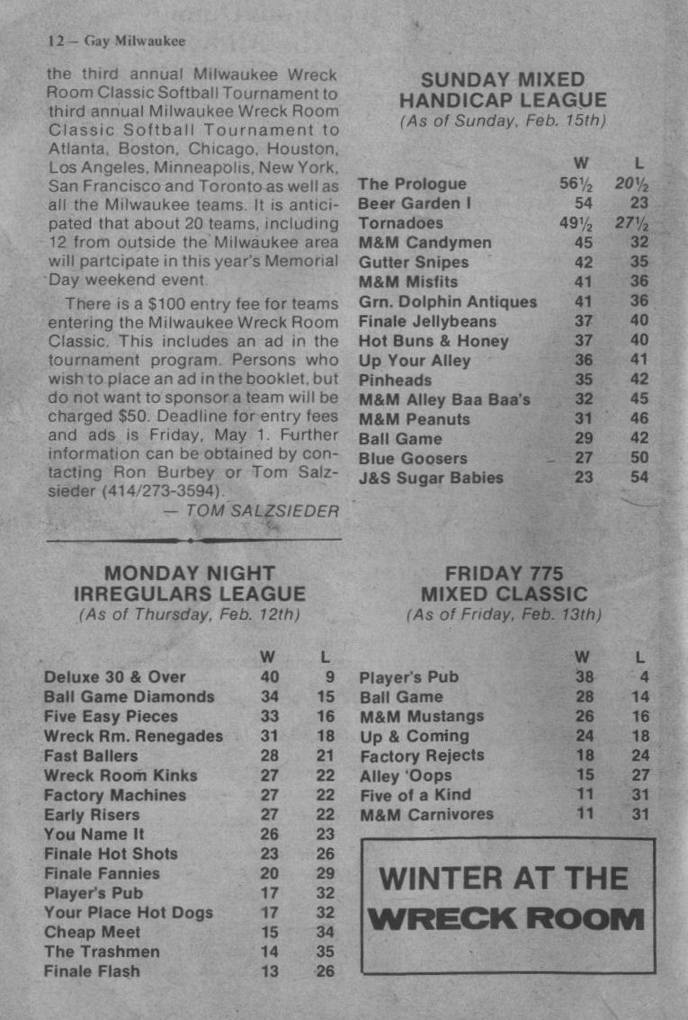 Sports cont.: plans for 3rd annual Milwaukee Wreck Room Classic Softball Tournament + sports standings