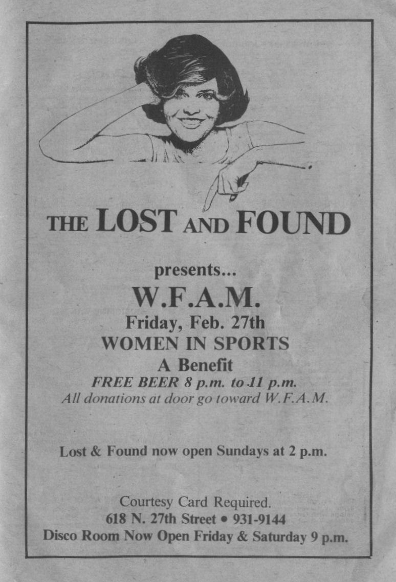 Ad: Lost & Found bar: WFAM, Women in Sports benefit