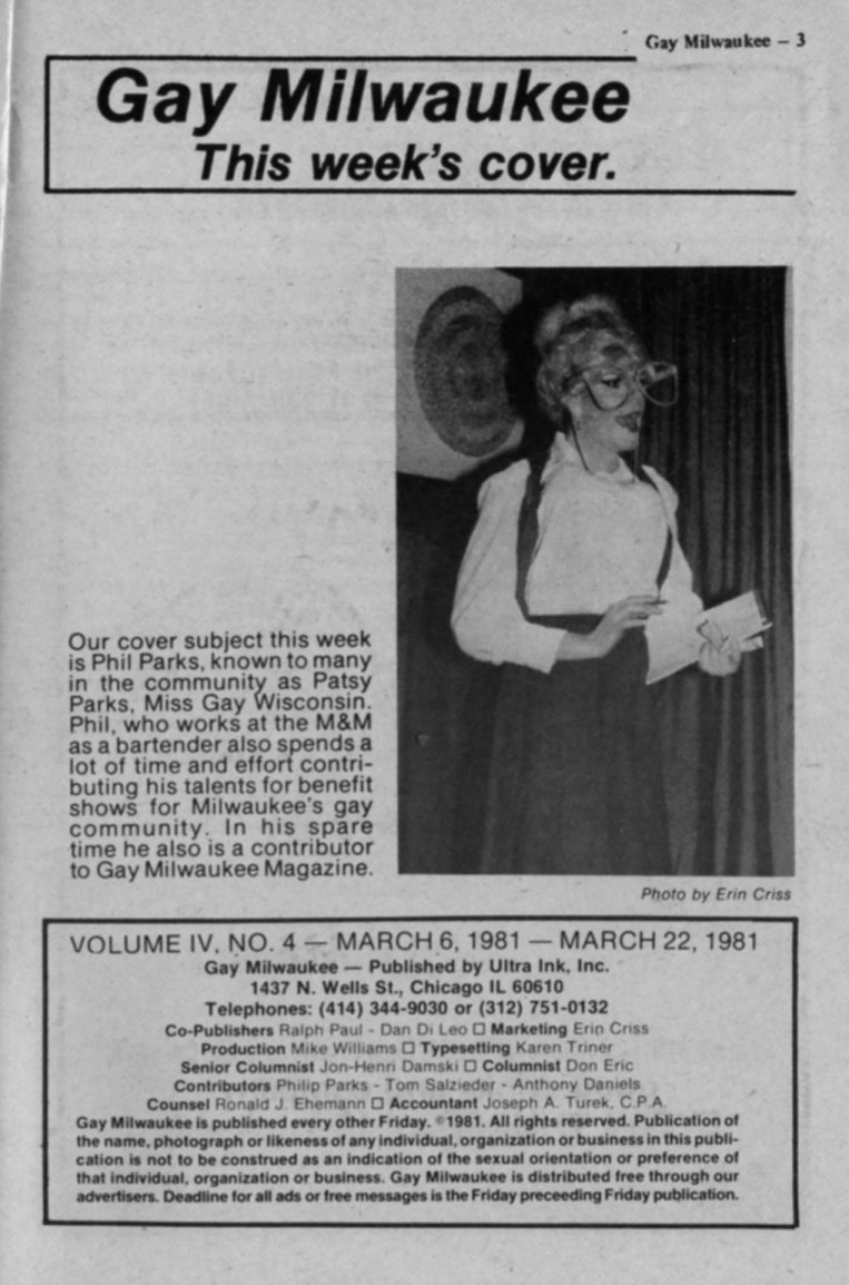 Masthead + Cover subject: Phil Parks, aka Patsy Parks