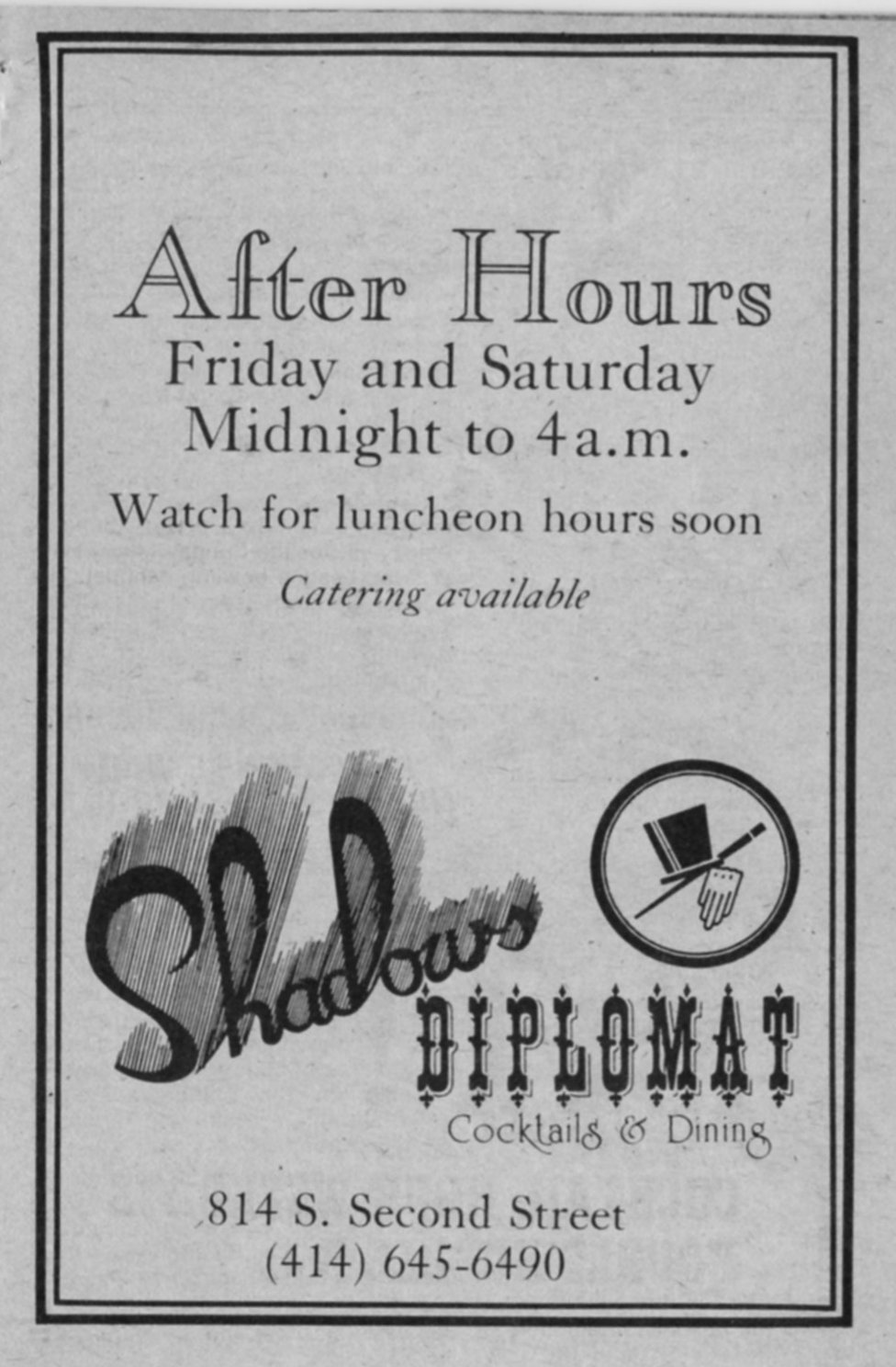 Advertisement for Shadows bar + restaurant