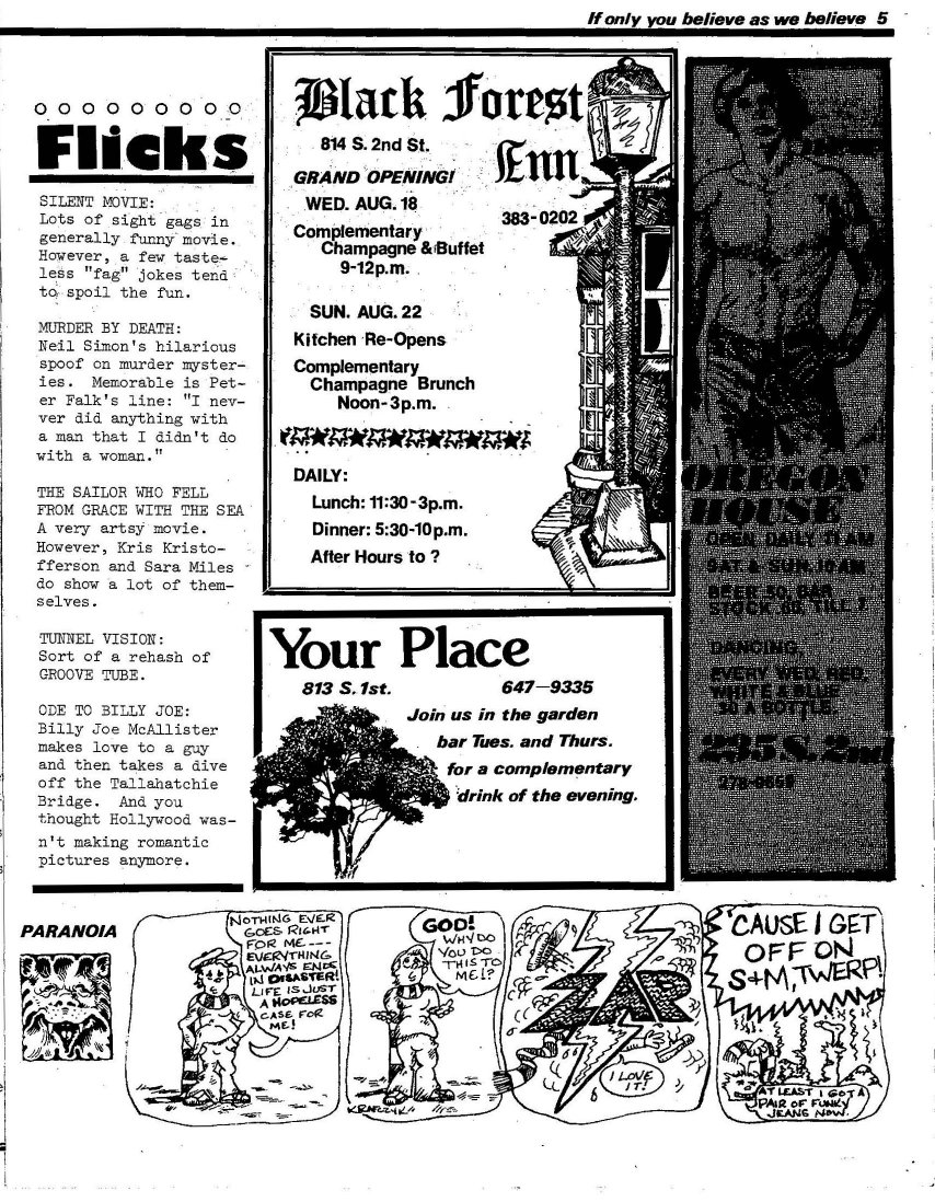 Flicks; + Ads for The Black Forest; Your Place; and Oregon House (page 5)