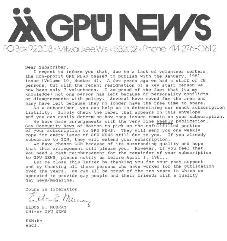 Cover Galleries: The Gay Peoples Union (GPU) was founded in 1971 as a social service agency dedicated to the needs of the gay community, and concurrently dedicated to educating the community at large about gays and lesbians. Its genesis was actually the Homosexual Freedom League at UWM, which become a non-university organization called the Gay Peoples Union. The GPU published both a newsletter (the Milwaukee Update) and a monthly periodical (GPU News). The Newsletter was an update for the membership of activities and events, while the GPU News attracted a wider circulation with its collection of news, stories, advertisements for local and regional businesses, etc. (See the Organization section for more information on the Milwaukee Update.) At first, GPU News was primarily Milwaukee based and focused, and published without copyright. However, within a few years the publication became nationally known and widely recognized as containing superior editorial and fictional content in a broad range of interests to the gay and lesbian community. In its heyday (the mid-late 1970's), the magazine received wide acclaim, every issue featuring complimentary "letters to the editor" from people around the country. It began to publish with a copyright, held by Liberation Publications in Milwaukee. Unfortunately, late in 1980 the magazine's volunteer base to compile and lay out the publication was severely compromised; and with regret the publisher, Eldon Murray, announced that the January, 1981 issue (volume 10 number 4) would be the last. Open subscriptions were picked up by another publication, Gay Community News of Boston; and GPU News ceased to exist. Select pages, and all cover images, of the GPU News magazine issues are available online here via the "Cover Galleries" links above. Due to the historical significance of this publication, the entire collection has also been digitized by the University of Wisconsin system. Find out more at the UW Digital Collections, Gay People Union Collection info page. Click the "Browse textual materials" link, then the "Browse journal/series" link for a full list of all issues available to view online. Disclaimer-- Early issues of GPU News were published without copyright; full acknowledgement and gratitude to the publishers and authors for this foresight. Later issues were copyrighted by Liberation Publications. Reproduction of these publications is intended to document and honor those who made such early contributions to the community and with full desire to include proper credit. |