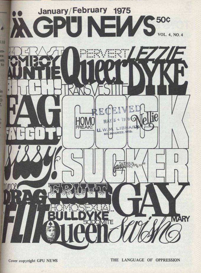 This Cover: "The Language of Oppression", designed by Bob Stocki; words used by society to put down gay people
