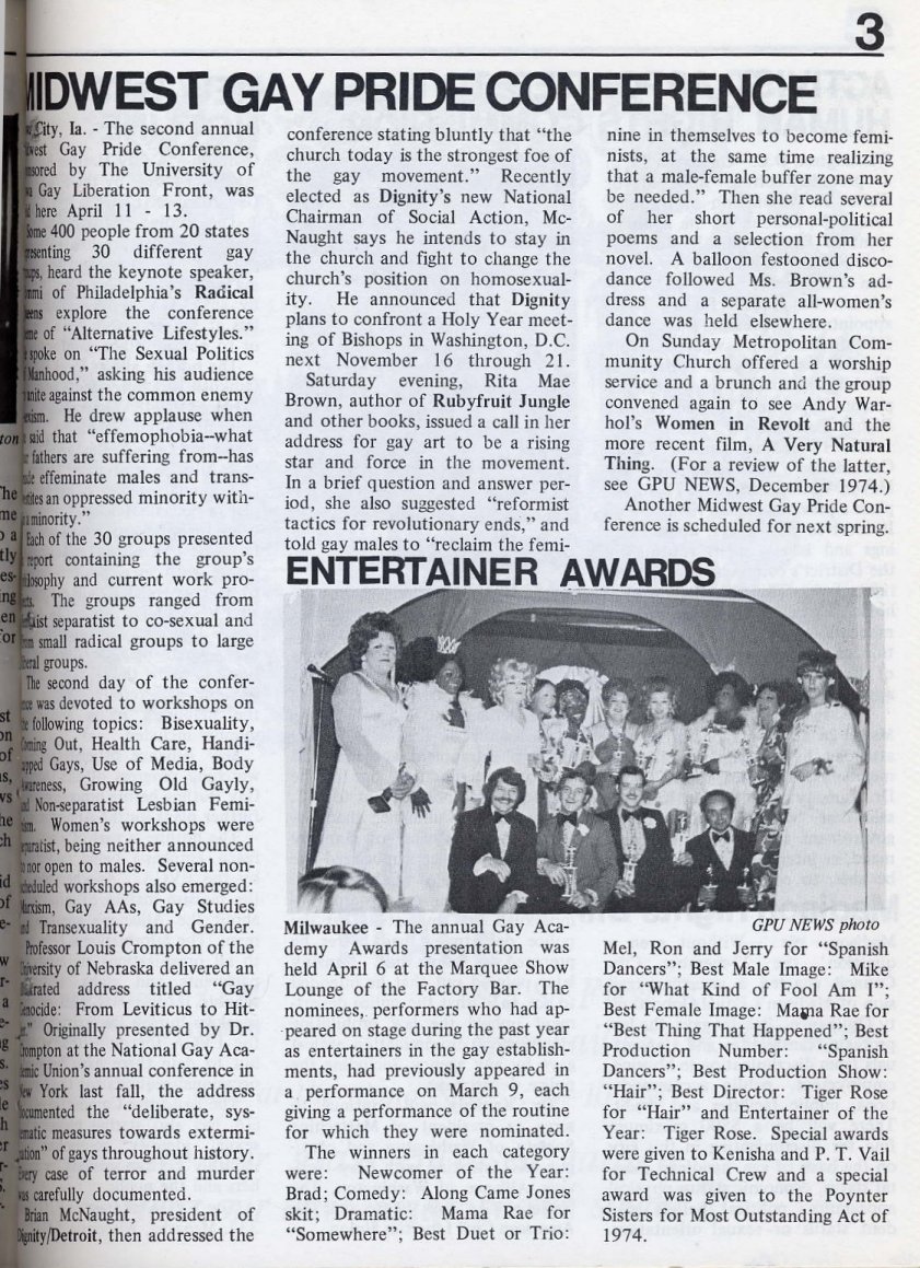 2nd annual Midwest Gay Pride Conference held; and Milw. Gay Academy Awards/ Entertainer Awards held in Marquee Show Lounge of the Factory: