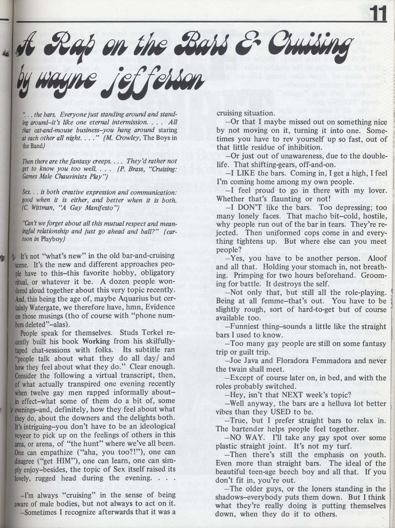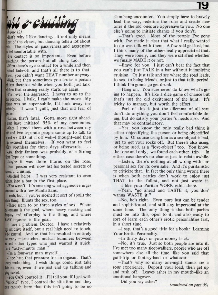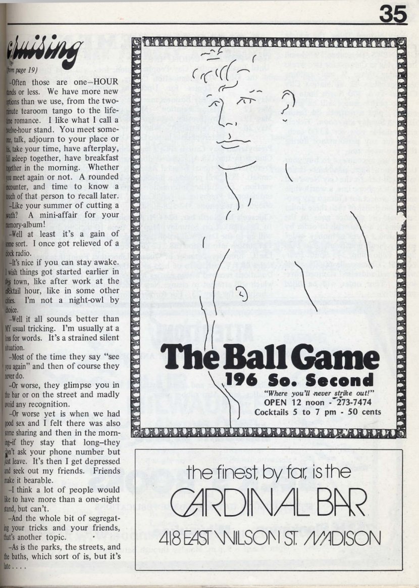 Bars and Cruising article, concluded; Ads for Ball Game & Cardinal Bar (Madison)