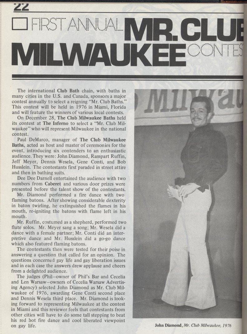 Mr. Club Milwaukee contest held at the Inferno for local Club Bath chain franchise. Paul DeMarco, manager of Club Milwaukee baths, acted as host and master of ceremonies. Dee Dee Darnell entertained with two numbers from "Cabaret". Judges were Phil (owner of Phil's Bar) and Cecelia and Len Warsaw (owners of Cecelia Warsaw Advertising).