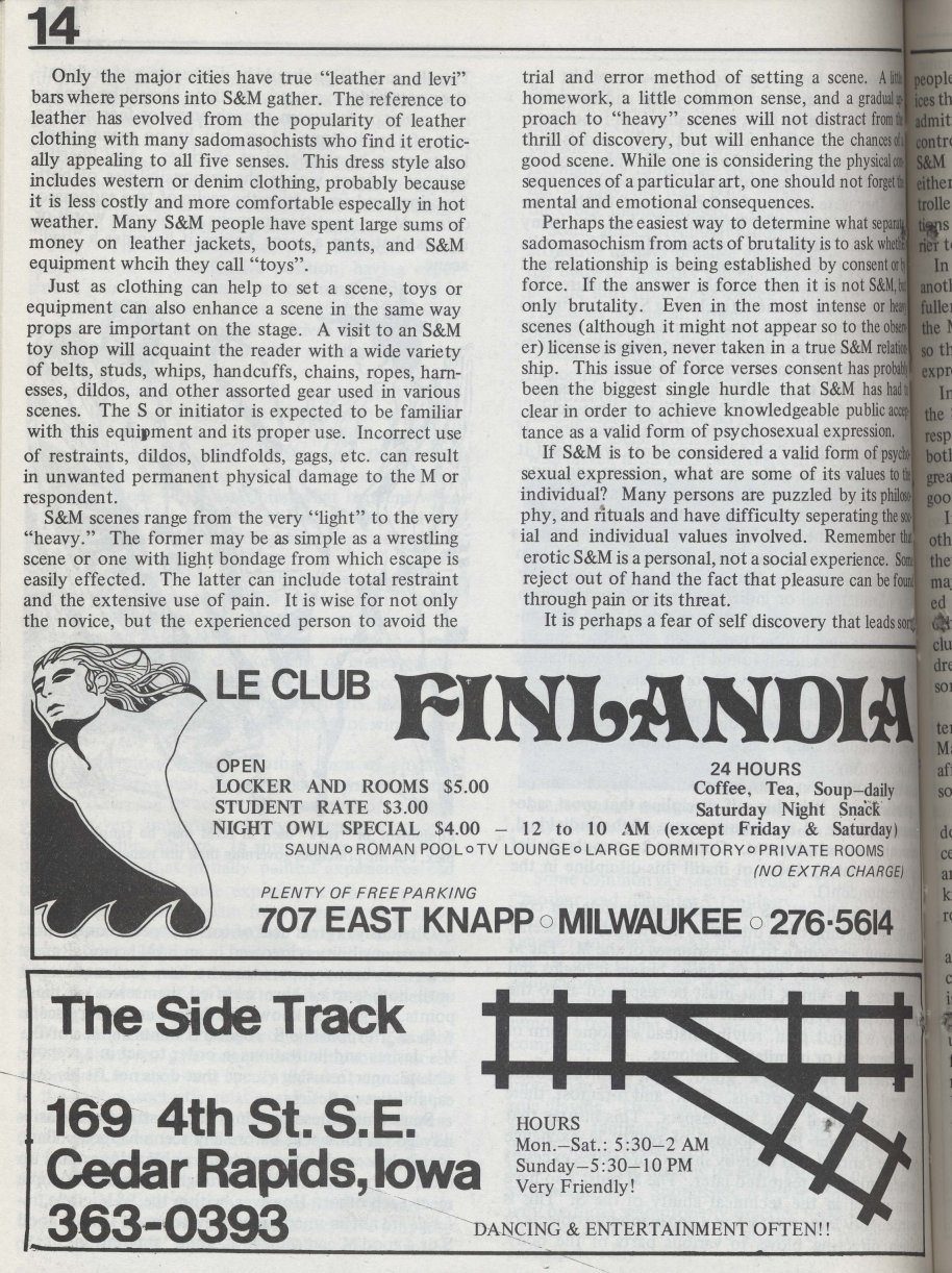 Erotic S&M article continues; also, Advertisement: Club Finlandia