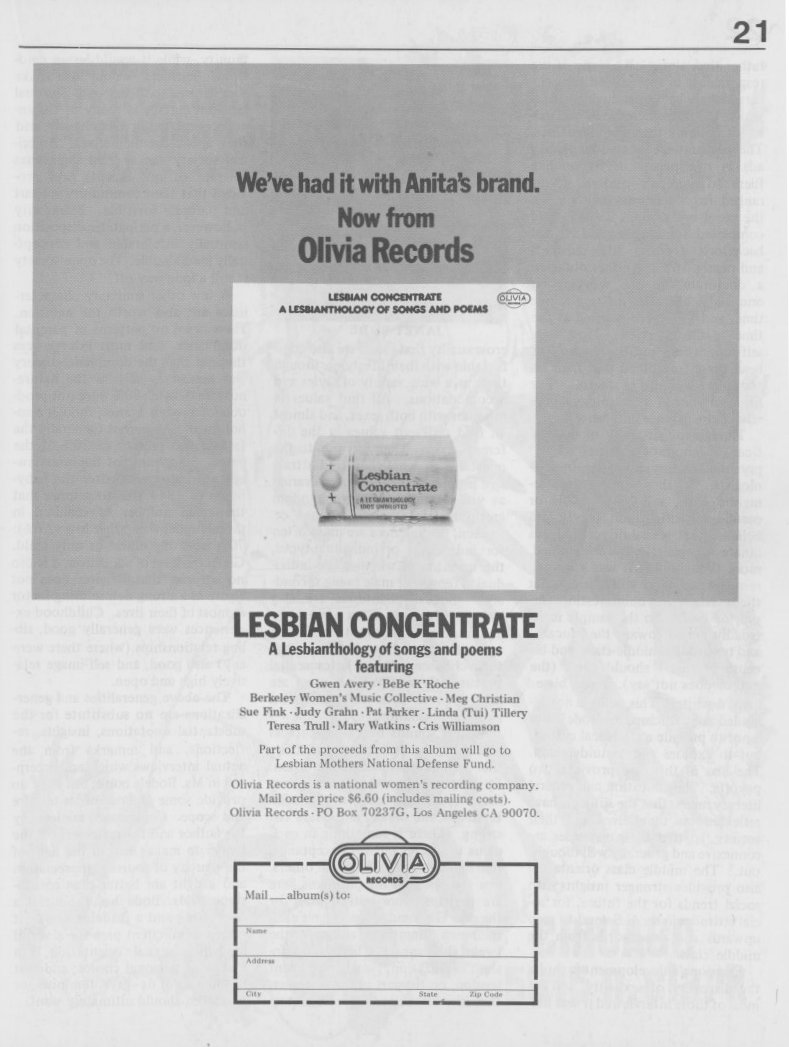 Advertisement for Olivia Records release of "Lesbian Concentrate"