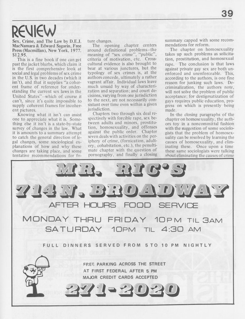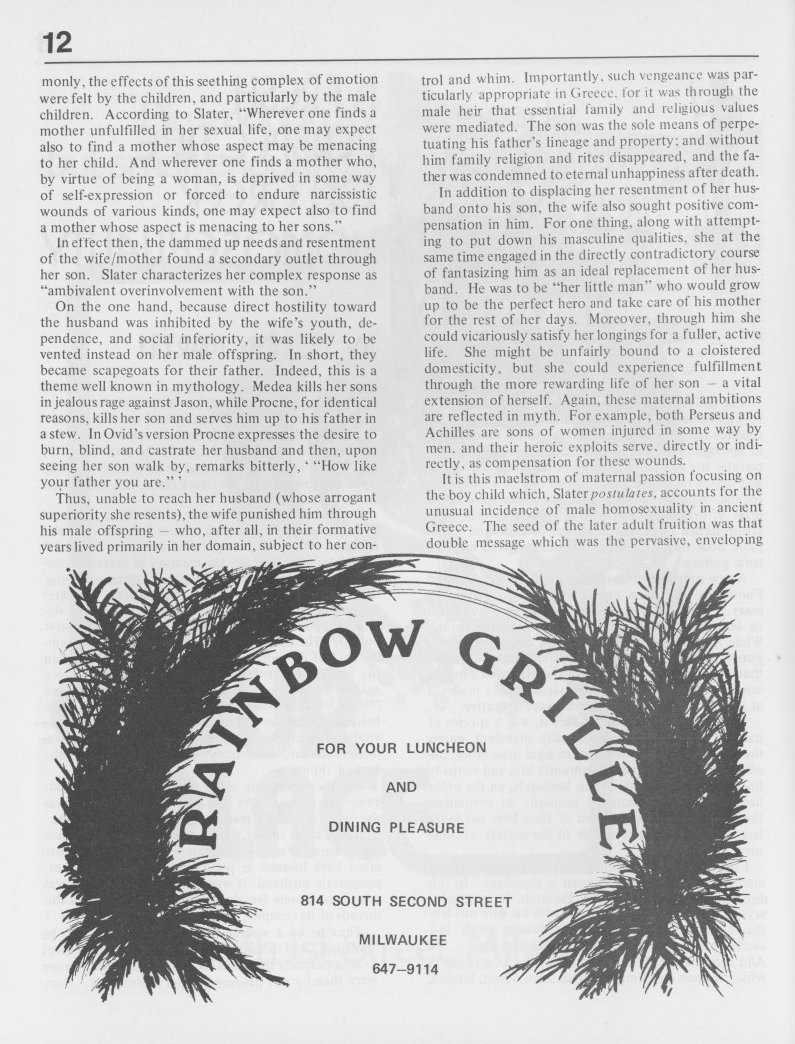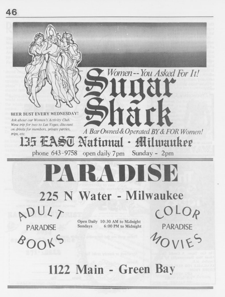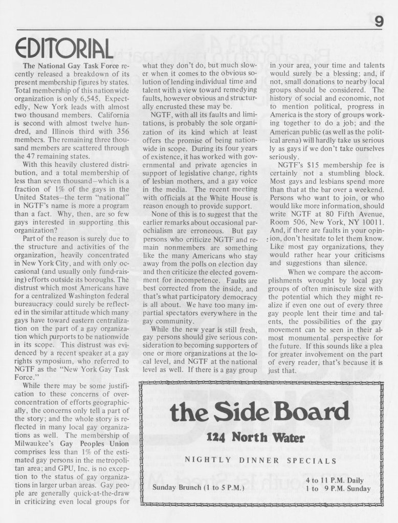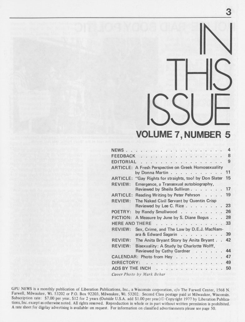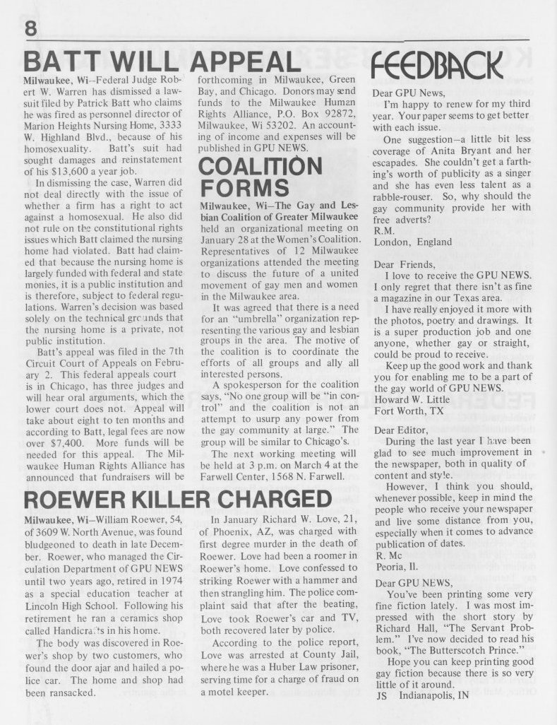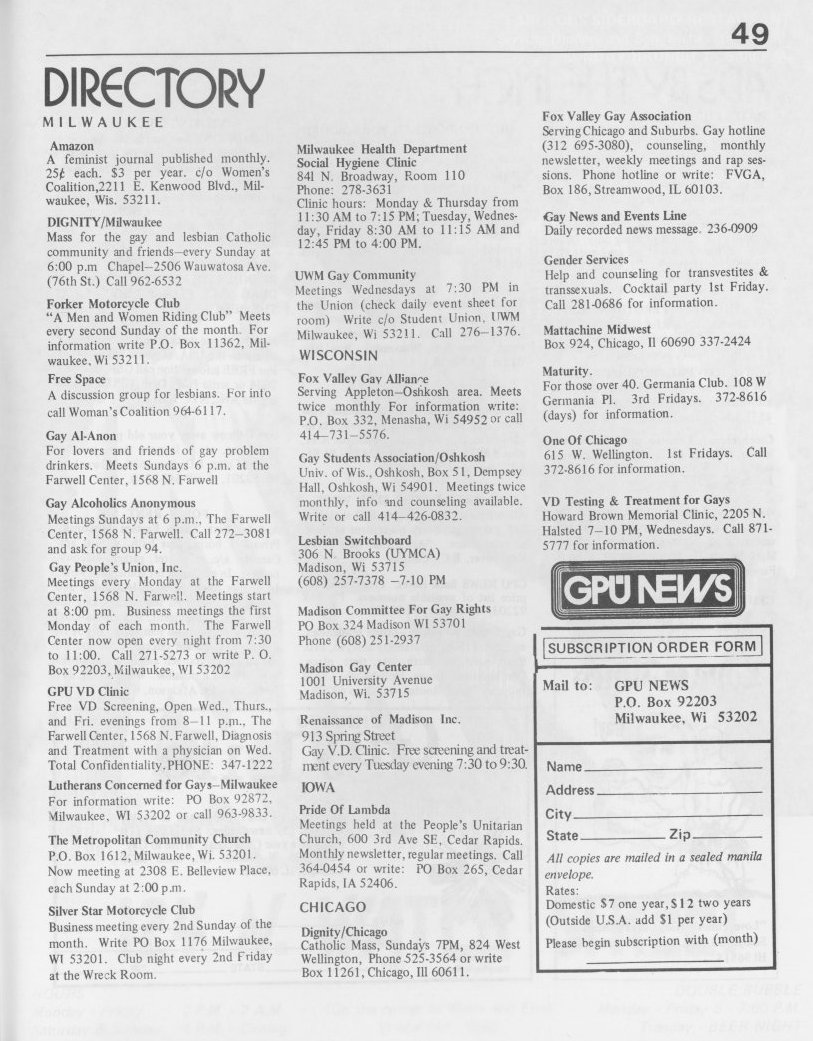 Note: The GPU News was nationally distributed, and included a high percentage of general content: gay and lesbian news from other cities and states, original fiction, stories, and poetry, etc. The excerpts presented here are concentrated on local interest (Milwaukee and Wisconsin). Those so inclined are encouraged to visit the UWM Libraries- Special Collections Department in Milwaukee to view the complete issues, which include all of the general interest materials not included here.