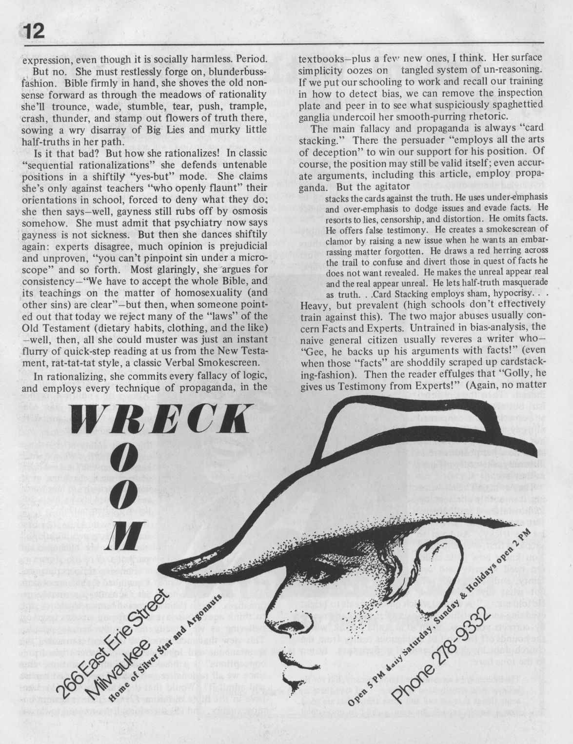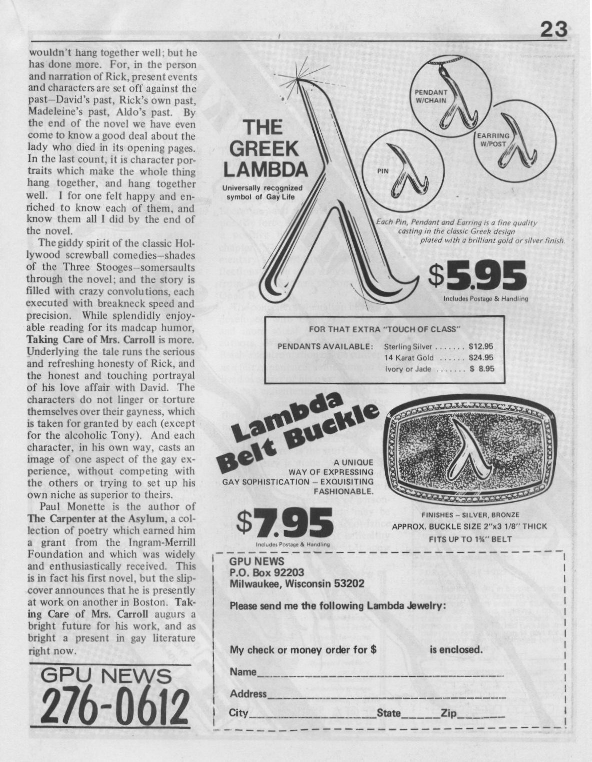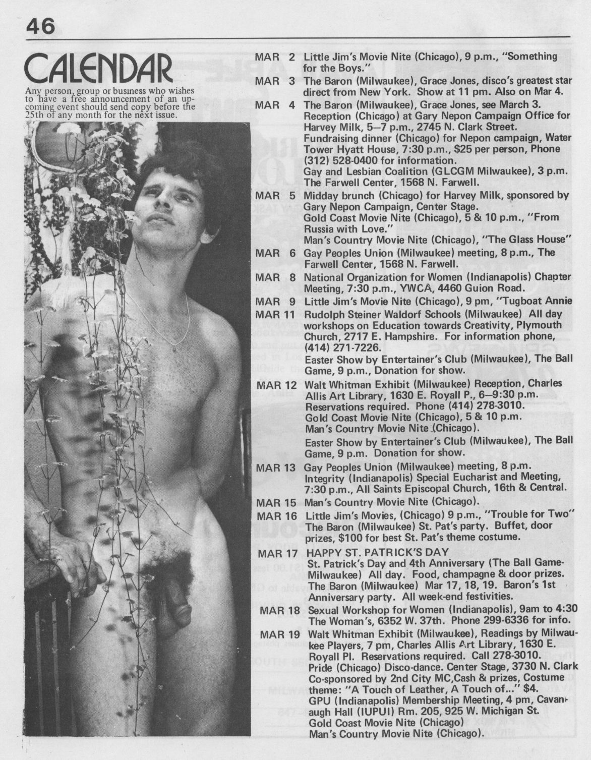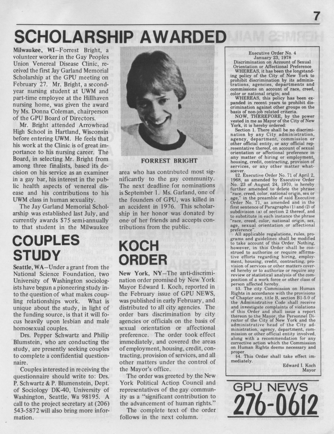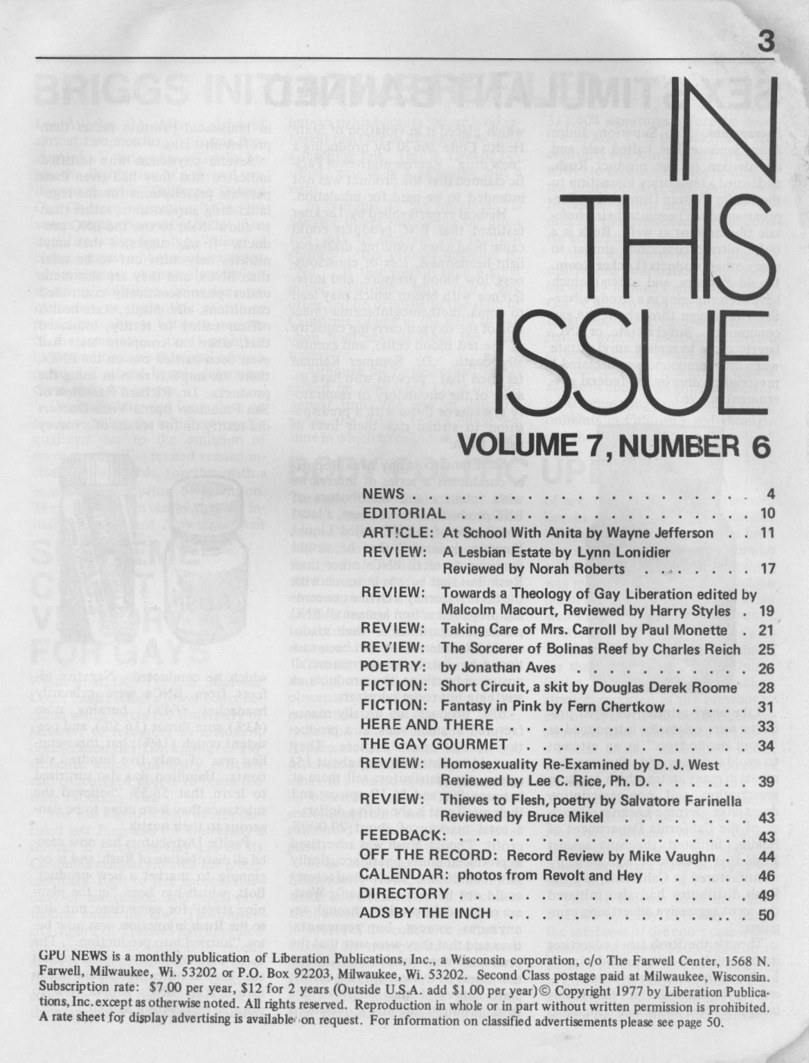 Note: The GPU News was nationally distributed, and included a high percentage of general content: gay and lesbian news from other cities and states, original fiction, stories, and poetry, etc. The excerpts presented here are concentrated on local interest (Milwaukee and Wisconsin). Those so inclined are encouraged to visit the UWM Libraries- Special Collections Department in Milwaukee to view the complete issues, which include all of the general interest materials not included here.