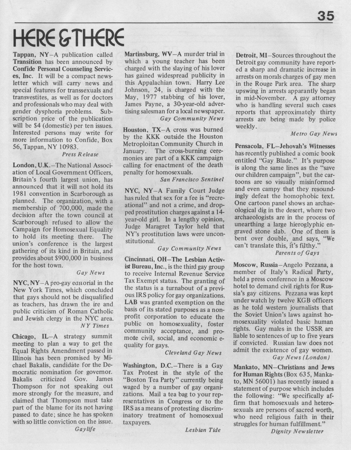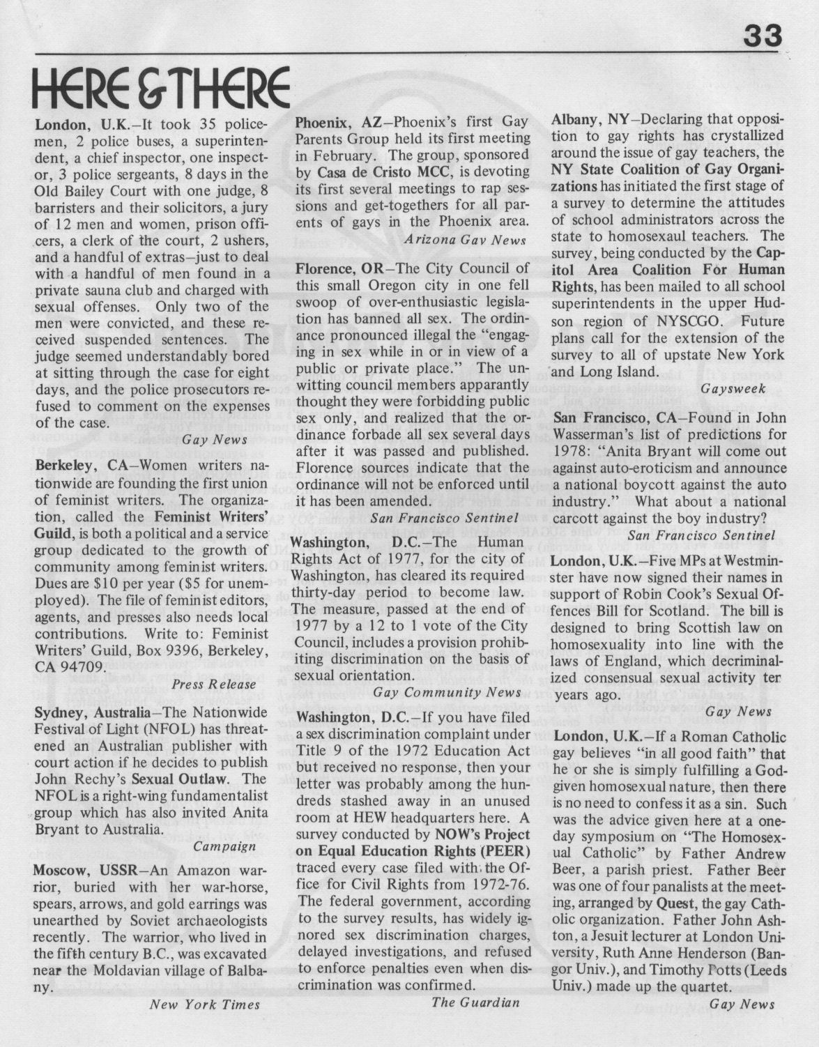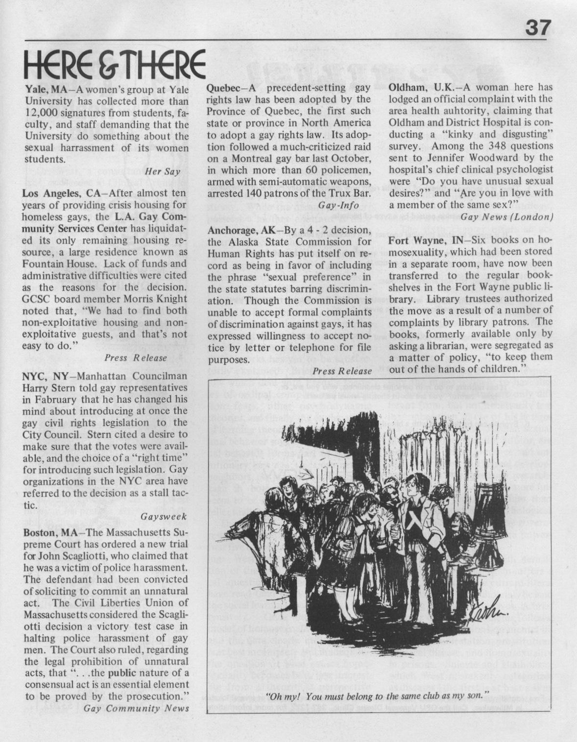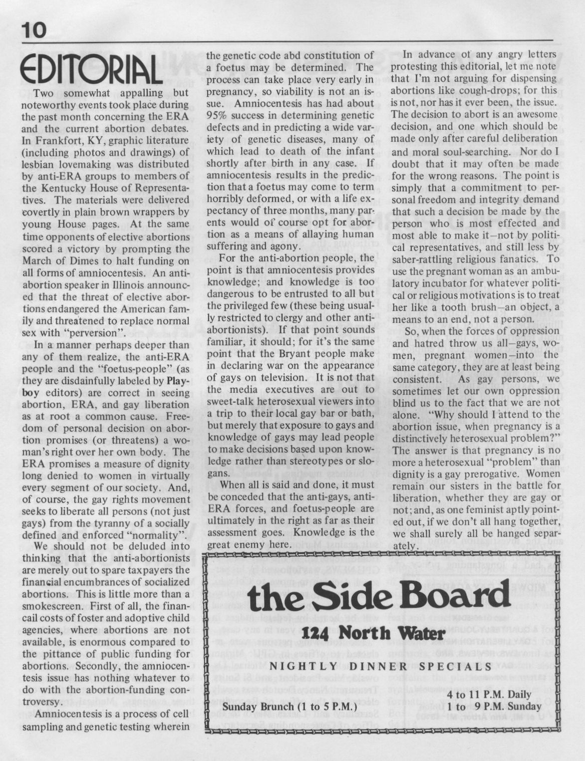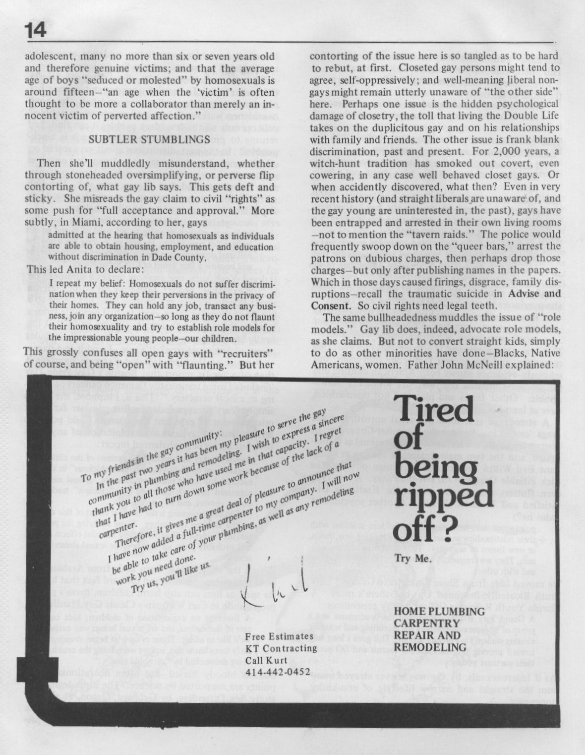 Note: The GPU News was nationally distributed, and included a high percentage of general content: gay and lesbian news from other cities and states, original fiction, stories, and poetry, etc. The excerpts presented here are concentrated on local interest (Milwaukee and Wisconsin). Those so inclined are encouraged to visit the UWM Libraries- Special Collections Department in Milwaukee to view the complete issues, which include all of the general interest materials not included here.