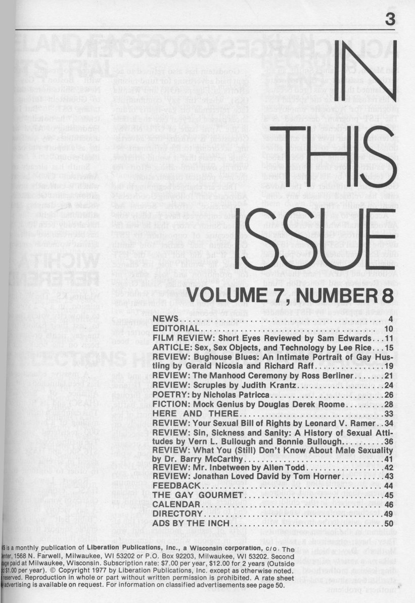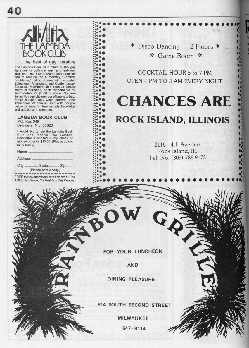 Note: The GPU News was nationally distributed, and included a high percentage of general content: gay and lesbian news from other cities and states, original fiction, stories, and poetry, etc. The excerpts presented here are concentrated on local interest (Milwaukee and Wisconsin). Those so inclined are encouraged to visit the UWM Libraries- Special Collections Department in Milwaukee to view the complete issues, which include all of the general interest materials not included here.