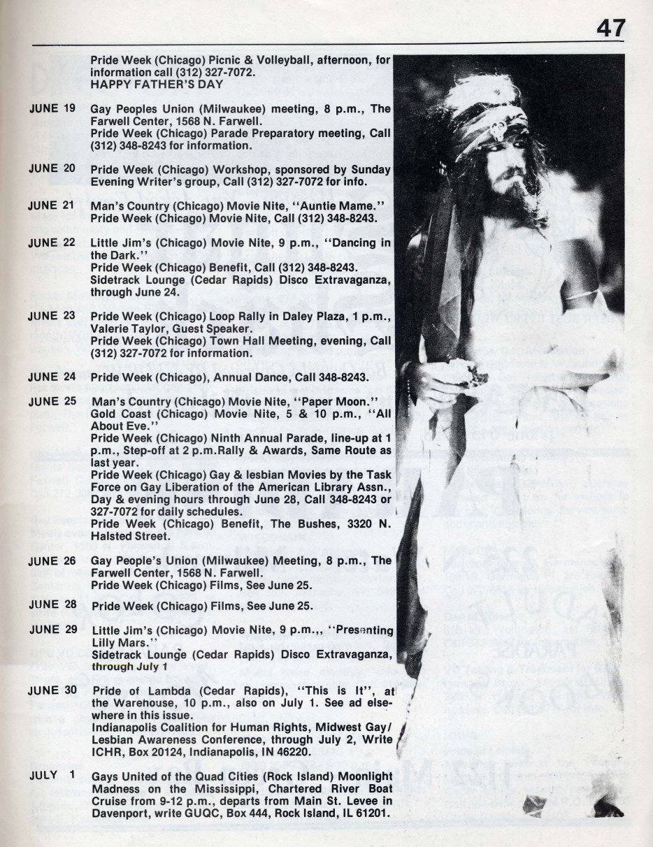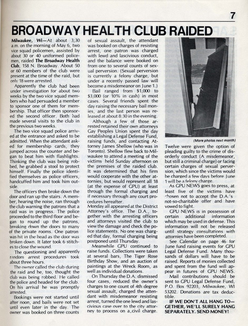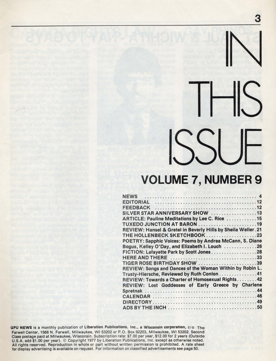 Note: The GPU News was nationally distributed, and included a high percentage of general content: gay and lesbian news from other cities and states, original fiction, stories, and poetry, etc. The excerpts presented here are concentrated on local interest (Milwaukee and Wisconsin). Those so inclined are encouraged to visit the UWM Libraries- Special Collections Department in Milwaukee to view the complete issues, which include all of the general interest materials not included here.