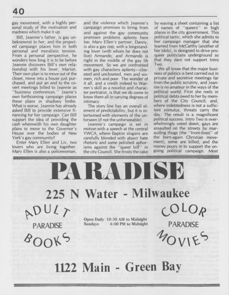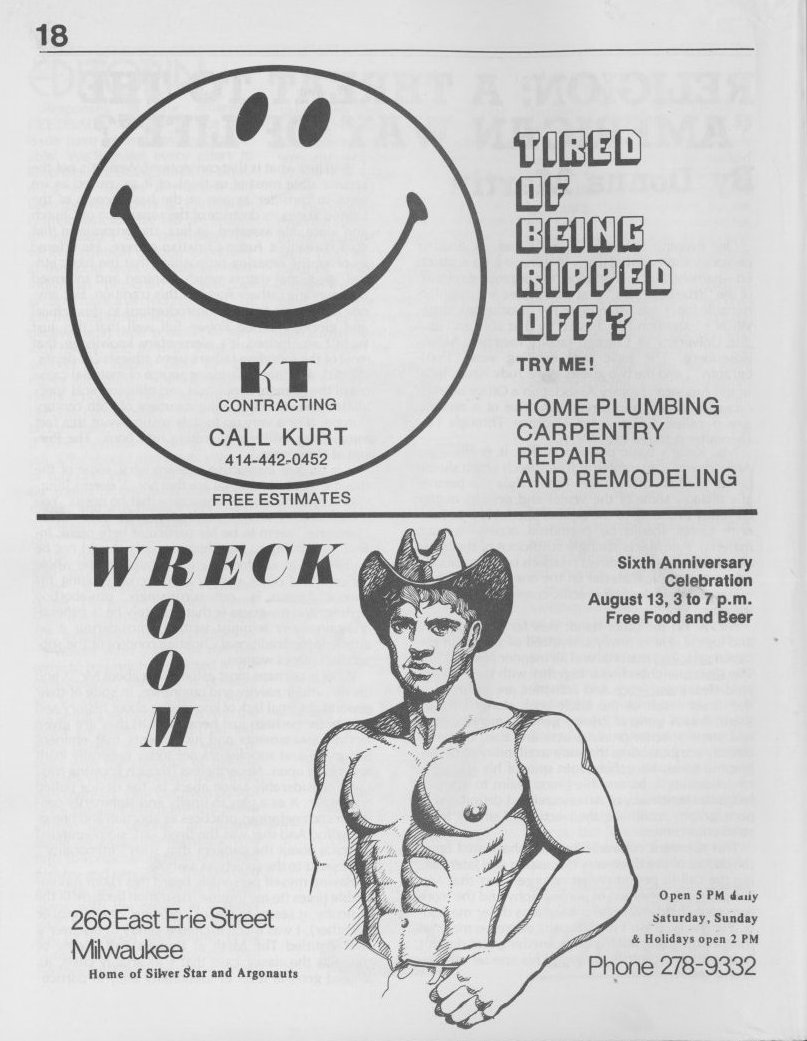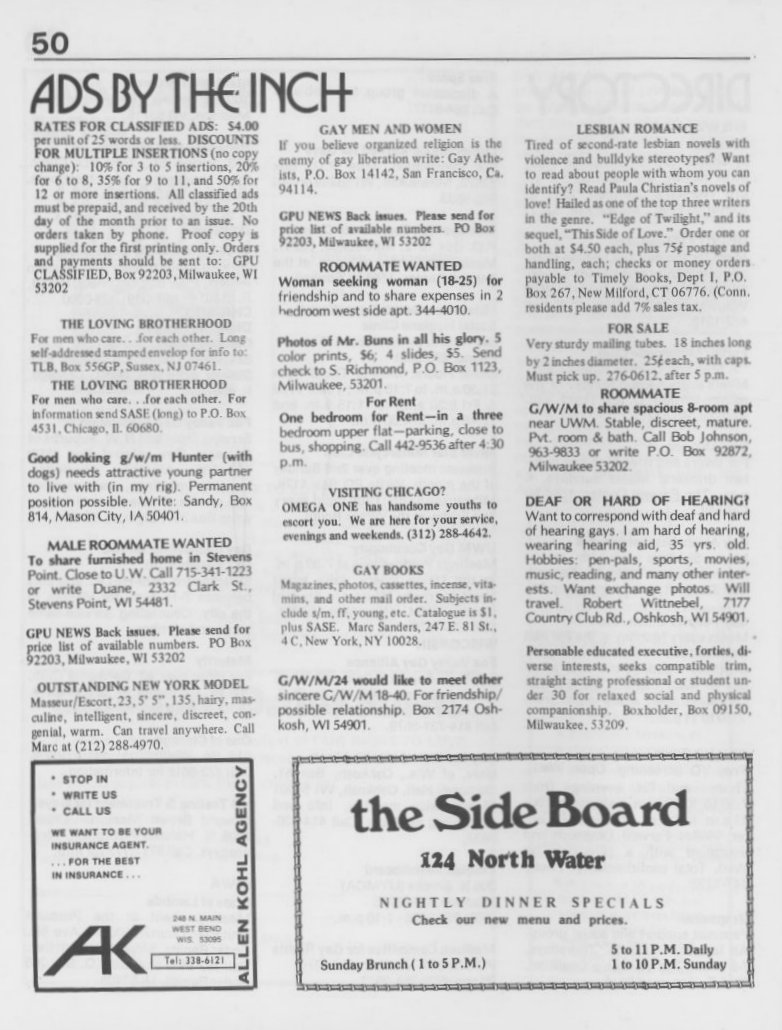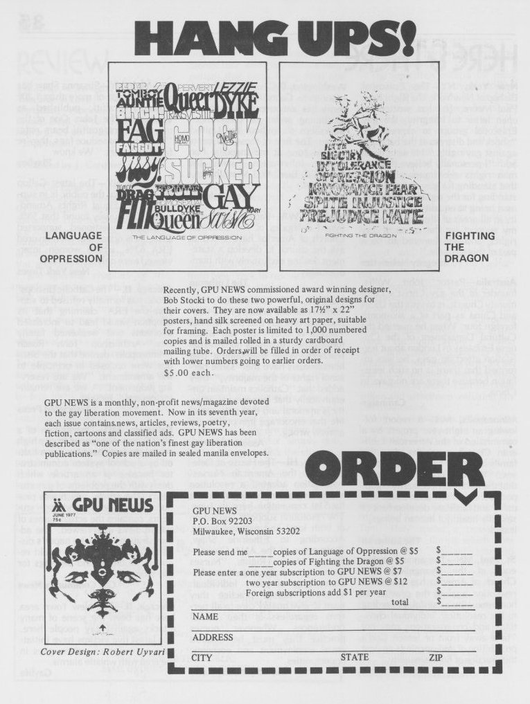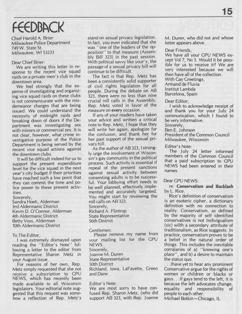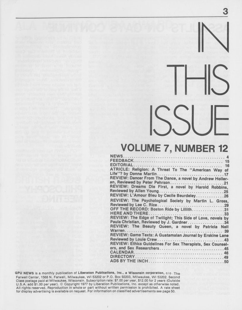 Note: The GPU News was nationally distributed, and included a high percentage of general content: gay and lesbian news from other cities and states, original fiction, stories, and poetry, etc. The excerpts presented here are concentrated on local interest (Milwaukee and Wisconsin). Those so inclined are encouraged to visit the UWM Libraries- Special Collections Department in Milwaukee to view the complete issues, which include all of the general interest materials not included here.