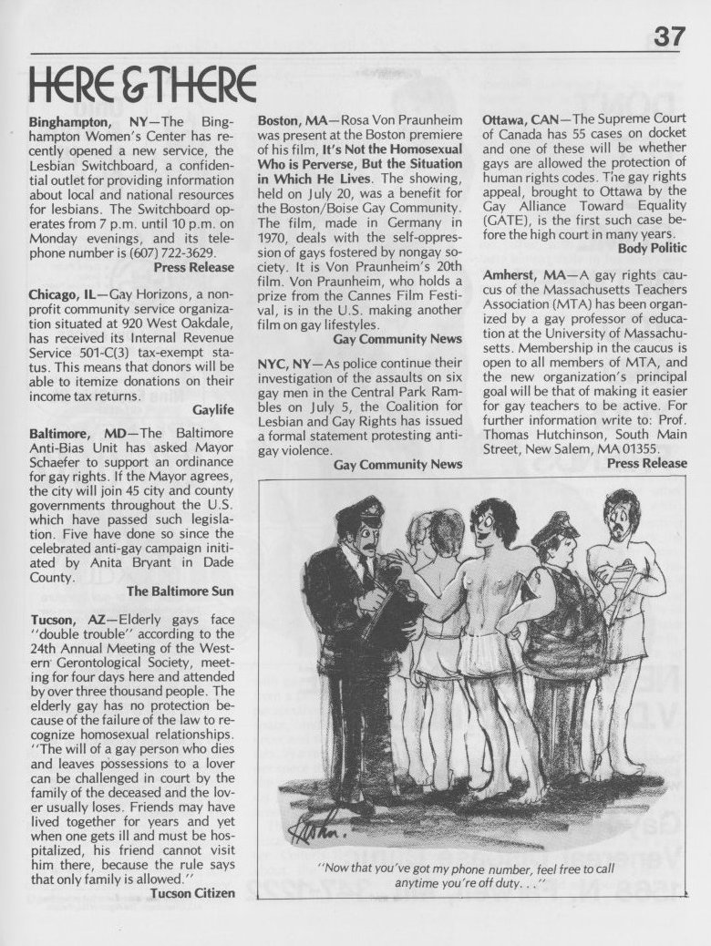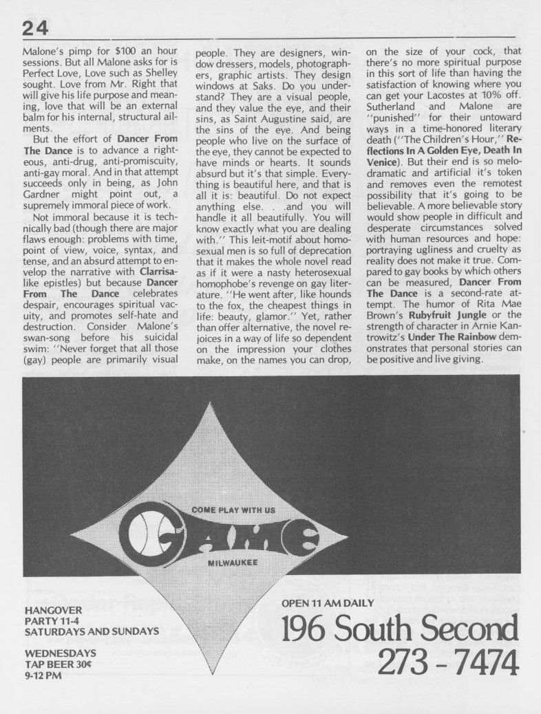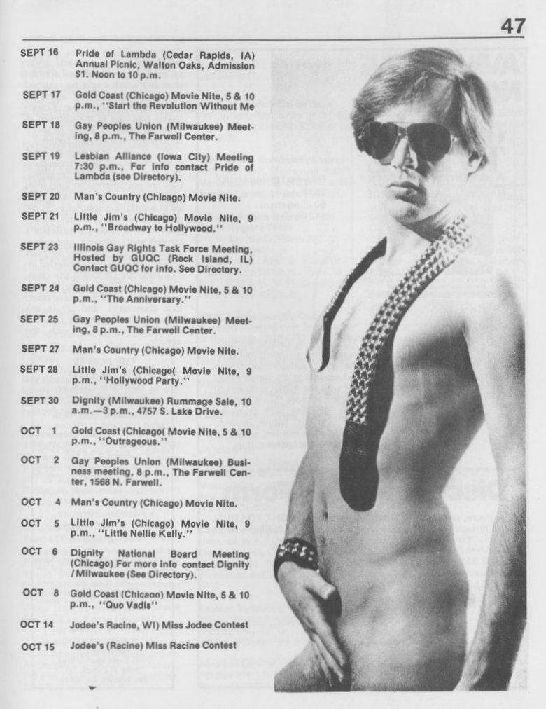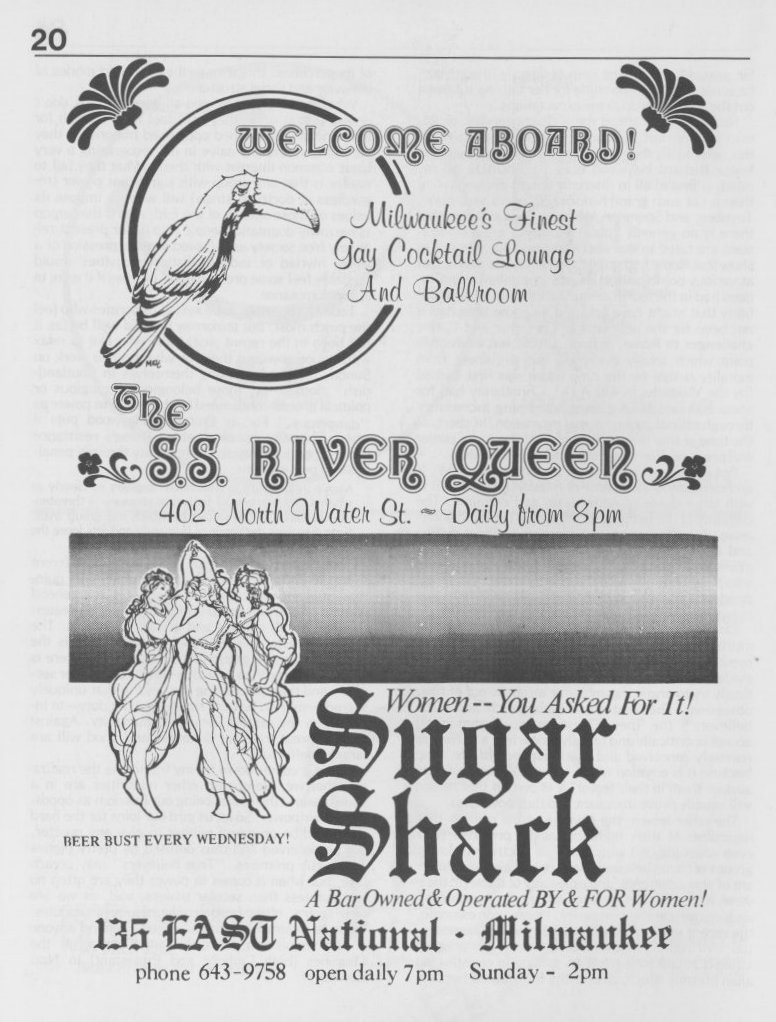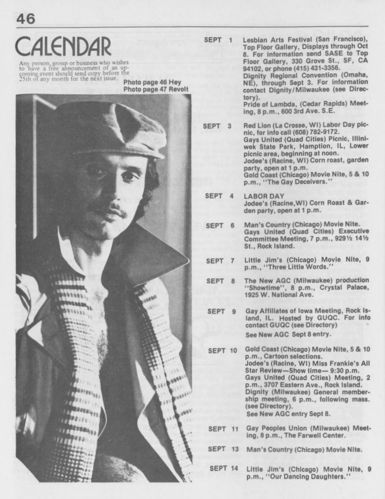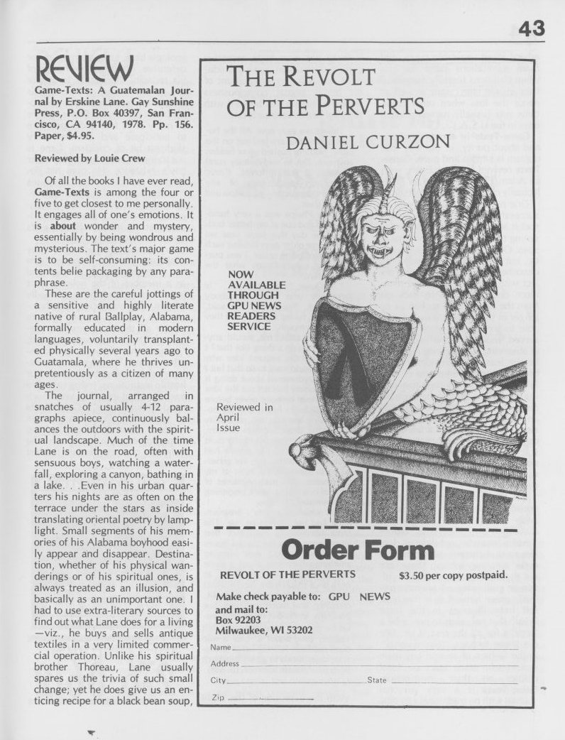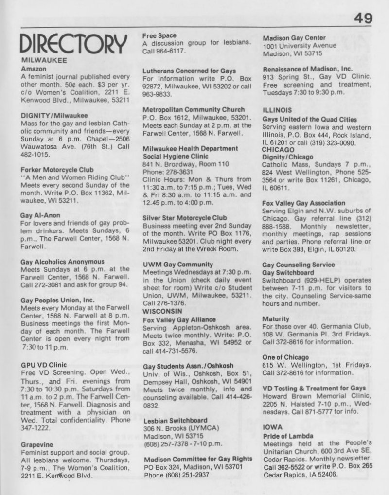 Note: The GPU News was nationally distributed, and included a high percentage of general content: gay and lesbian news from other cities and states, original fiction, stories, and poetry, etc. The excerpts presented here are concentrated on local interest (Milwaukee and Wisconsin). Those so inclined are encouraged to visit the UWM Libraries- Special Collections Department in Milwaukee to view the complete issues, which include all of the general interest materials not included here.
