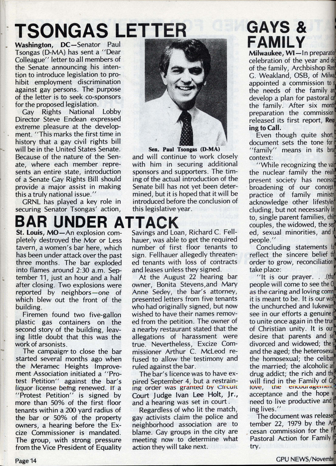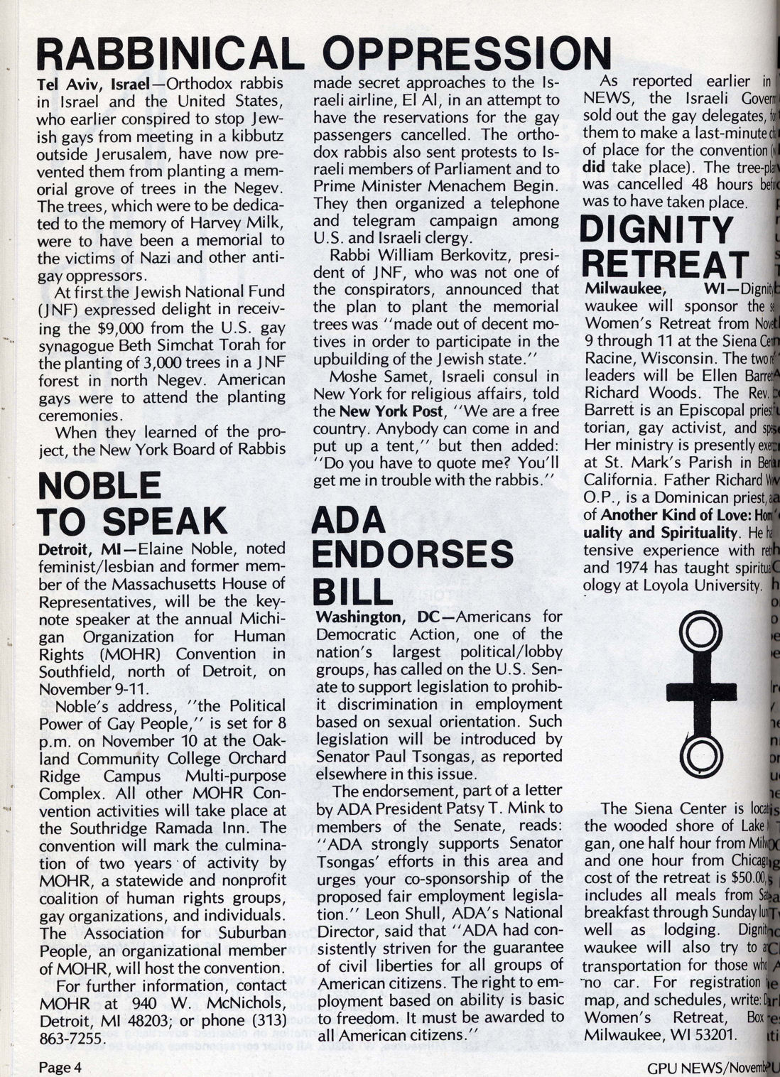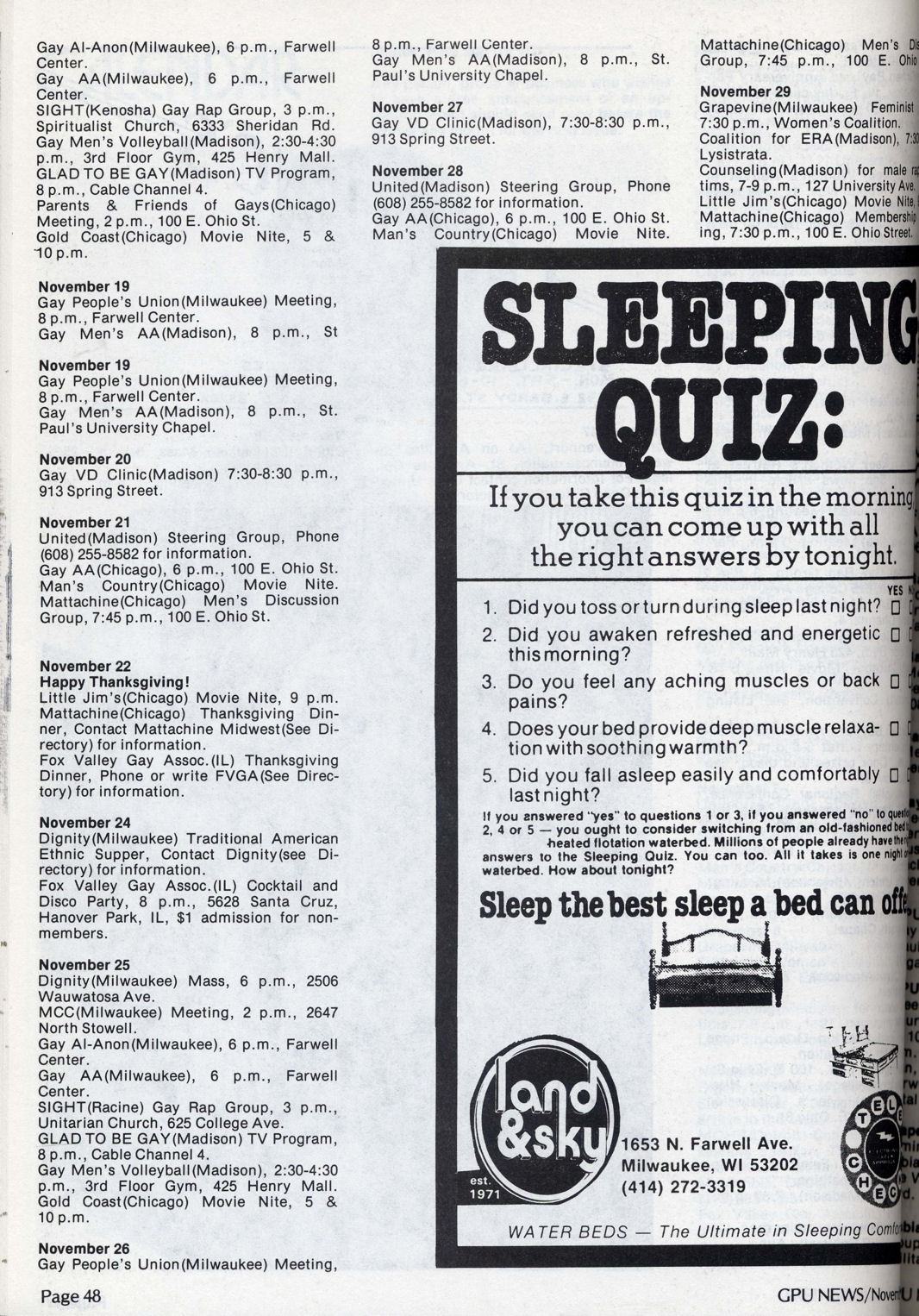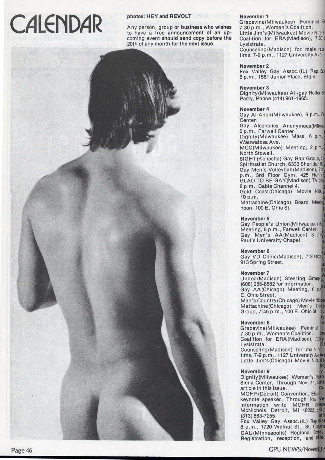 Note: The GPU News was nationally distributed, and included a high percentage of general content: gay and lesbian news from other cities and states, original fiction, stories, and poetry, etc. The excerpts presented here are concentrated on local interest (Milwaukee and Wisconsin). Those so inclined are encouraged to visit the UWM Libraries- Special Collections Department in Milwaukee to view the complete issues, which include all of the general interest materials not included here. <--Excerpts from Previous issue Excerpts from Next issue--> Return to GPU News cover gallery. Credits: Later covers and content of GPU News copyrighted; | |||||||||||||||||||||||||||||