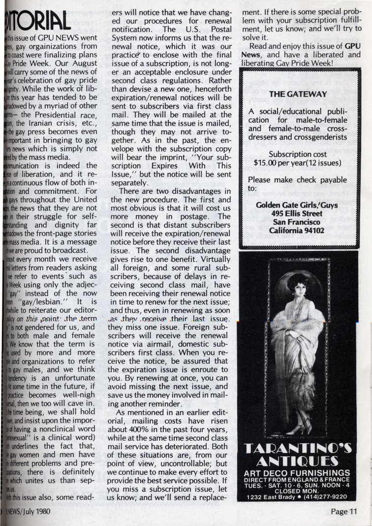 Editorial: historical use of term "gay" to refer to both gay men and lesbians + Advertisement for Tarantino Antiques (page 11)