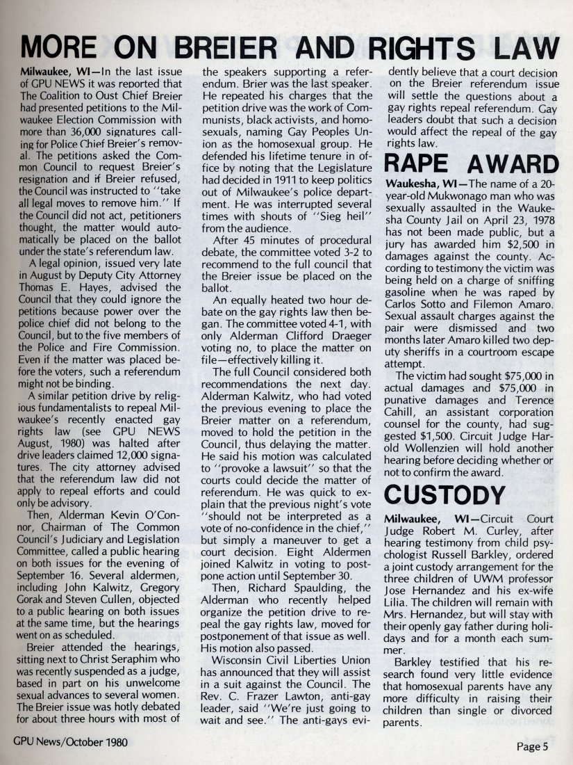 Petition to oust Police Chief Harold Breier collects 36,000 signatures, but is ignored; Man raped in Waukesha County jail awards $2,500; Gay father (Prof. Jose Hernandez) wins joint custody of his 3 children