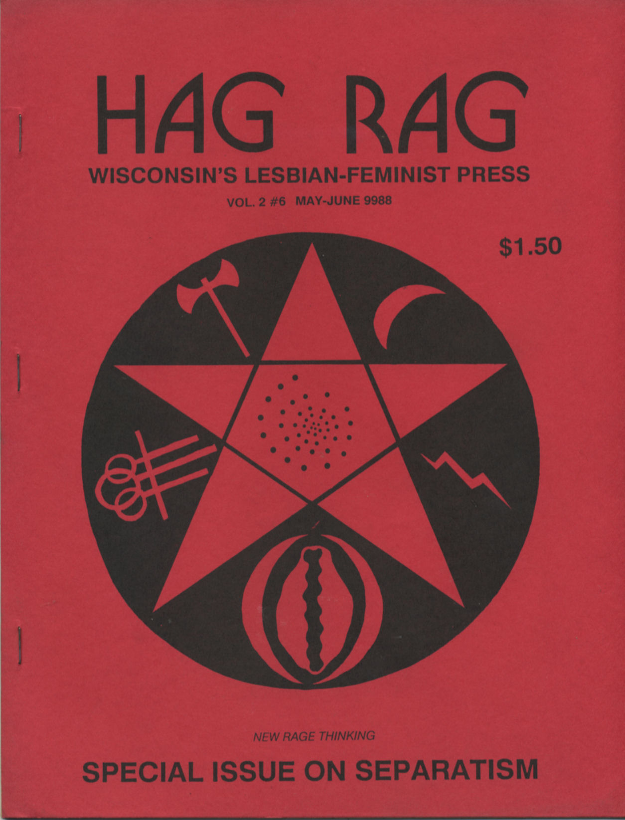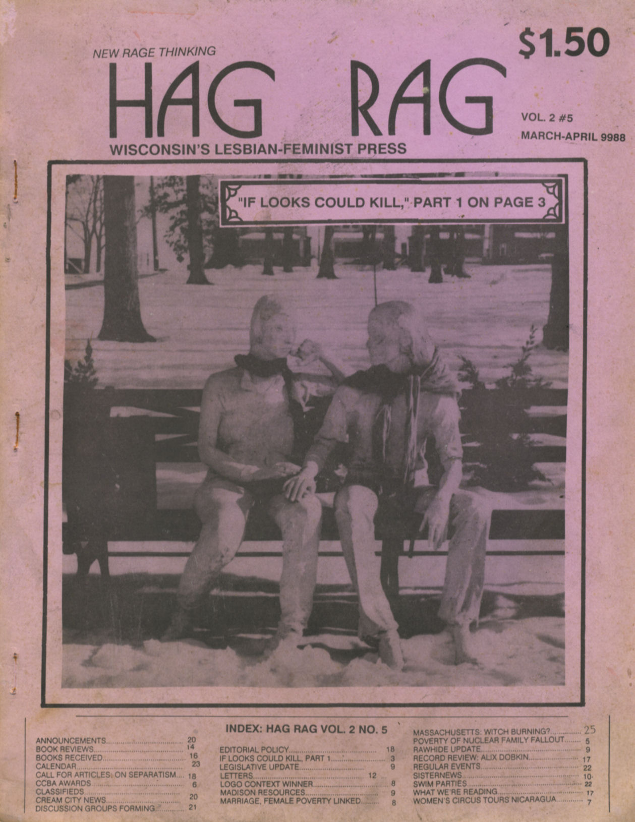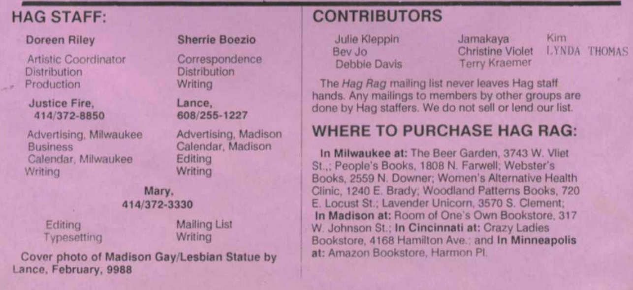 According to an ad placed in Wisconsin Light, Hag Rag was "Wisconsin's lesbian-feminist newspaper; a bi-monthly publication which focuses on news, non-fiction, political analysis and commentary of interest to lesbians and radical feminists". They welcomed submissions dealing with racism, lesbophobia, separatism, class and economics, feminist analysis, the worldwide lesbian conspiracy, and linquistics. As of Feb. 1988, subscriptions were $9/year, "free to incarcerated dykes".