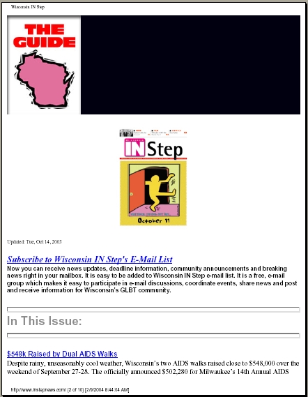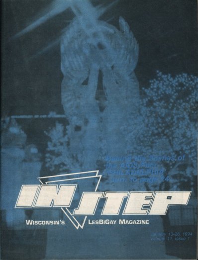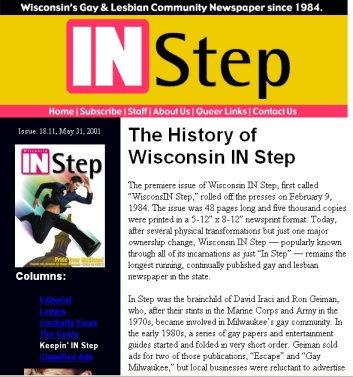 Read the History of In Step. Cover Galleries: (The following is largely condensed from "the History of InStep" (written by Jamakaya), with information abouts its demise at the very end of this article. See link above for more complete history prior to its demise.) The premiere issue of Wisconsin IN Step, first called WisconsIN Step, rolled off the presses on February 9, 1984. The issue was 48 pages long and five thousand copies were printed in a 5-1/2" x 8-1/2" newsprint format. Until its sudden demise, after several physical transformations but just one major ownership change, Wisconsin IN Step - popularly known through all of its incarnations as just "In Step" - was the longest running, continually published gay and lesbian newspaper in the state. In Step was the brainchild of David Iraci and Ron Geiman, who, after their stints in the Marine Corps and Army in the 1970s, became involved in Milwaukee’s gay community. In the early 1980s, a series of gay papers and entertainment guides started and folded in very short order. Geiman sold ads for two of those publications, Escape and Gay Milwaukee, but local businesses were reluctant to advertise because the owners and publishers were based in Chicago. Geiman became convinced he could win local advertising support for a locally run newspaper, and In Step was born. Geiman soon bought out Iraci, and led In Step as both publisher and editor for 11 years, until health problems forced him to step back in the summer of 1995. The publication he built grew in size, editorial content and stature over those years, and he became one of the most respected leaders in Milwaukee’s, and Wisconsin’s, gay and lesbian community. The growth of In Step mirrored the growth of Wisconsin’s LGBT community. The "Guide" in the first issue of "WisconsIN Step" included just 40 listings, all of them gay bars in Wisconsin or bordering states. By the 1990s, IN Step published between 80-96 pages biweekly and its Guide included hundreds of gay and lesbian-owned bars, restaurants and businesses, political organizations, choruses, churches, sports teams, services and support groups. IN Step has documented the Milwaukee LGBT communities' victories and losses - civil rights laws, Supreme Court decisions, the Gay Games, the Pentagon’s policy, Jeffrey Dahmer’s crimes, Tammy Baldwin’s election to Congress, Stonewall 25, gay bashings, gay weddings and, of course, AIDS. The very first issue in 1984 reported that the Centers for Disease Control counted 3,064 cases of AIDS nationwide, while the toll in Wisconsin at that time was just 24. In May that same year, we reported "AIDS Virus Found," and in January of 1985: "New Blood Test May Limit Spread of AIDS." Advertising and content increased to such an extent that in 1993 Ron Geiman "took the leap," as he says, and expanded In Step’s format. In December of that year, it appeared in an 8-1/2" x 11" standard magazine format, though still on newsprint. And in deference to the more inclusive spirit among gays and lesbians, it was dubbed "In Step: Wisconsin’s LesBiGay Magazine." But further changes were on the way. When Geiman became ill in 1995, Jamakaya served as editor for an interim period until the paper was sold. In April of 1996, William Attewell and Jorge Cabal purchased In Step. Attewell ran Wells Ink, an ad agency which specialized in the gay and lesbian market. He was also the elusive W.W. Wells III, author of "Juicy Bits." His partner in life and business, Jorge Cabal, was a noted portrait photographer. Together, they had begun publishing a gay magazine, Q•Voice, in October, 1995. Upon taking the reins at In Step, Attewell and Cabal redesigned the magazine to make it more reader-friendly, but promised to retain its most popular features to insure continuity. They thanked advertisers, subscribers and readers for keeping faith, and added: "We'd like to express our commitment to Wisconsin's LesBiGay Community. In Step Magazine will remain your comprehensive news, information and entertainment resource." In May of 1997, the annual Pride issue was published in a new format - a tabloid-size newsprint edition with a banner reading: "In Step Newsmagazine." Then, in August of 1998, Q-Voice was merged into In Step, with the letter "Q" retained to mark the paper's arts and entertainment section. In November of 1998, In Step began bearing the subtitle "Wisconsin's LGBT Community Newspaper." A final transformation took place in January of 2000, with a bold new logo that reaffirmed the paper's geographic market while honoring its roots: "Wisconsin IN Step." In Step's last issue was dated November 20, 2003- although at the time no one knew there was to be no next issue. Contributing staff had even been preparing articles for the next issue that never came about. The publisher is reported to have lost interest in the paper and it became more of a chore than a pleasure or passion. Although a last "wrap up" issue was promised, none ever appeared. |