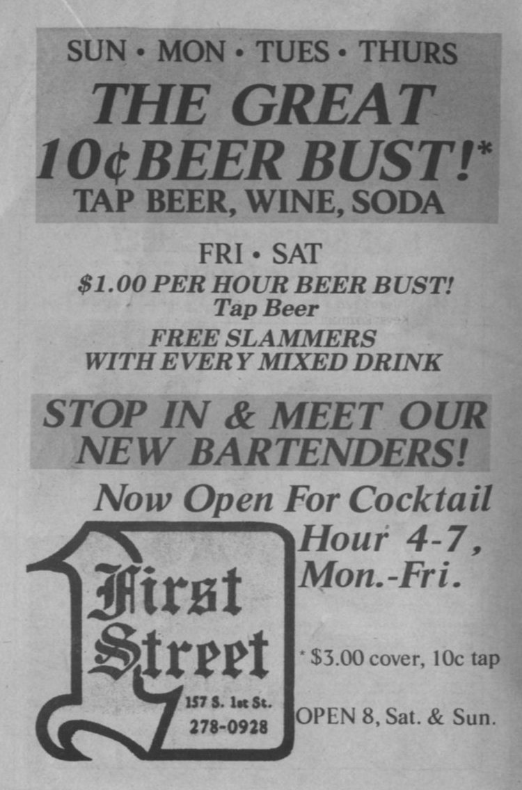Ad: 1st Street Tavern, 10 cent beer bust