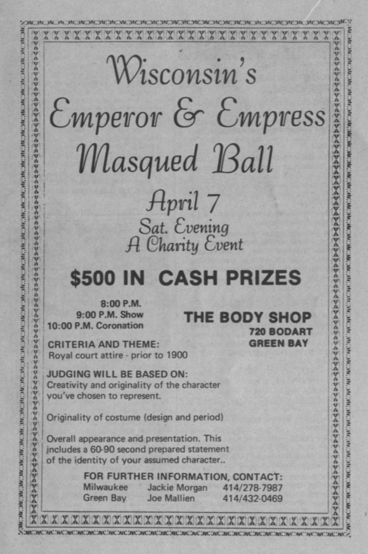 Ad: Wisconsin Emperor & Empress Masqued Ball, at the Body Shop in Green Bay