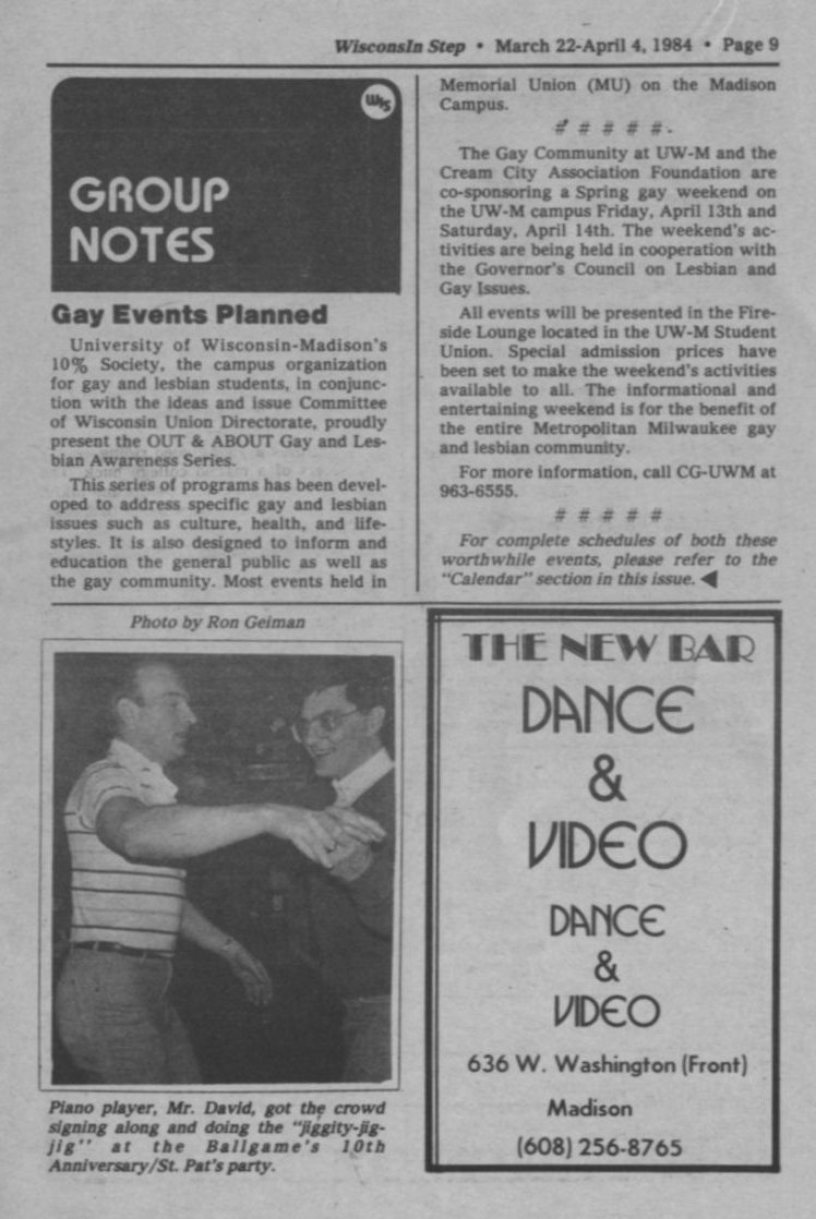 Group Notes: UW-Madison's 10% Society presenting Out & About gay/ lesbian awareness series;