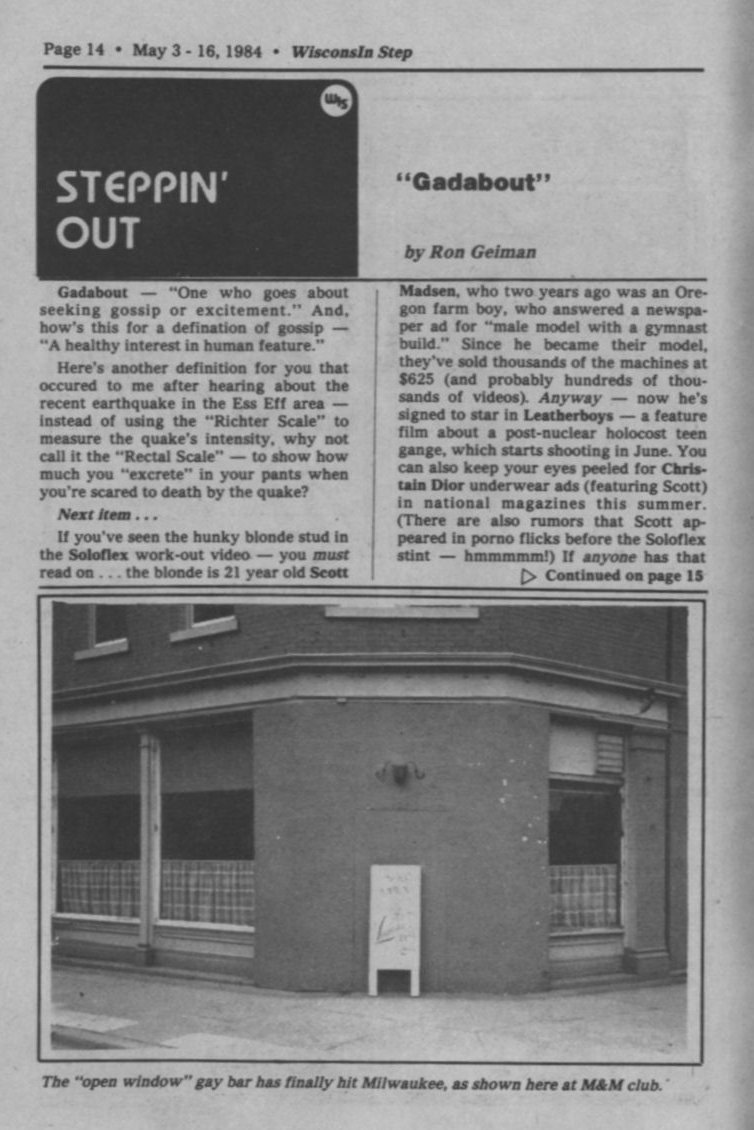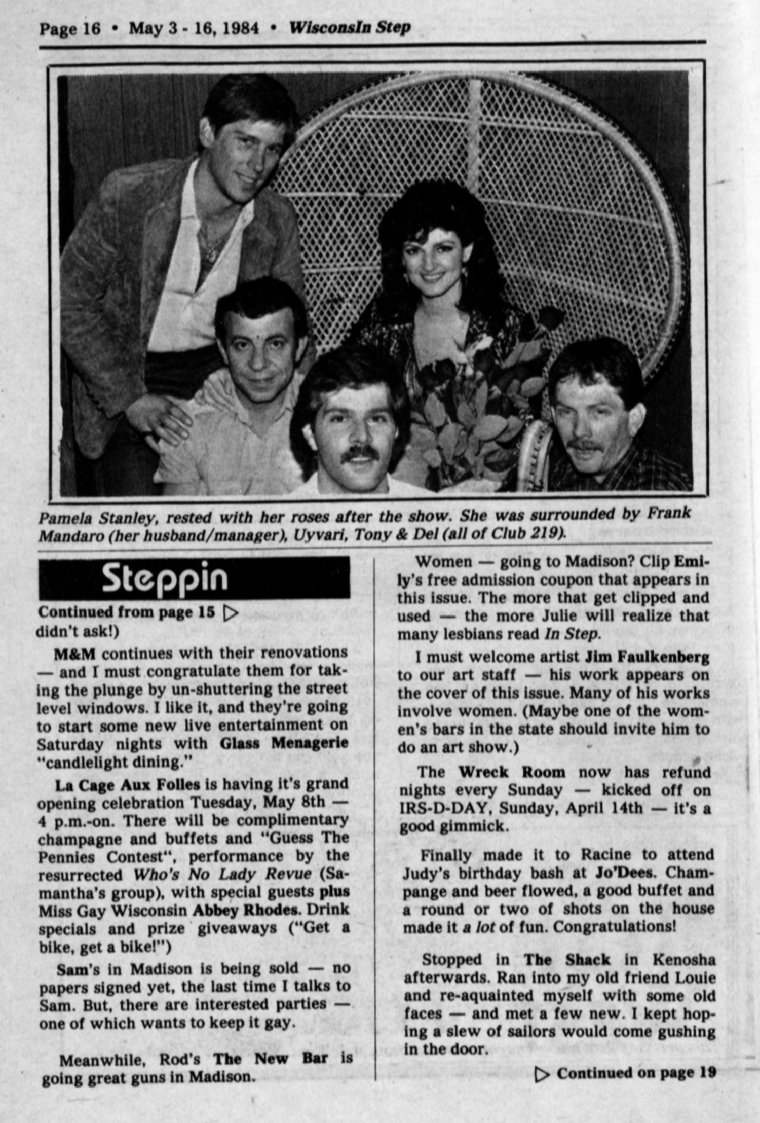 Steppin' Out, cont.: M+M renovations and opens up windows; La Cage grand opening; Sam's in Madison being sold; New Bar in Madison; Emily's in Madison, the Shack in Kenosha, Wreck Room and Jodees;